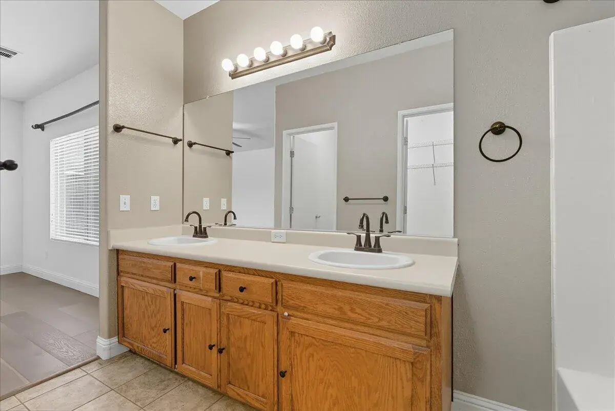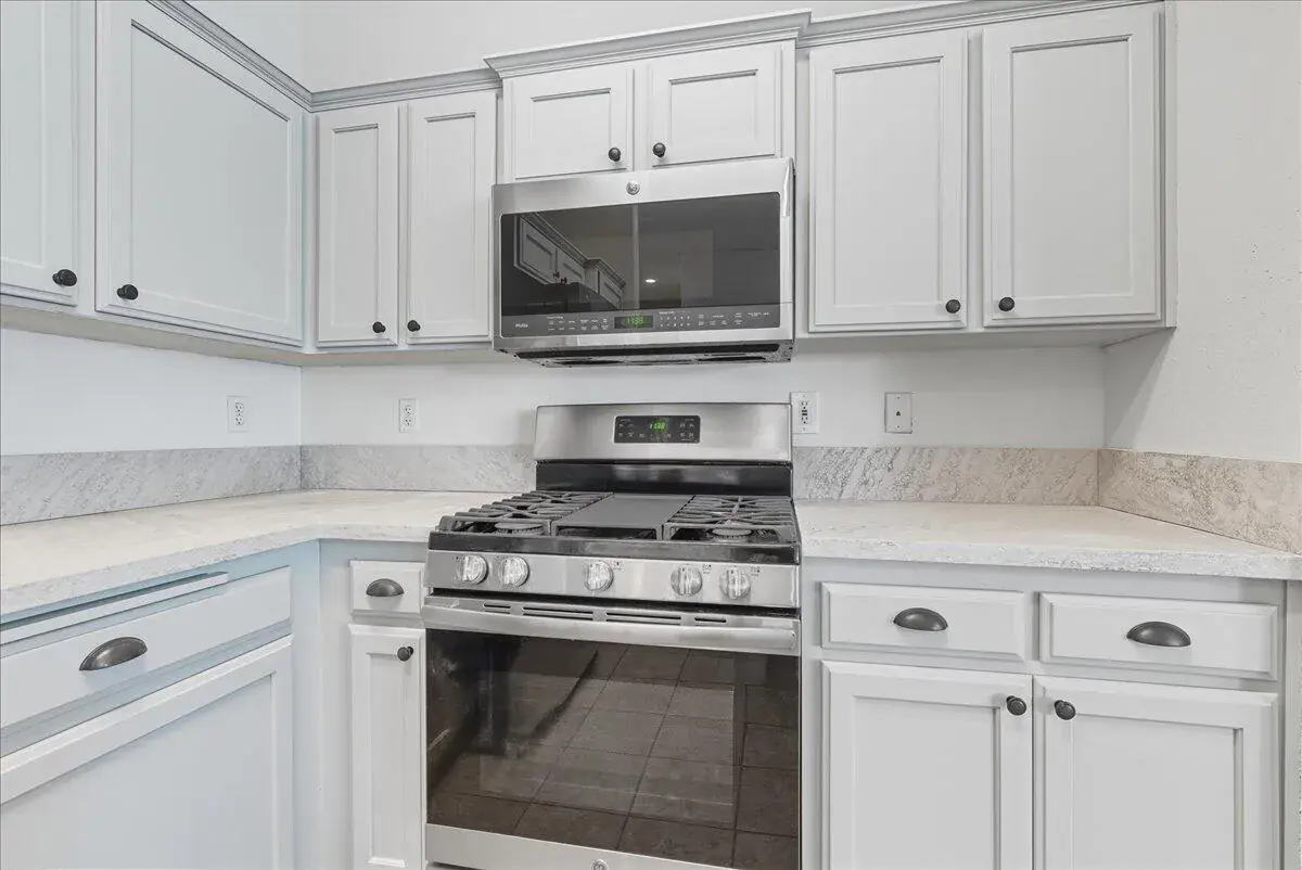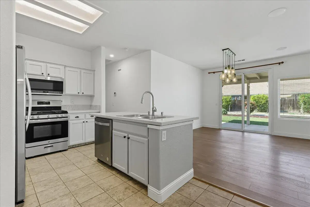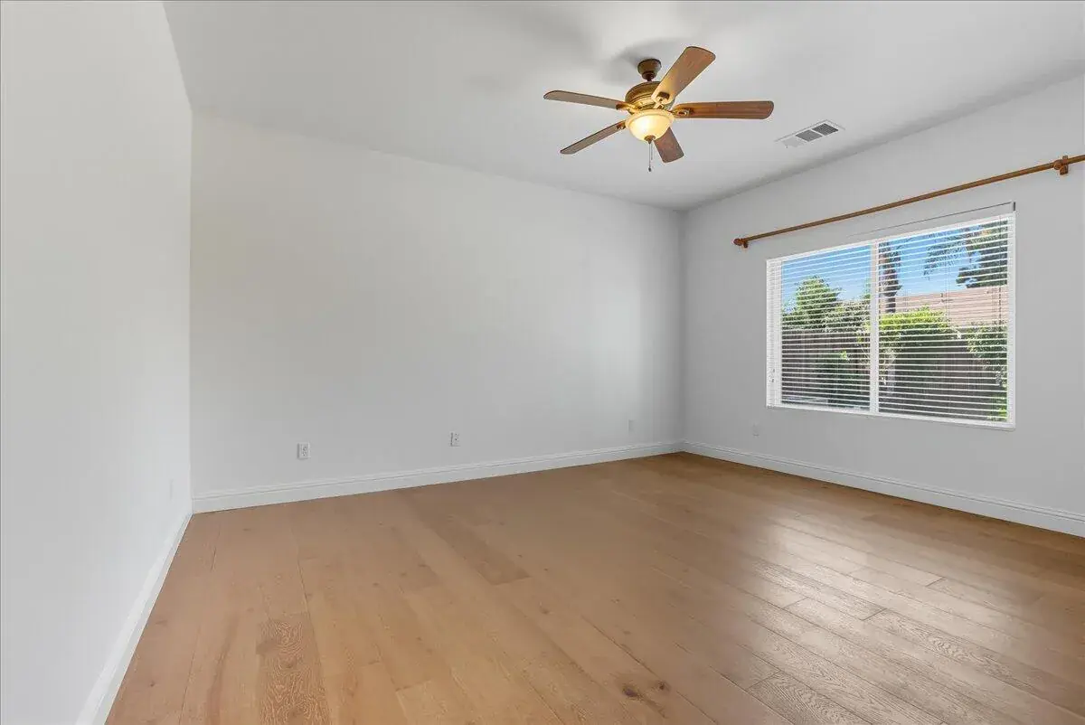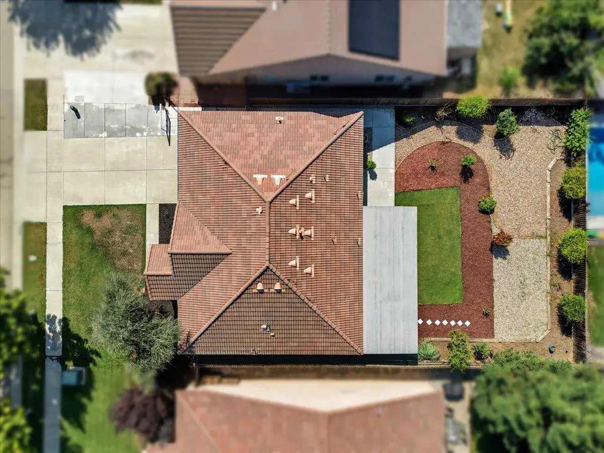 The spacious primary suite is a true retreat with a large walk-in closet, sunken tub, and dual sinks. Outdoors, enjoy a newly landscaped backyard complete with peach, lemon, and almond trees, plus automatic sprinklers with a new timer box for easy maintenance. The finished garage offers built-in shelving for extra storage.