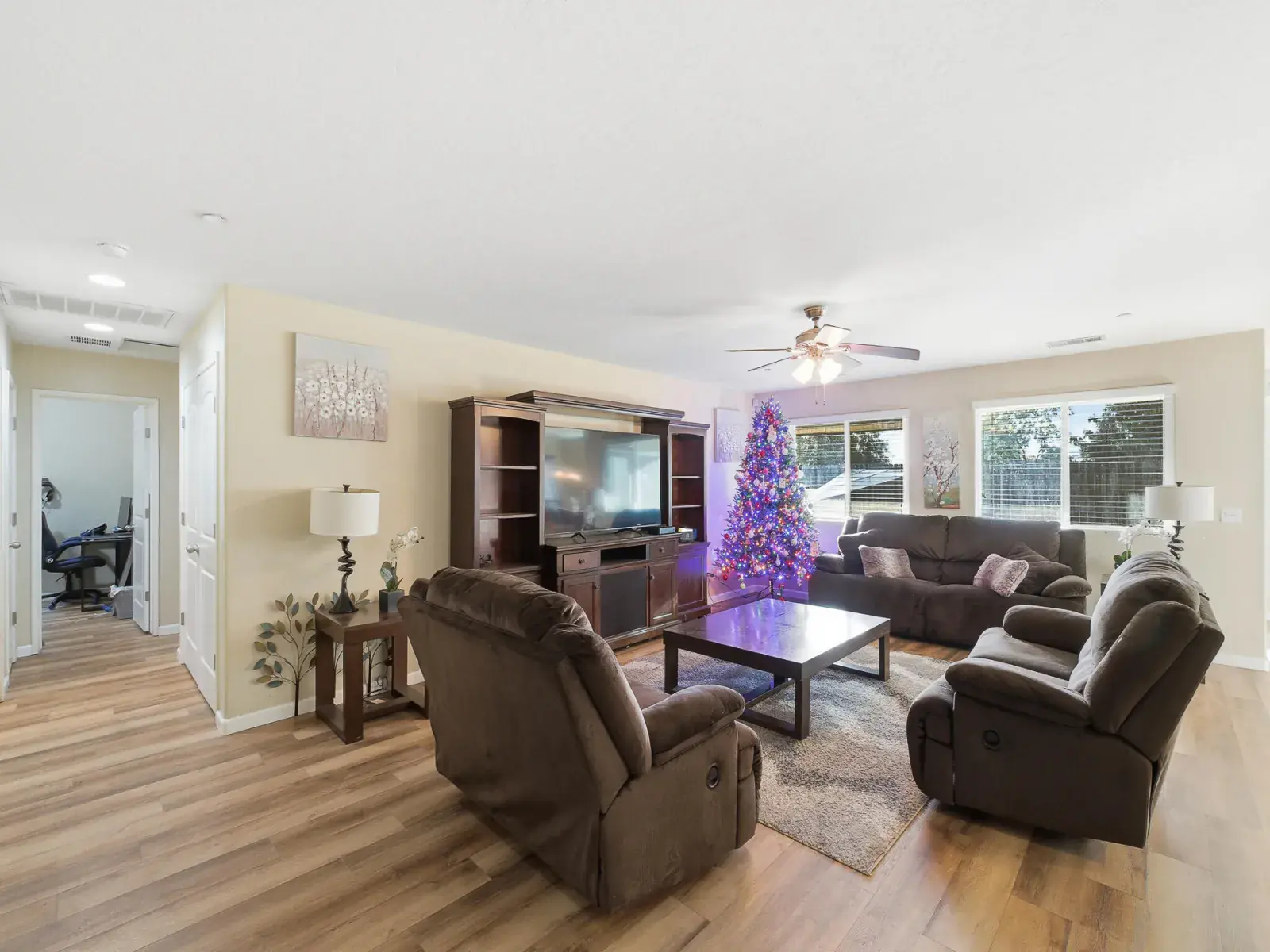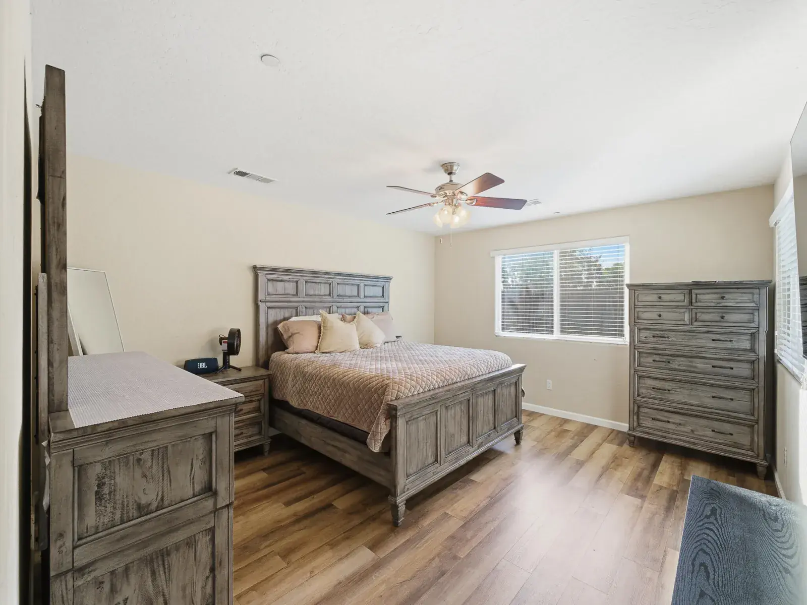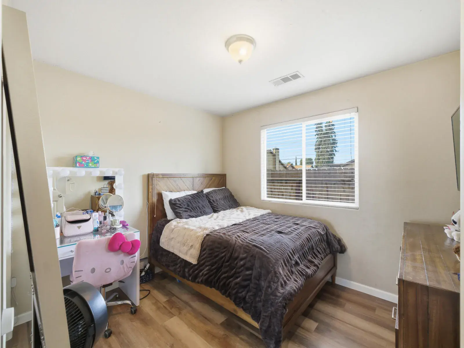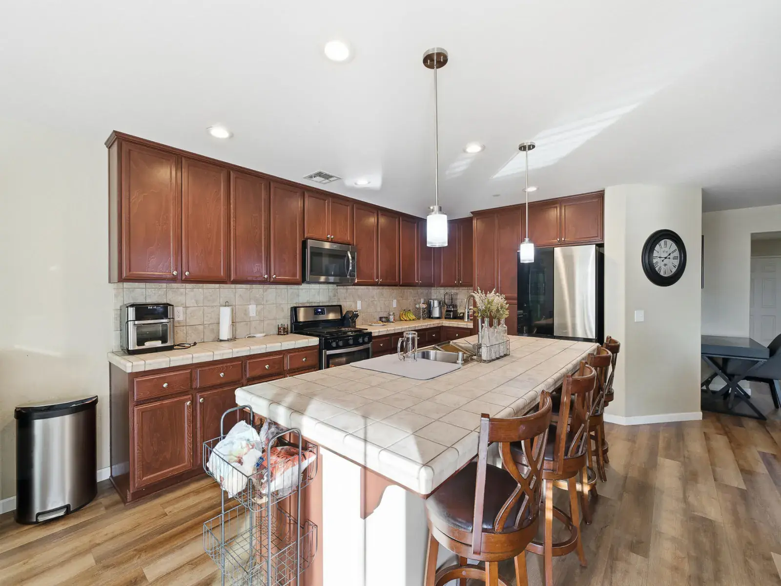 Welcome to this beautifully maintained 4 bedroom, 2.5 bath home offering a spacious, functional layout and standout outdoor living in a desirable Visalia neighborhood. The inviting entry opens to an open concept living space filled with natural light and finished with durable wood look flooring that flows seamlessly into the kitchen and dining areas. The kitchen features a large center island with bar seating, stainless steel appliances, ample cabinetry, and direct access to the dining area and covered patio beyond. A convenient half bath is located just off the entry hallway, ideal for guests, while the bedroom wing provides privacy and comfort throughout. The generous primary suite includes a dual sink vanity, soaking tub, separate walk in shower, and abundant storage, complemented by well sized secondary bedrooms and an indoor laundry room with cabinetry and garage access. Step outside to a private backyard retreat featuring a covered patio with ceiling fan, spa, and a sparkling in ground pool with waterfall feature, along with additional patio space and a gazebo area perfect for entertaining or relaxing year round. The home is complete with an attached garage, mature landscaping, and a clean, welcoming exterior, all conveniently located near parks, schools, and shopping, offering the perfect blend of comfort, function, and Central Valley lifestyle.