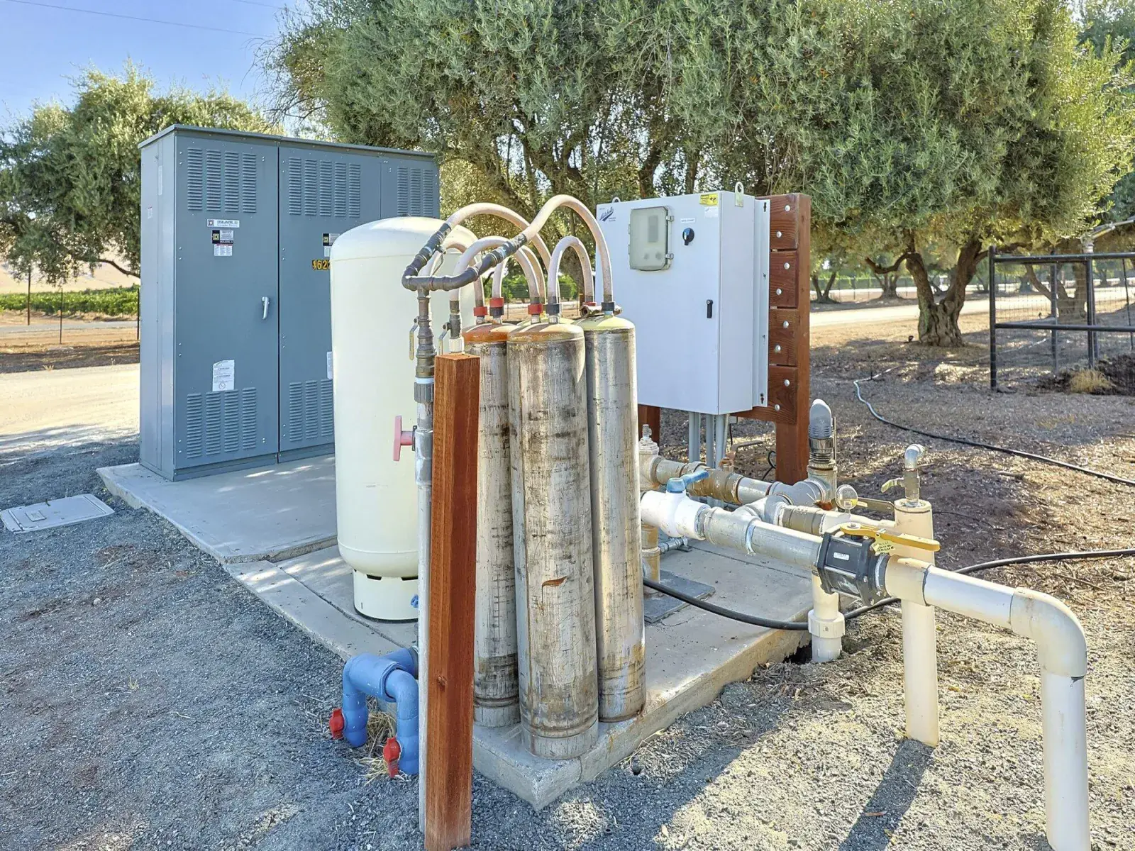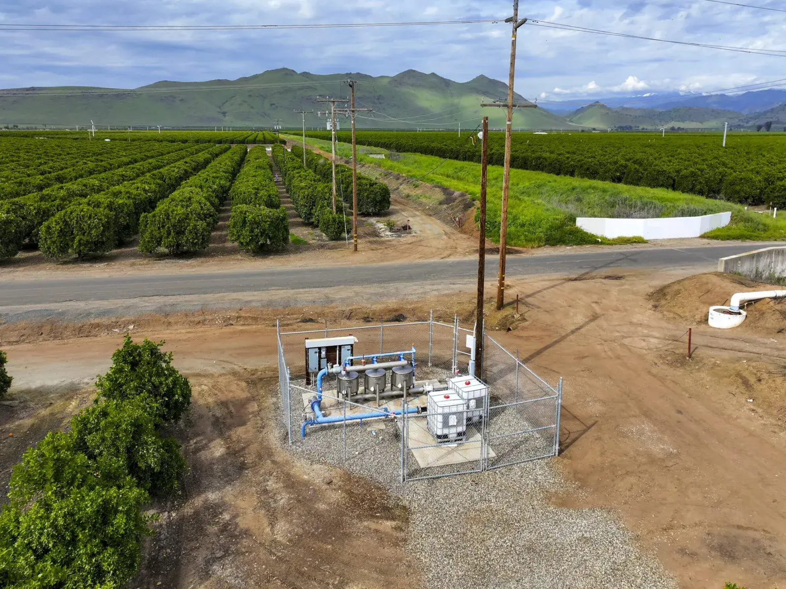 East Well: A pump and filtration system for irrigating citrus trees via micro-sprinklers.