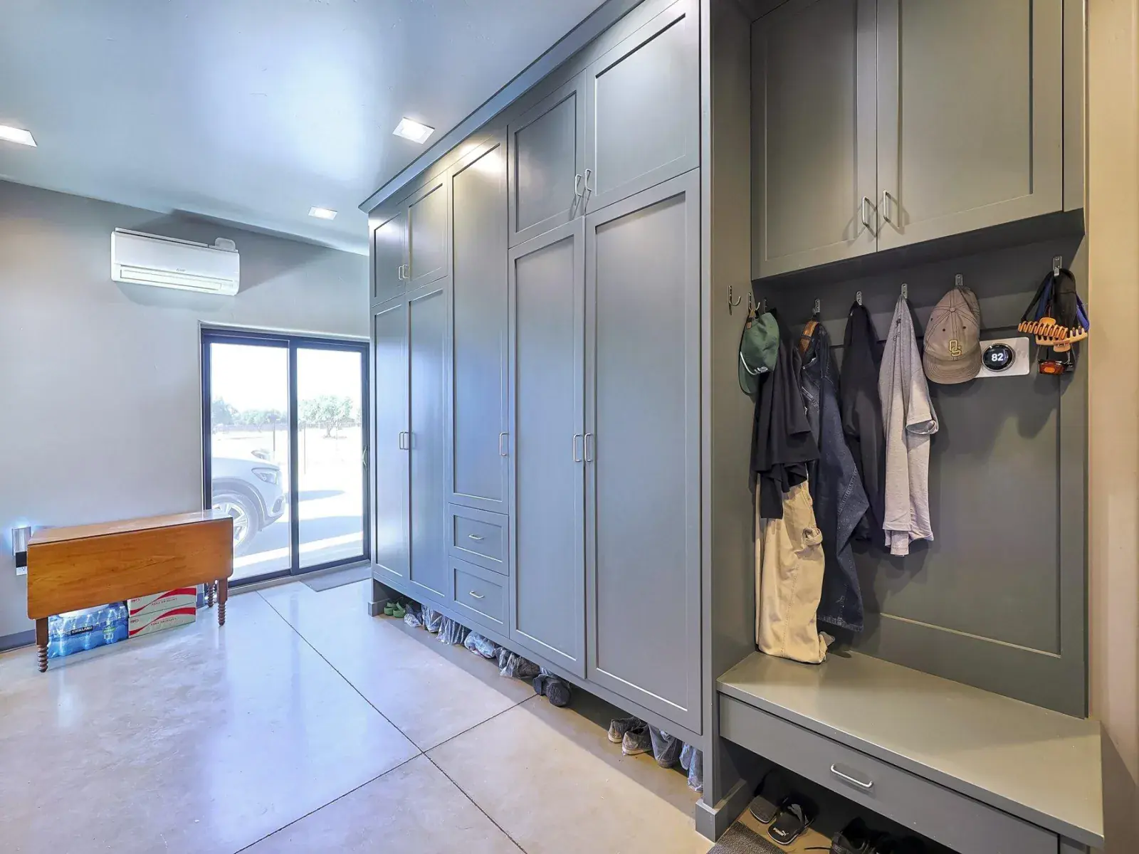 The first floor consists of an office, half-bathroom, laundry, mudroom and kitchen storage, refrigerator and microwave spaces, a feed and tack room and three commercial roll up doors.