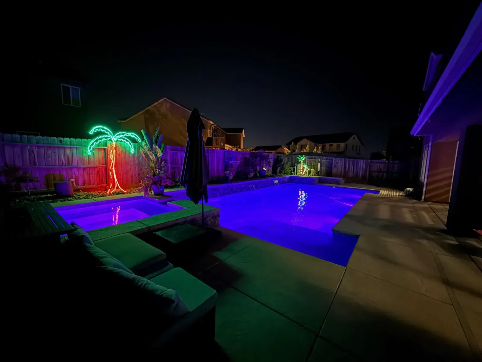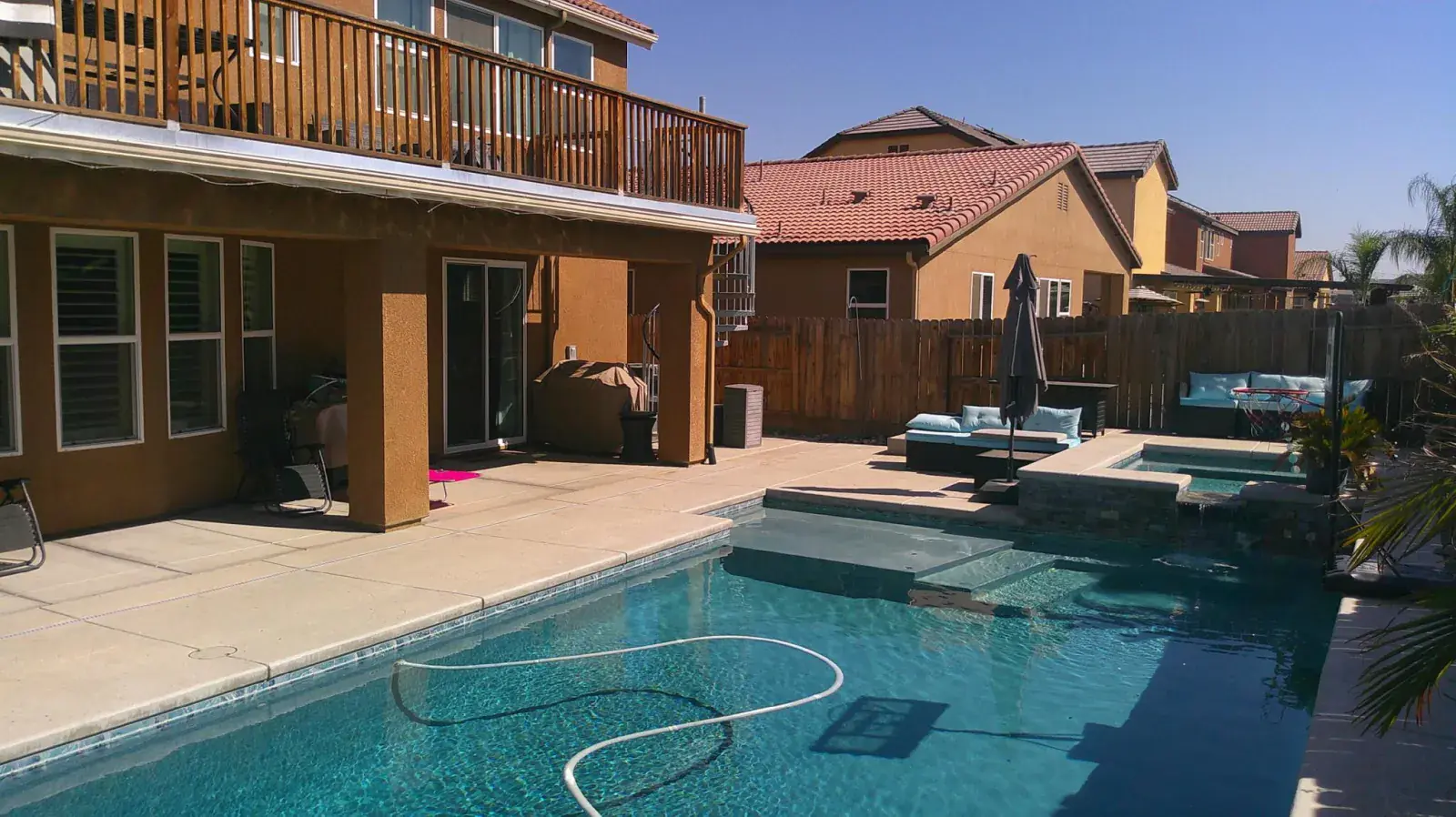 Enjoy resort-style living in your private backyard—complete with a sparkling pool and spa featuring custom lighting and water features, plus a covered patio ideal for BBQs. A front courtyard with custom seating and an upstairs balcony with beautiful views provide even more spaces to relax and unwind.