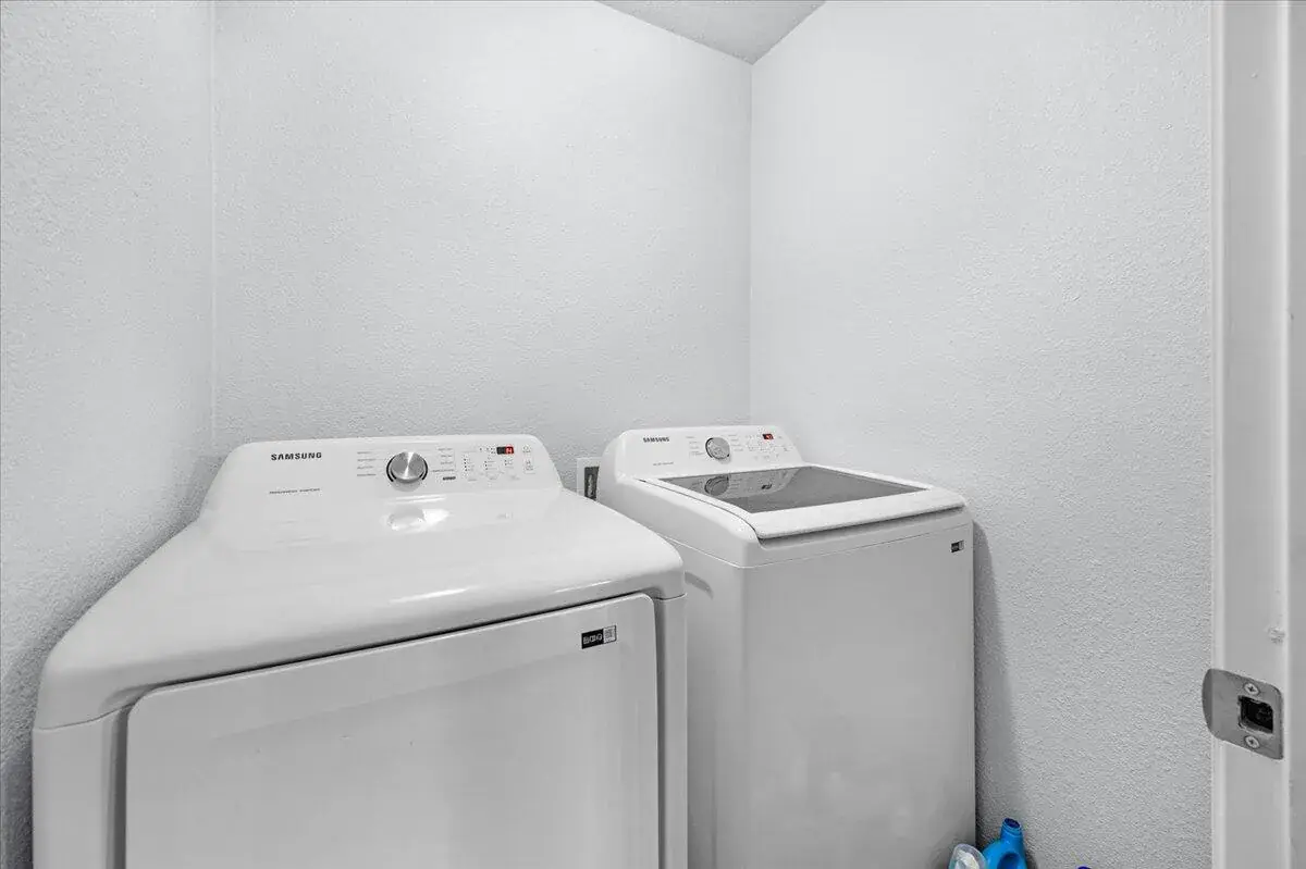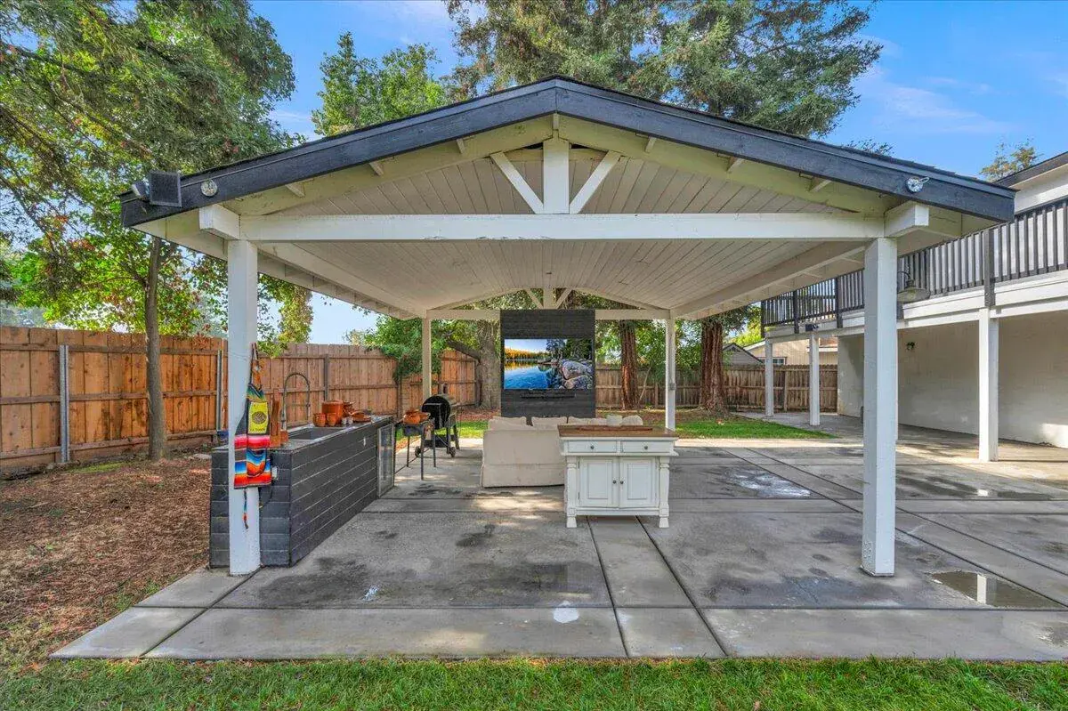 Outside, enjoy your own backyard oasis complete with a custom covered patio pavilion — ideal for BBQs, movie nights, or simply relaxing under the shade of mature trees. The exterior shines with modern farmhouse curb appeal, featuring a white stucco finish, dark accents, and a stunning patterned driveway that makes a statement from the street.