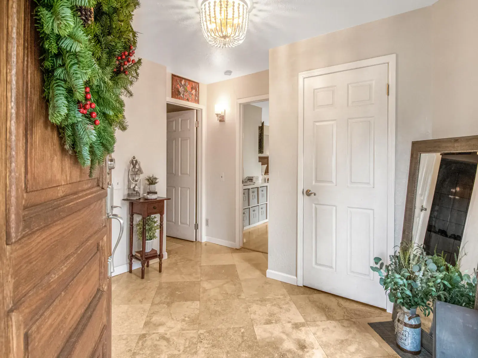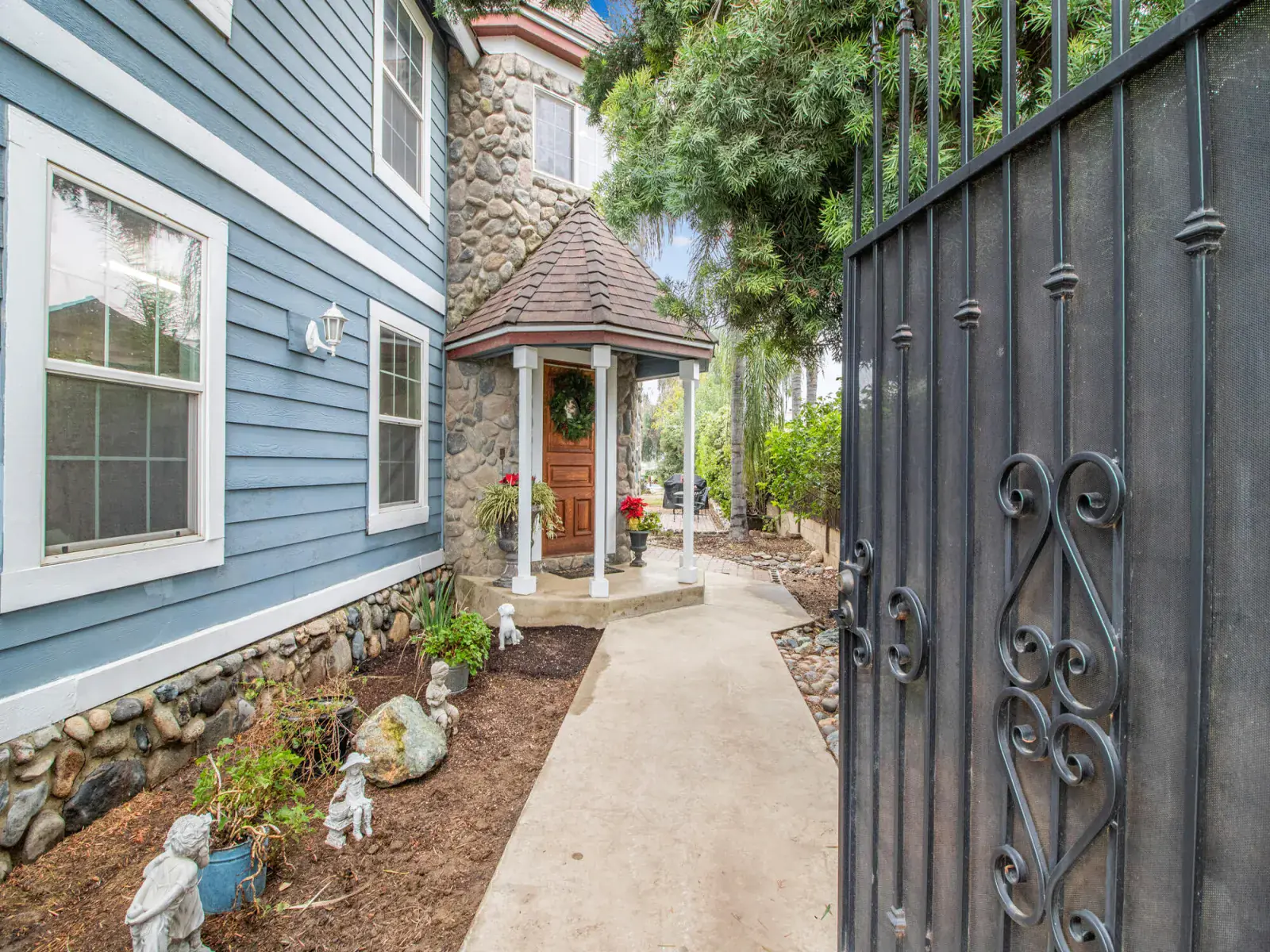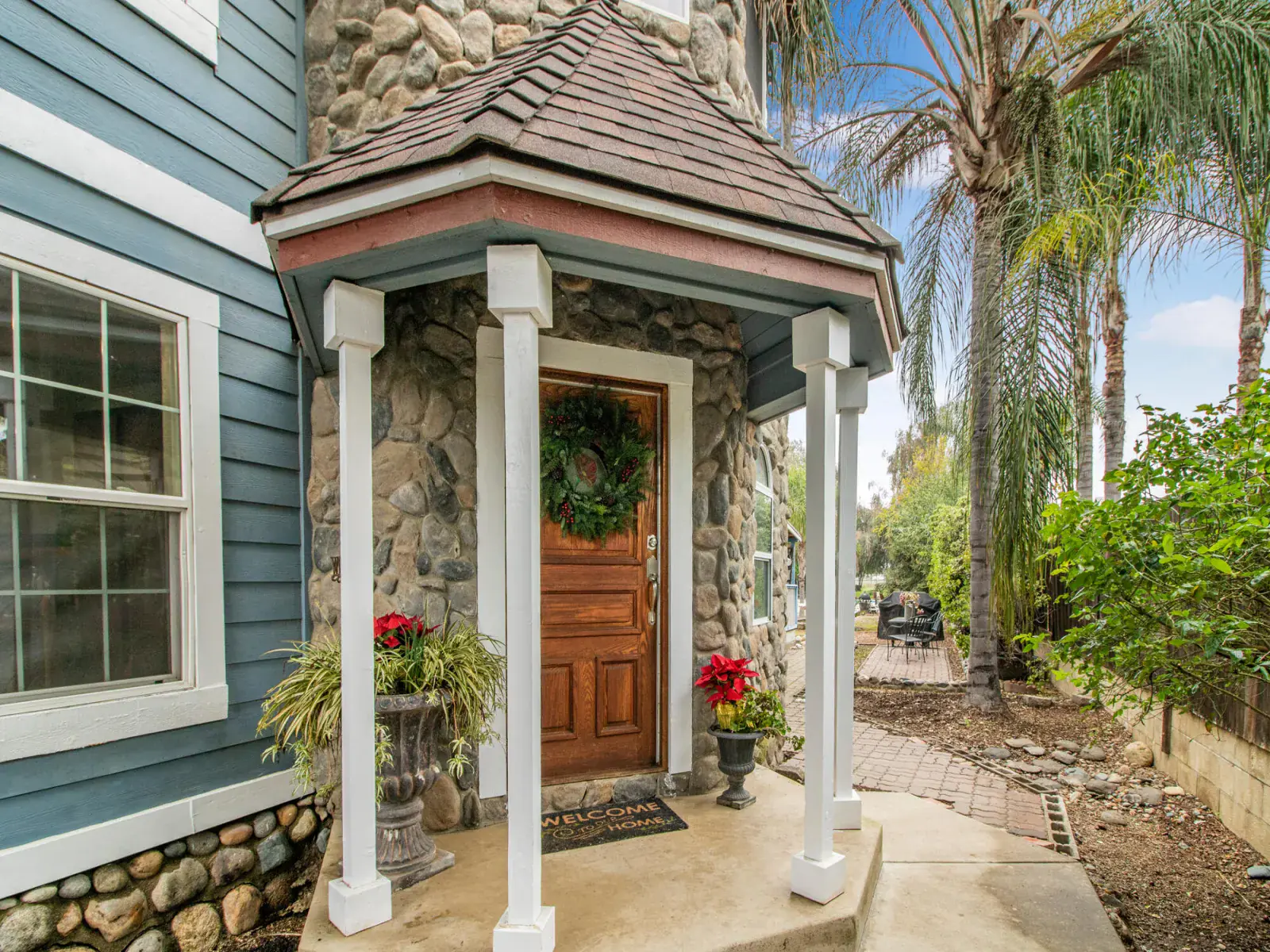 The updated kitchen offers granite countertops, stainless steel appliances, and abundant storage. Soaring vaulted ceilings and a marble mantel enhance the elegant living room, which is complemented by a lovely veranda.