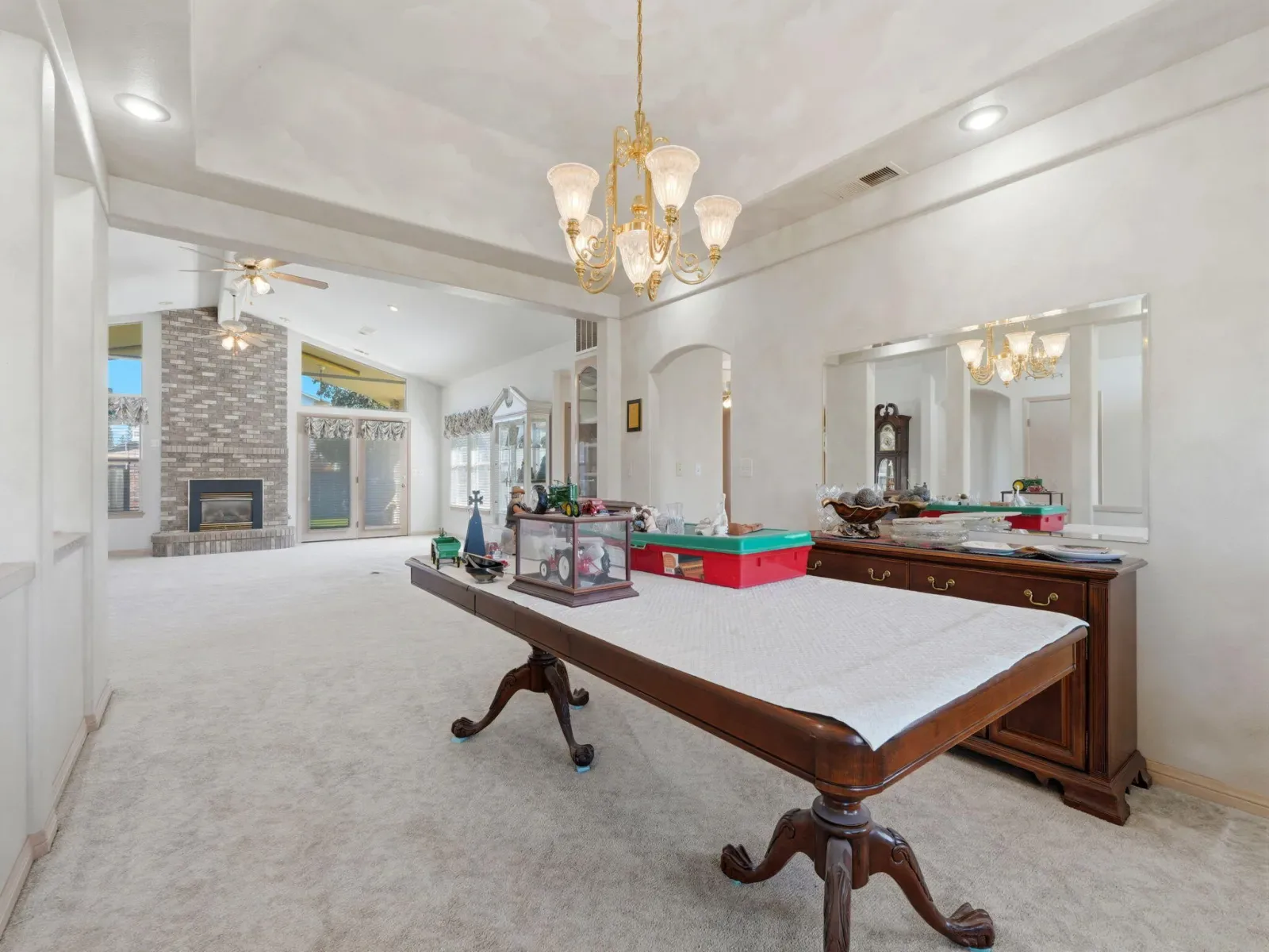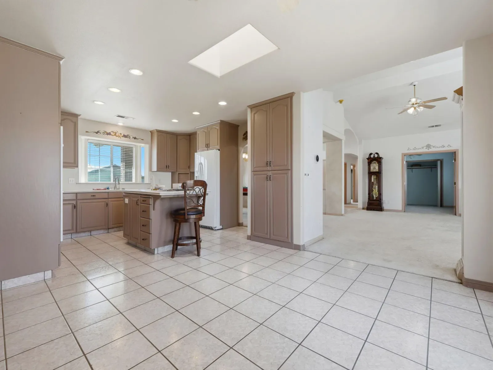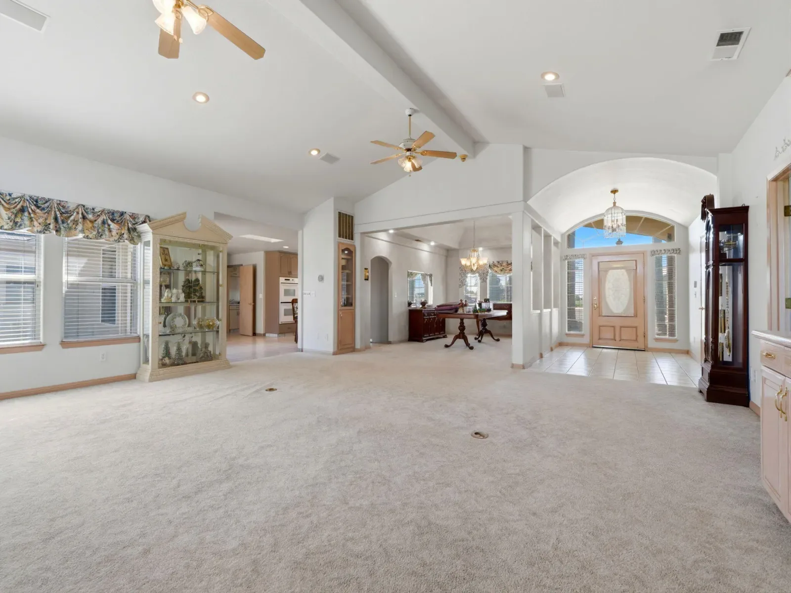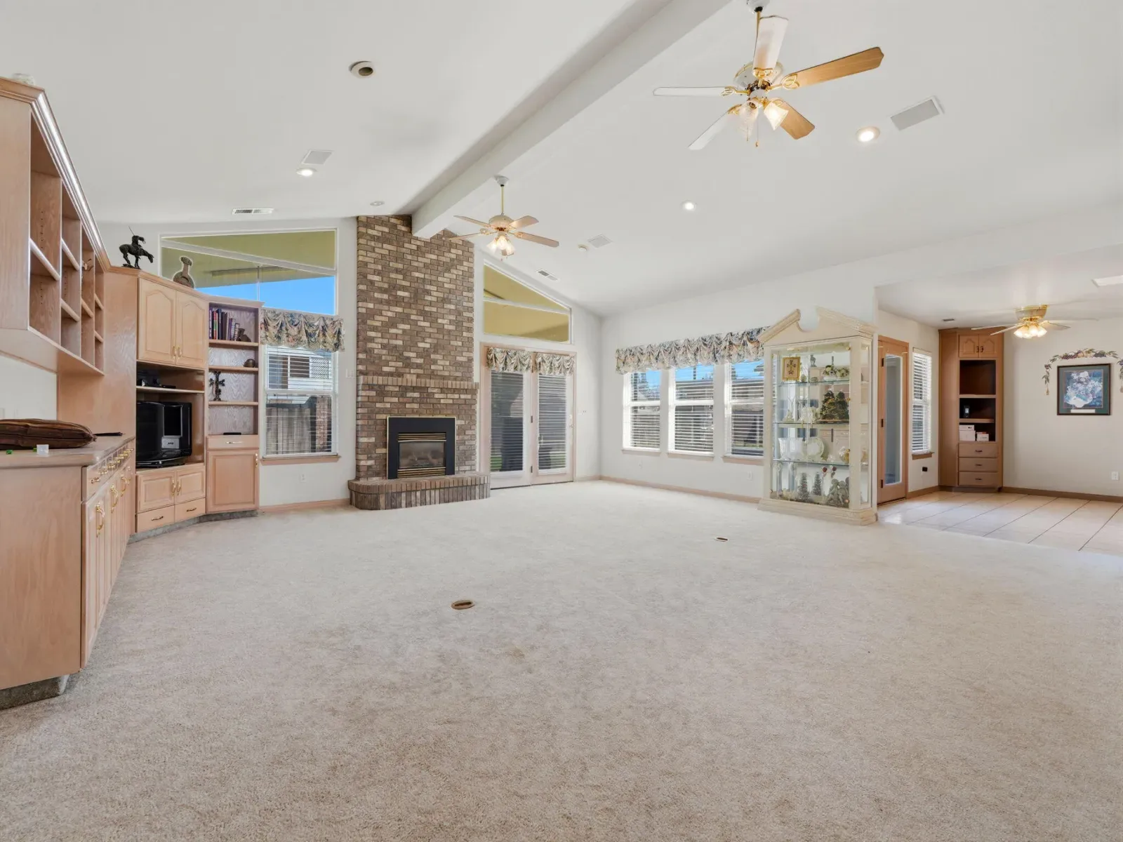 Beamed Ceilings, Bookcases, Breakfast Bar, Ceiling Fan(s), Central Vacuum, High Ceilings, Kitchen Island, Kitchen Open to Family Room, Open Floorplan, Pull Down Stairs to Attic, Recessed Lighting, Stone Counters, Tile Counters, Tray Ceiling(s), Vaulted Ceiling(s)