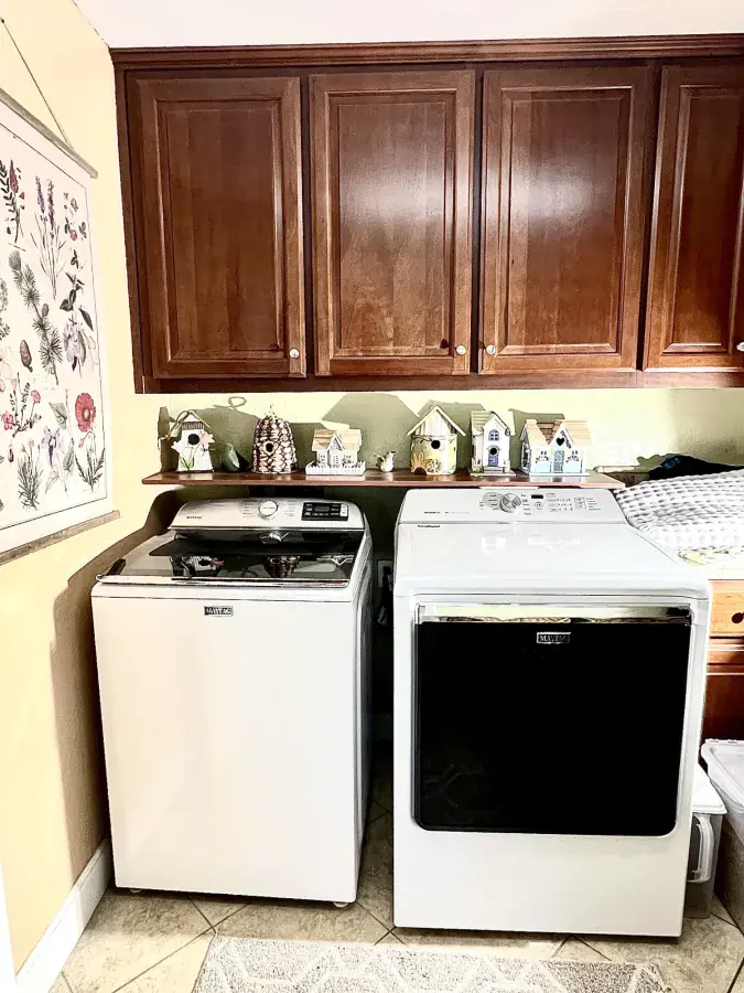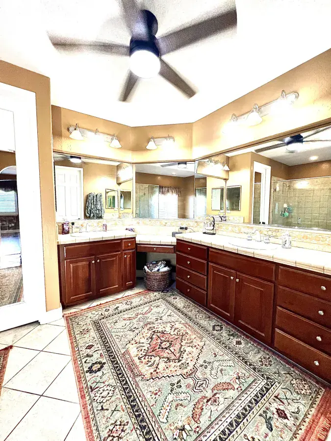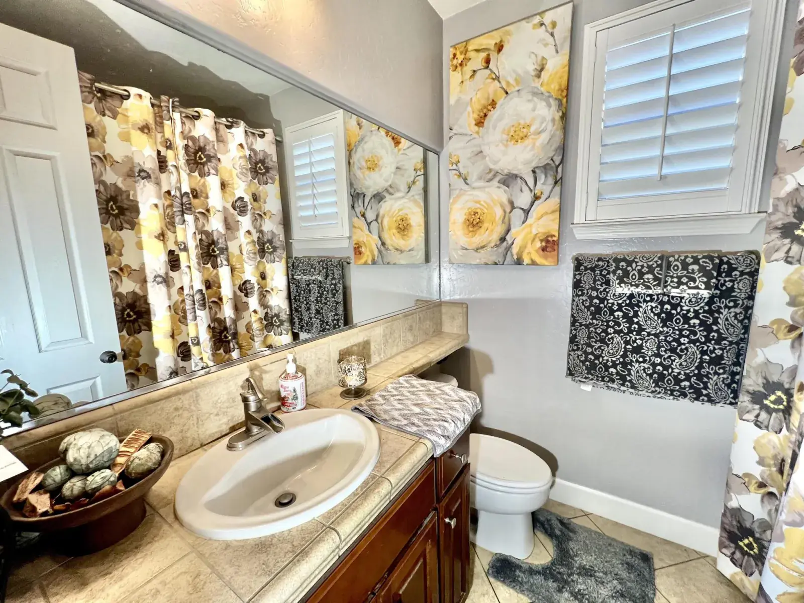 The main level also includes a guest bathroom, a private bedroom, and a dedicated laundry room complete with sink and storage. Upstairs, a versatile loft offers flexibility for a home office, media retreat, or secondary lounge. The expansive primary suite serves as a true sanctuary, featuring dual vanities, a dedicated makeup station, a walk-in shower, soaking tub, and an oversized walk-in closet.