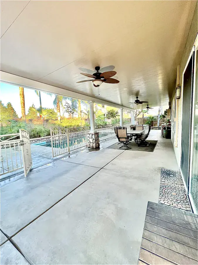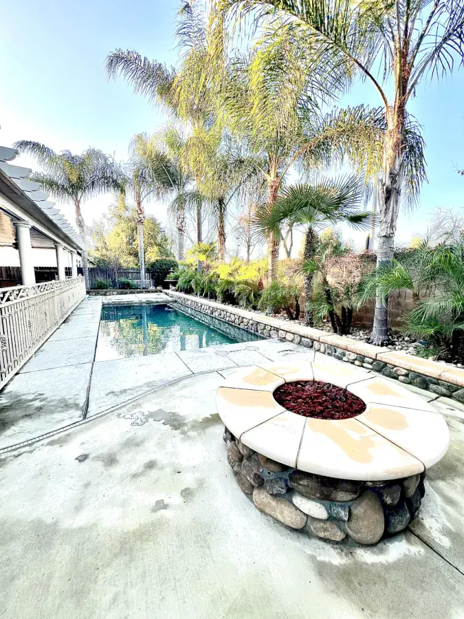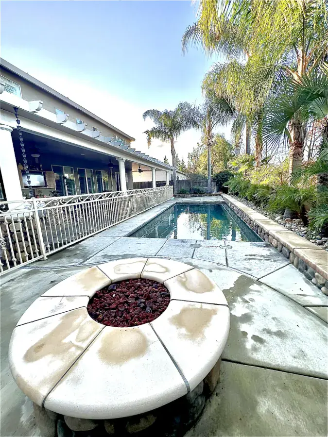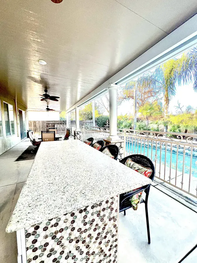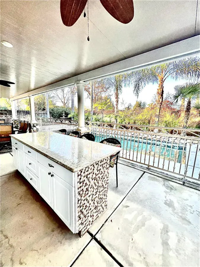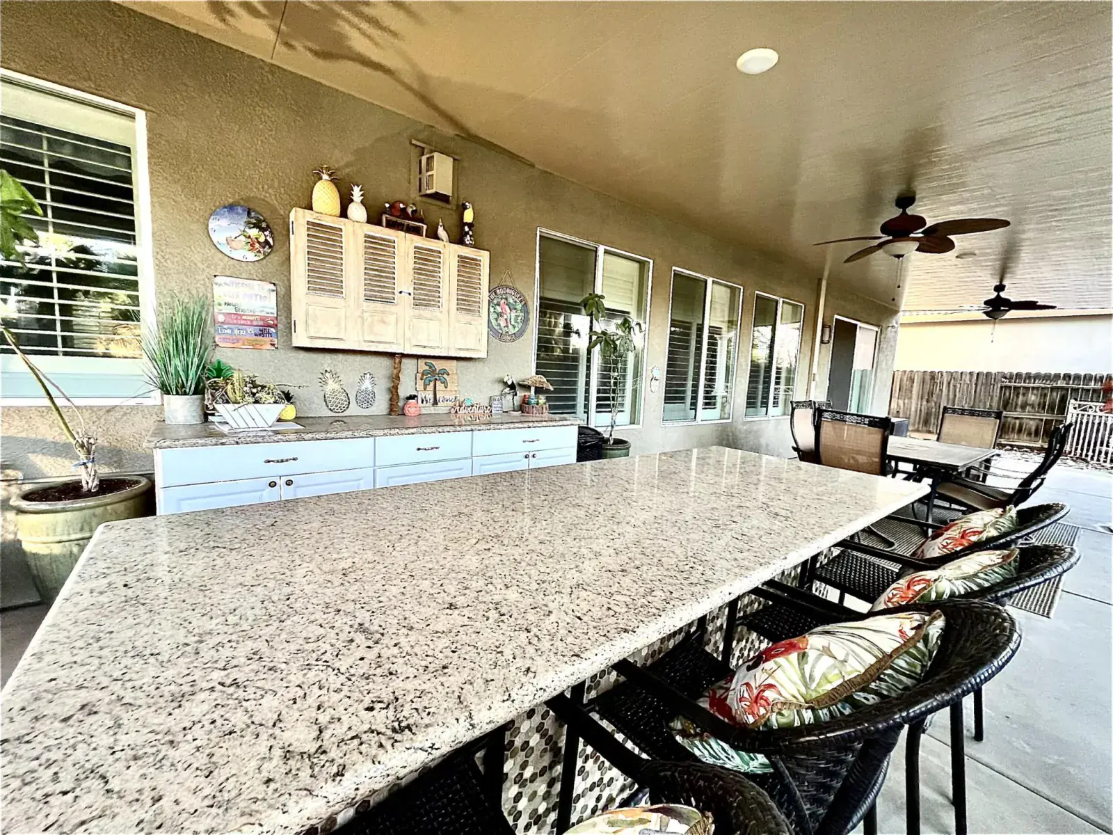 Designed for elevated outdoor living, the backyard is a private retreat centered around a fully fenced pebble-finish pool, complemented by a fire pit and an expansive covered patio with ceiling fans. An outdoor island with bar seating creates a natural extension of the home—perfect for alfresco dining and refined entertaining.