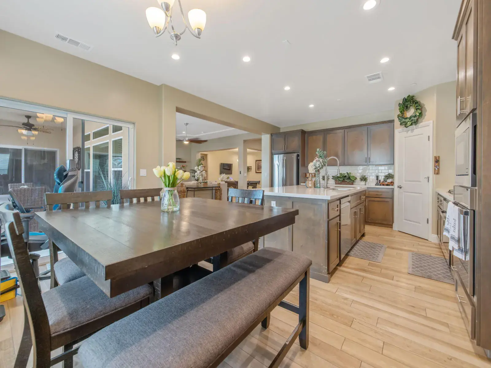 Ceiling Fan(s), His and Hers Closets, Kitchen Island, Kitchen Open to Family Room, Open Floorplan, Pantry, Recessed Lighting, Stone Counters, Tile Counters
