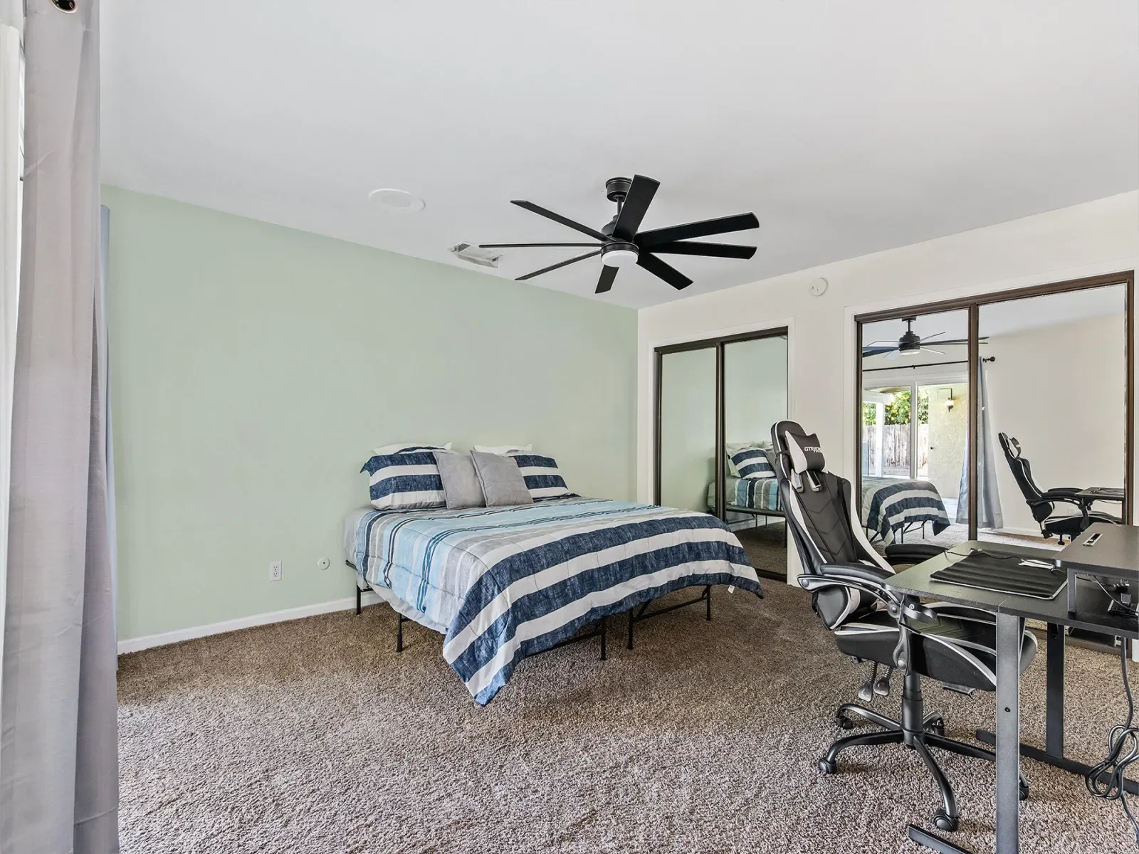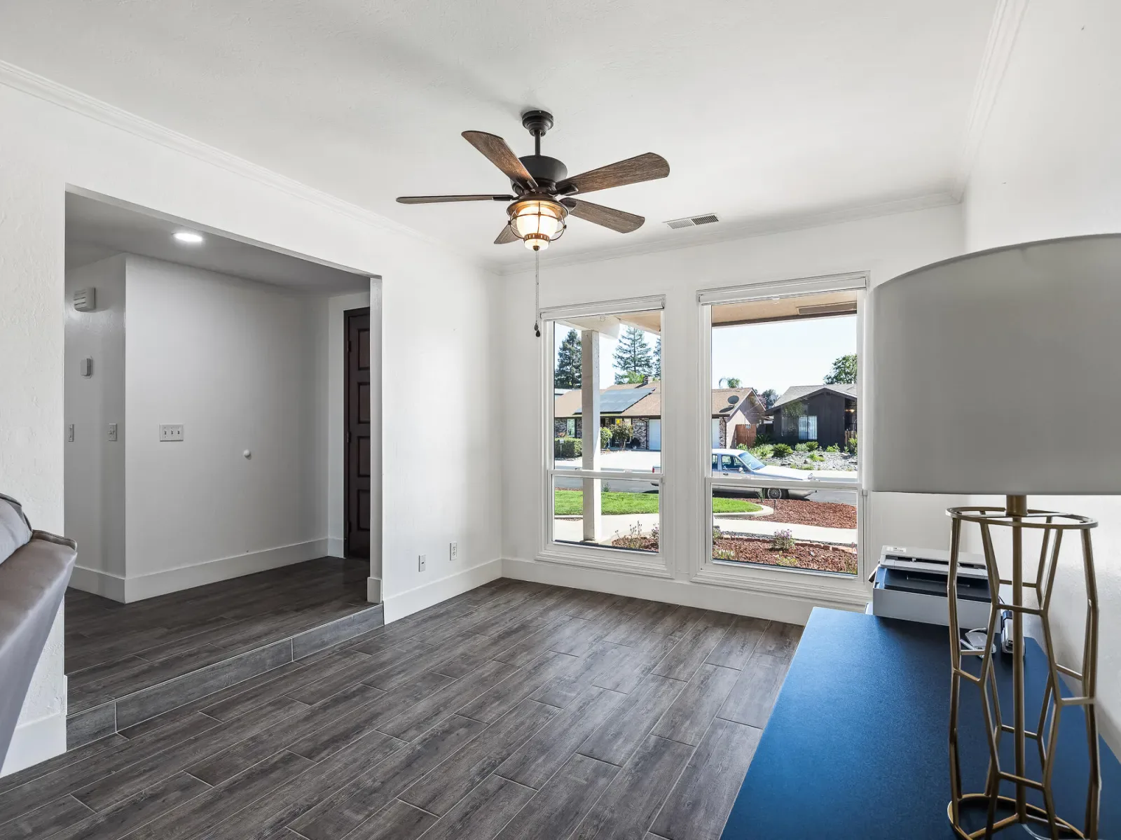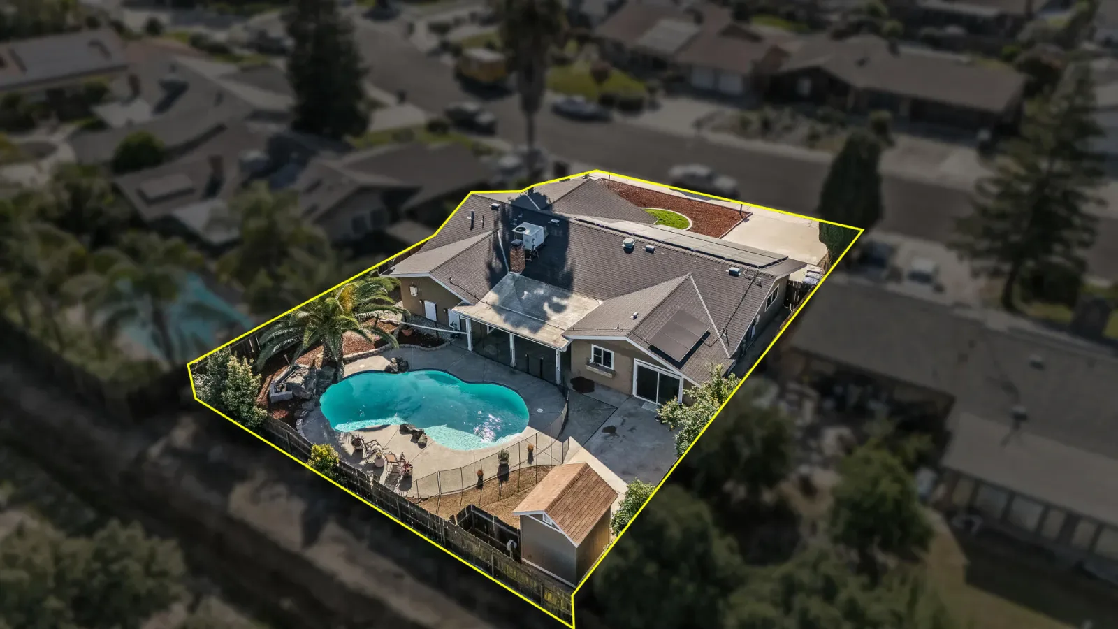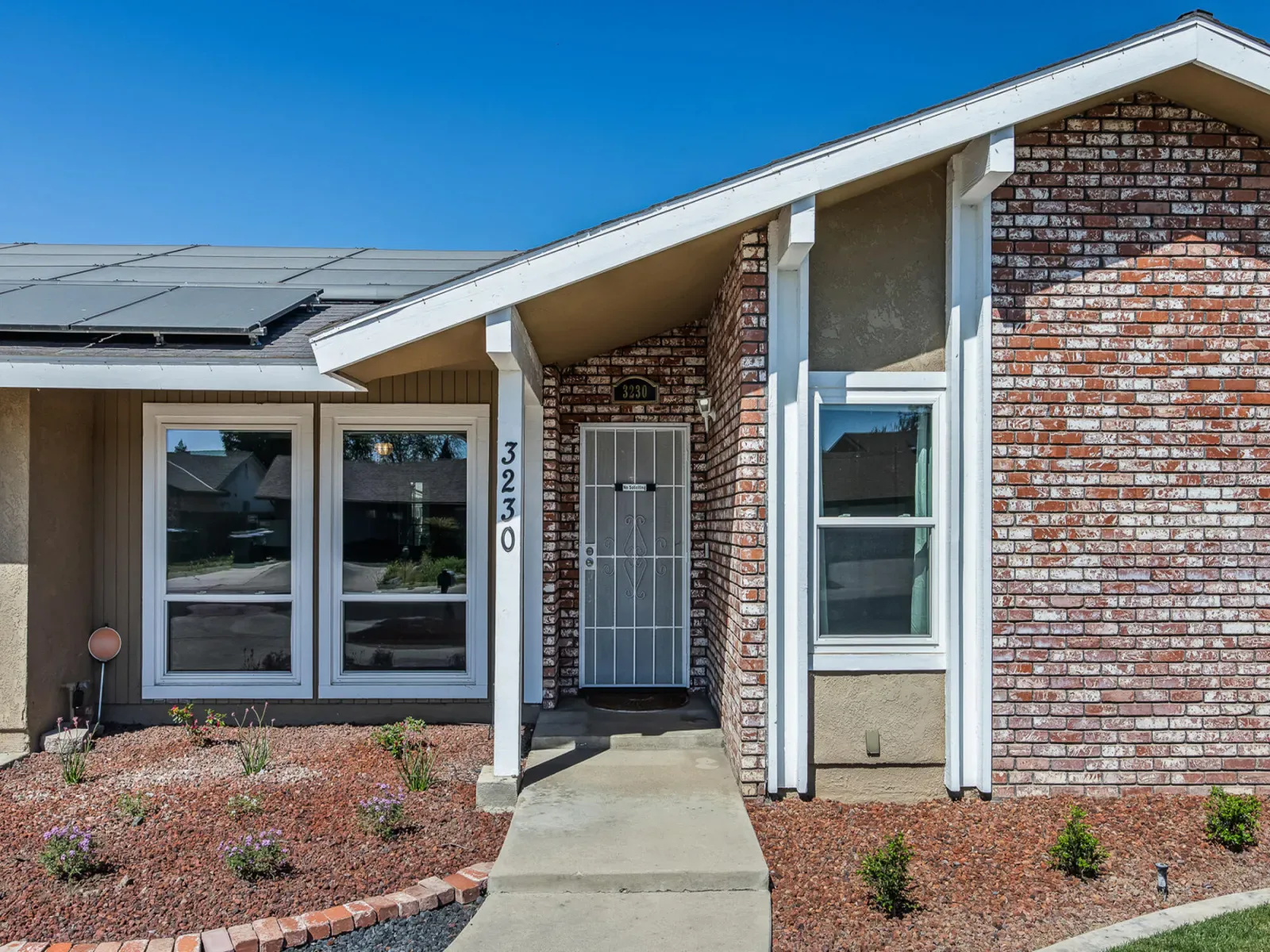 Fall in love the moment you arrive! This stunning 3 bedroom, 2 bathroom home in desirable Visalia with incredible curb appeal. Step inside to an open, light-filled floor plan with large windows, vaulted ceilings, beautiful wood beams, wood like tile, and a cozy brick fireplace that anchors the spacious living room. The kitchen features stainless steel appliances, double ovens, and plenty of cabinet space, plus a formal dining area for gatherings. Just off the kitchen is a huge bonus flex room with a massive slider that opens to the backyard—perfect for entertaining or a game room. The spacious primary suite includes backyard access, mirrored closets, and a bath with dual sinks and an oversized counter. Step outside to your own tropical oasis featuring a large fenced pool with a rock waterfall, covered patio, storage shed, and plenty of space to relax or entertain. Additional highlights include solar, a whole house fan, and indoor laundry. This home truly has it all—don’t miss your chance to see it!