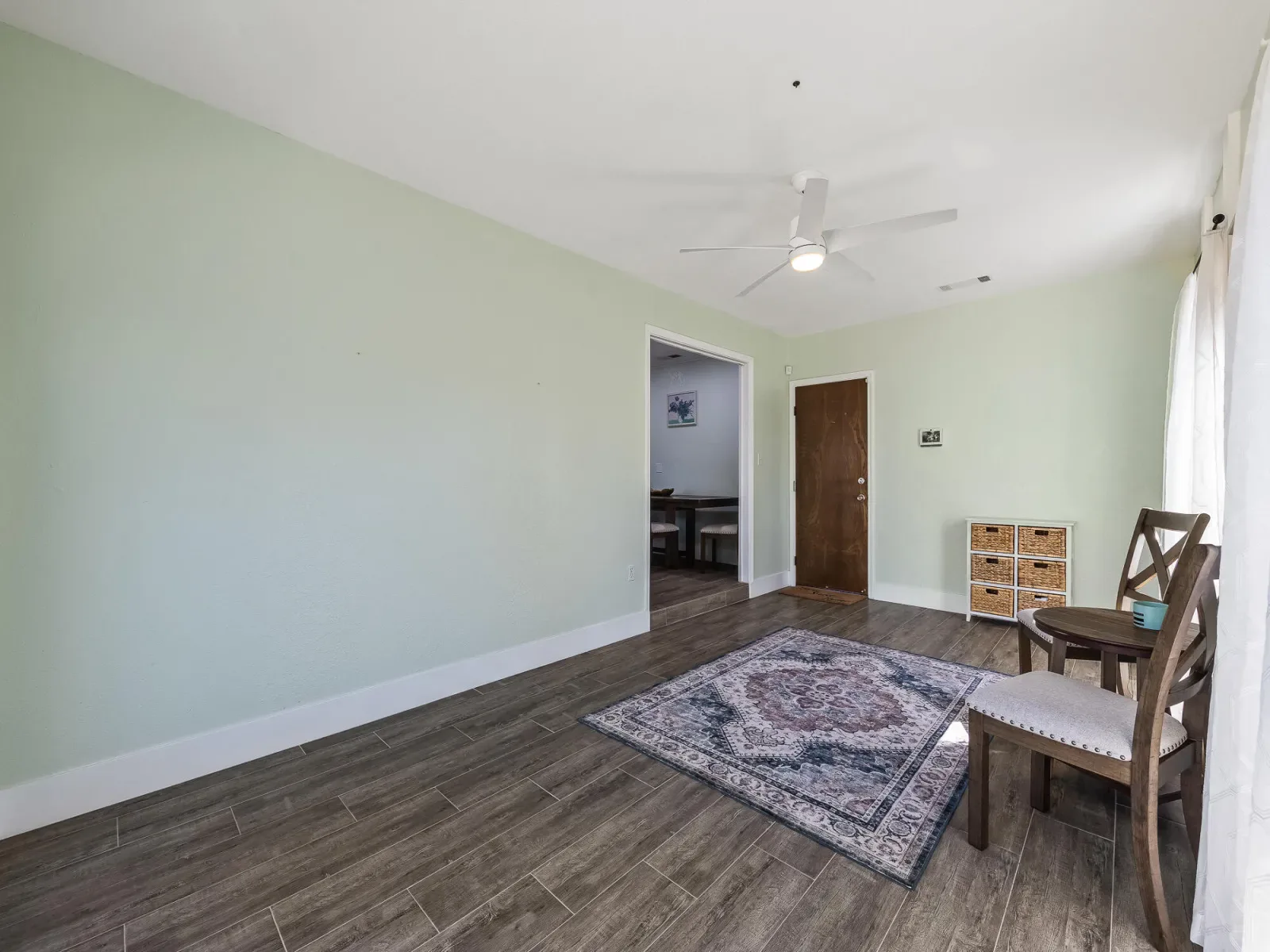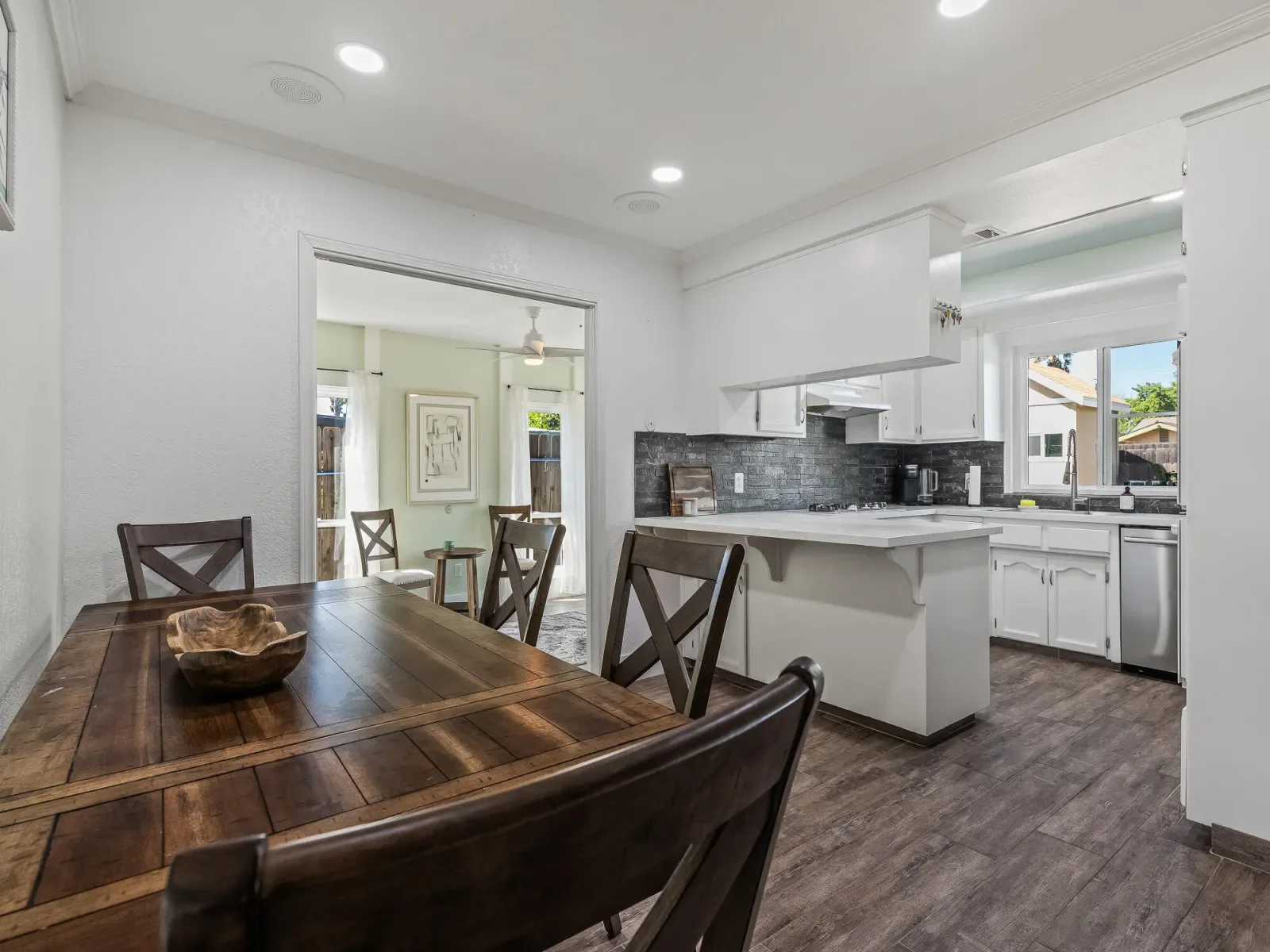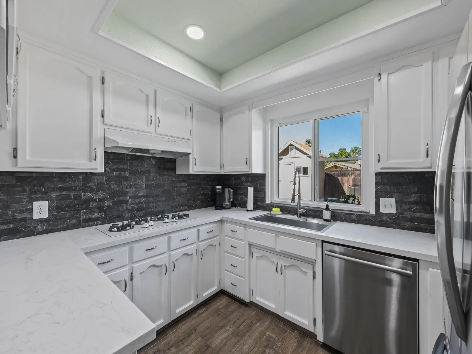 Fall in love the moment you arrive! This stunning 3 bedroom, 2 bathroom home in desirable Visalia with incredible curb appeal. Step inside to an open, light-filled floor plan with large windows, vaulted ceilings, beautiful wood beams, wood like tile, and a cozy brick fireplace that anchors the spacious living room. The kitchen features stainless steel appliances, double ovens, and plenty of cabinet space, plus a formal dining area for gatherings. Just off the kitchen is a huge bonus flex room with a massive slider that opens to the backyard—perfect for entertaining or a game room. The spacious primary suite includes backyard access, mirrored closets, and a bath with dual sinks and an oversized counter. Step outside to your own tropical oasis featuring a large fenced pool with a rock waterfall, covered patio, storage shed, and plenty of space to relax or entertain. Additional highlights include solar, a whole house fan, and indoor laundry. This home truly has it all—don’t miss your chance to see it!