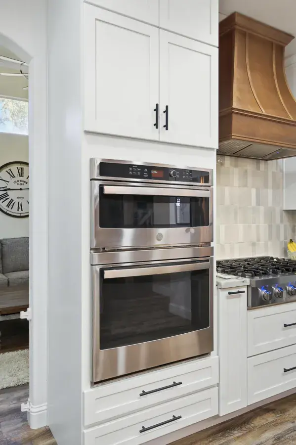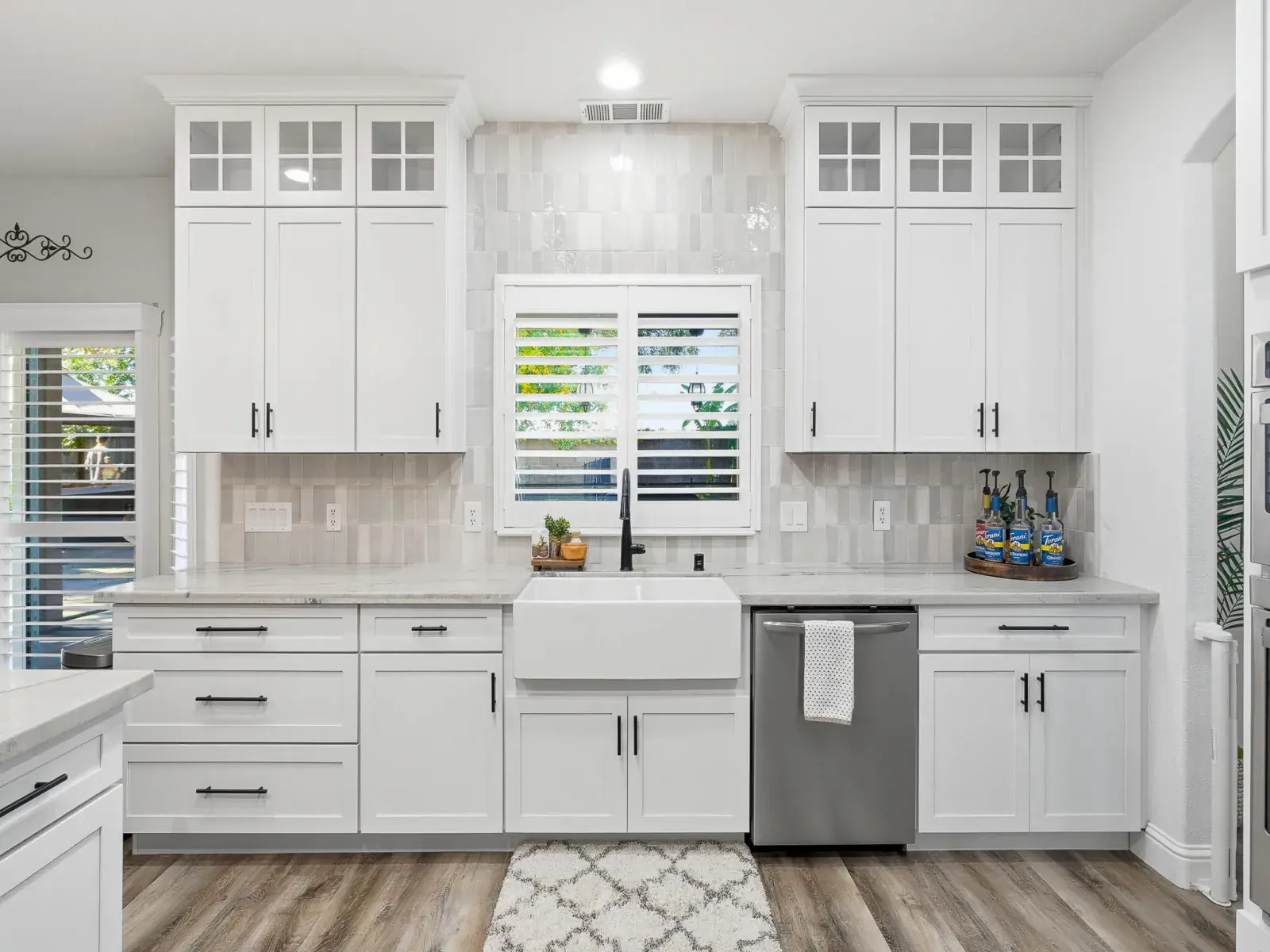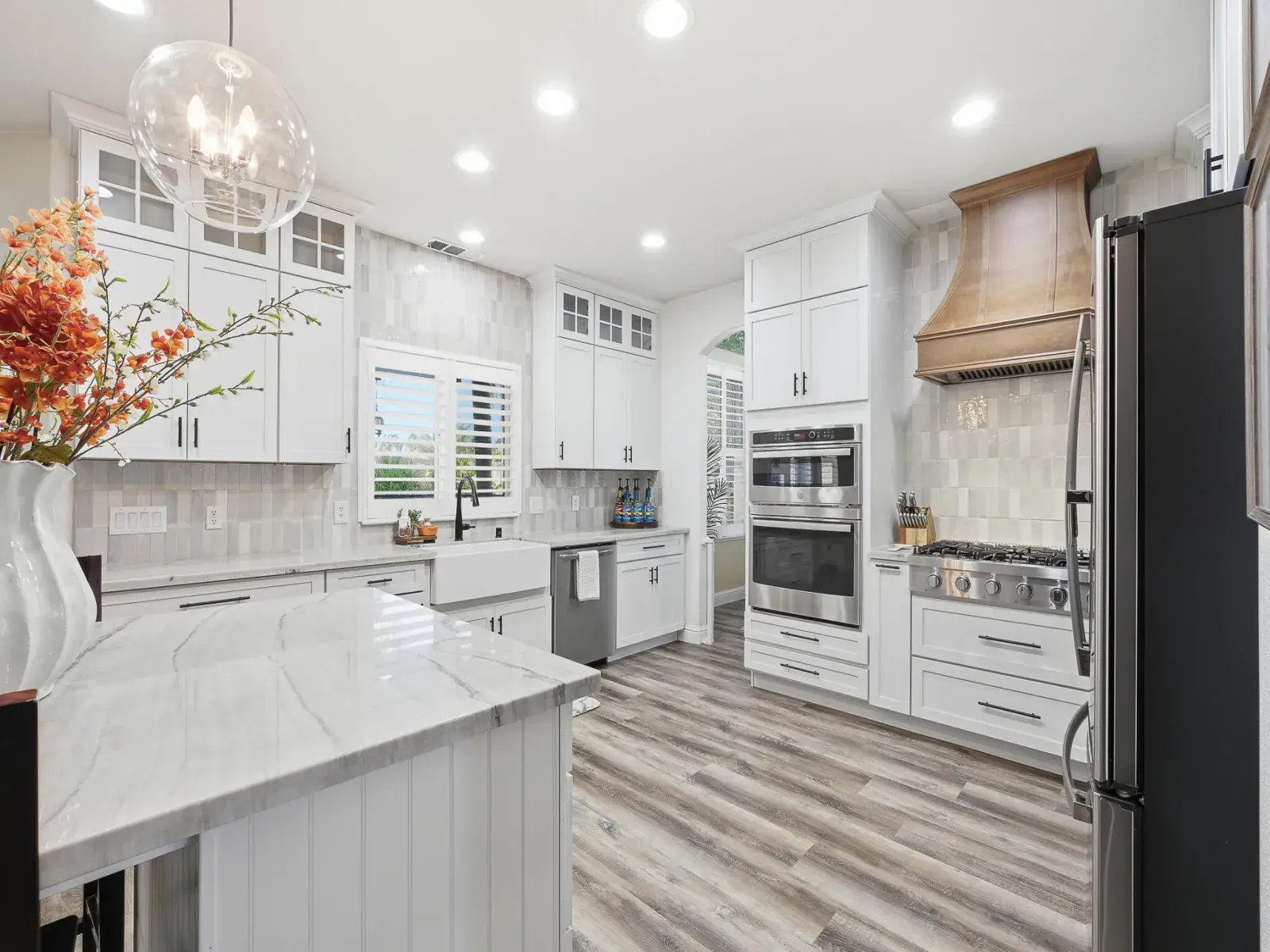 At the heart of the home, the remodeled kitchen pairs timeless design with high-end finishes — classic white cabinetry, striking quartzite countertops, premium appliances, and a custom pantry — all open to a cozy family area with a second custom fireplace for relaxed, everyday living.