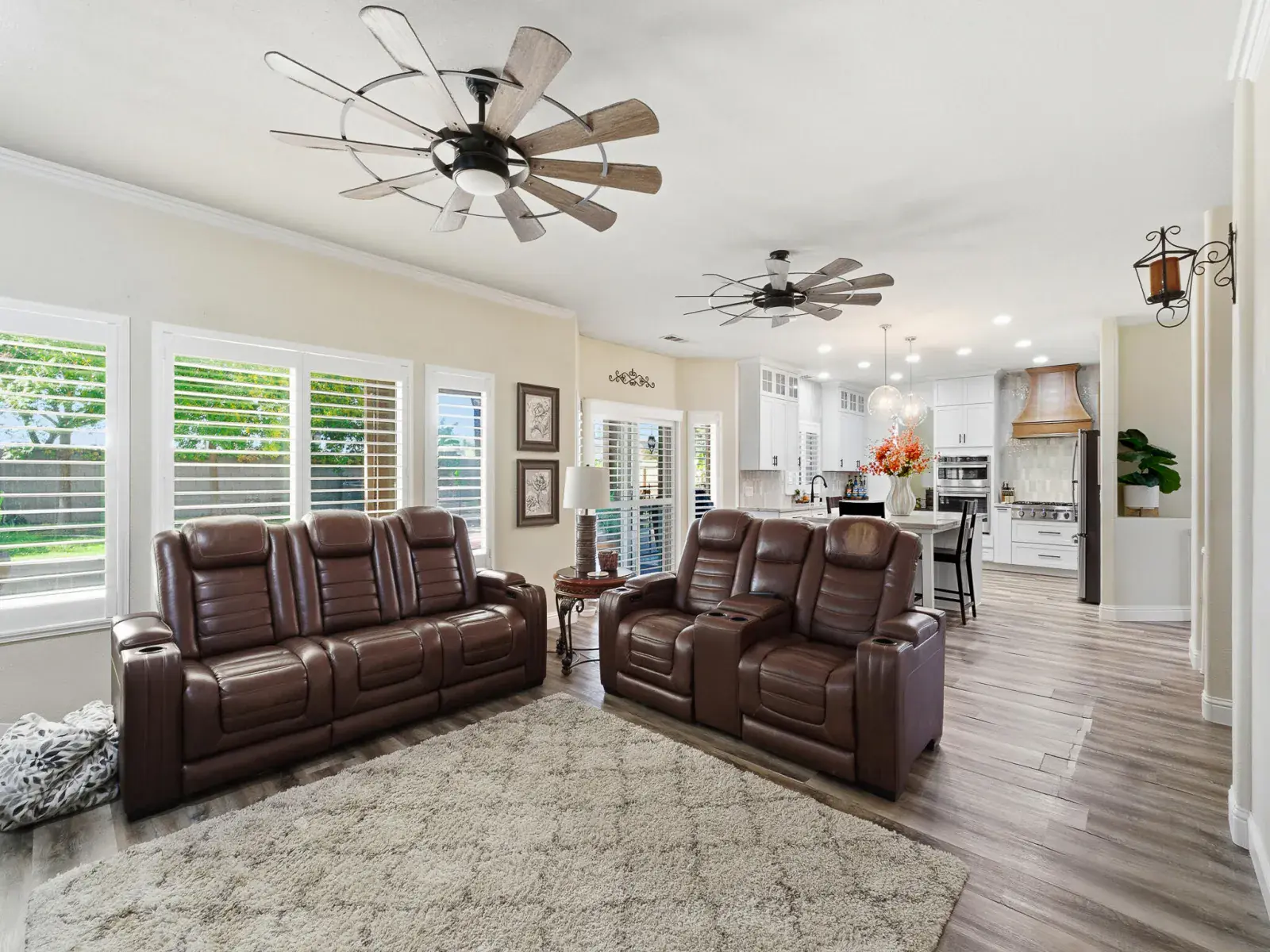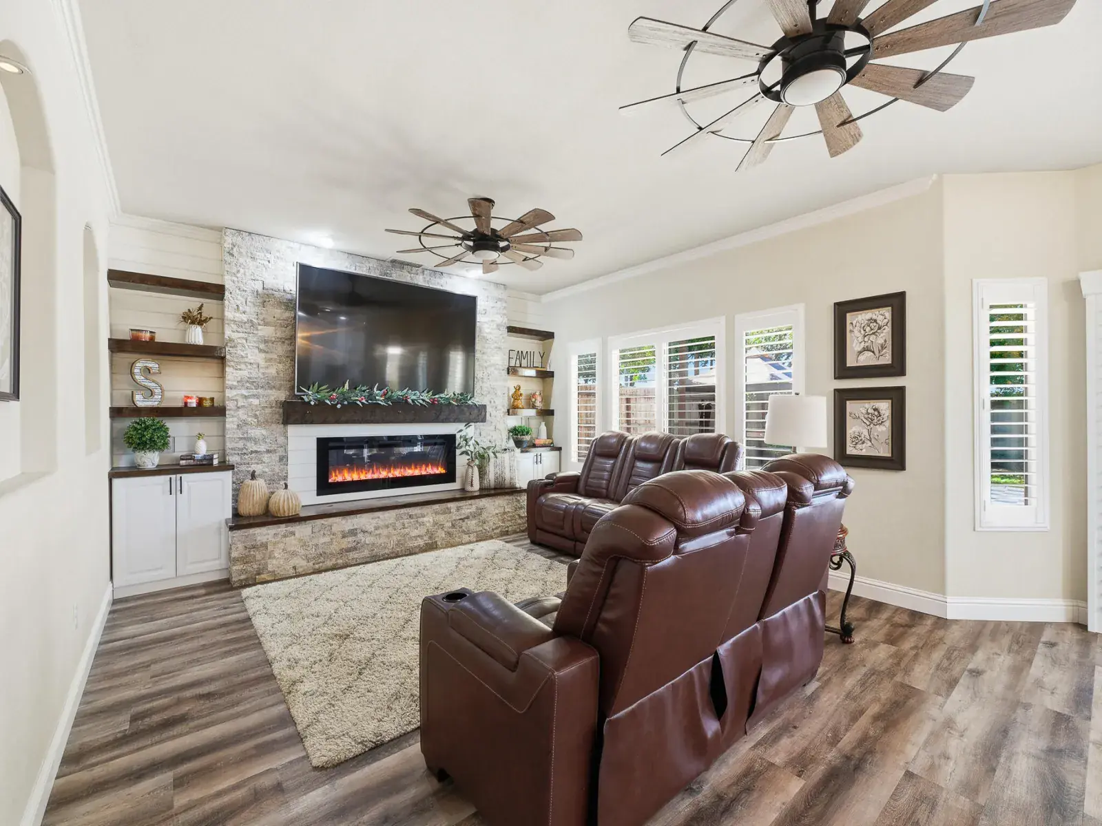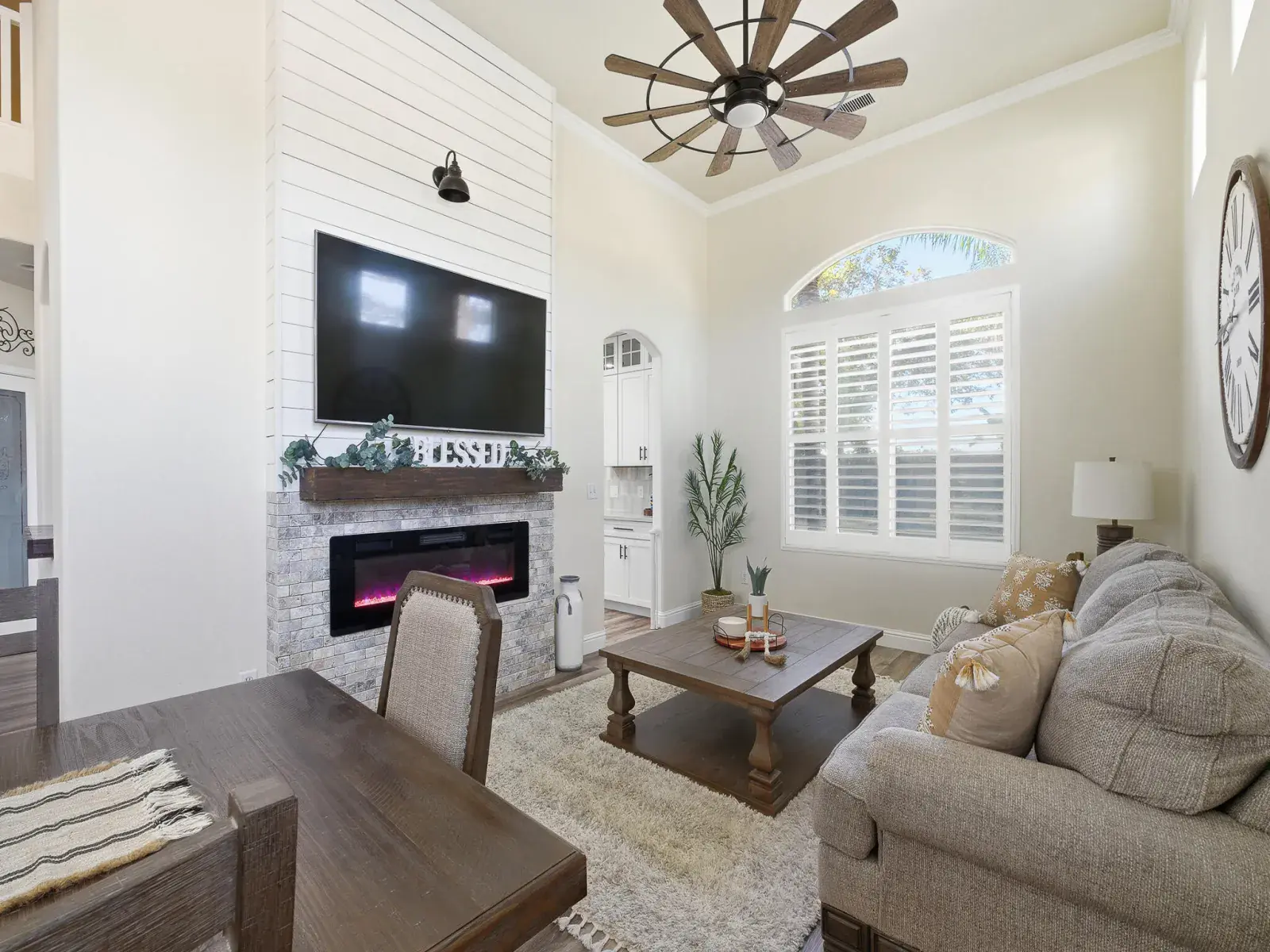 The front living and dining spaces are framed by expansive windows that fill the home with natural light, anchored by a custom fireplace and mantle that set a warm, inviting tone.