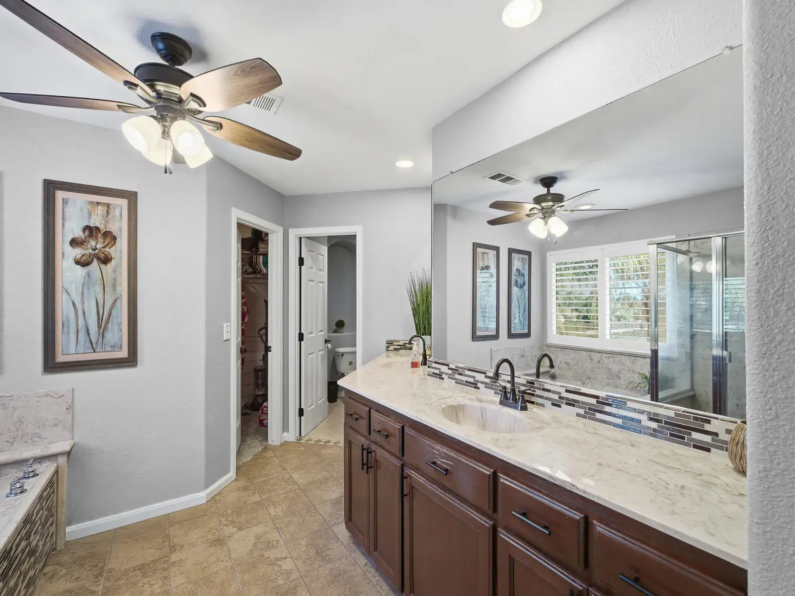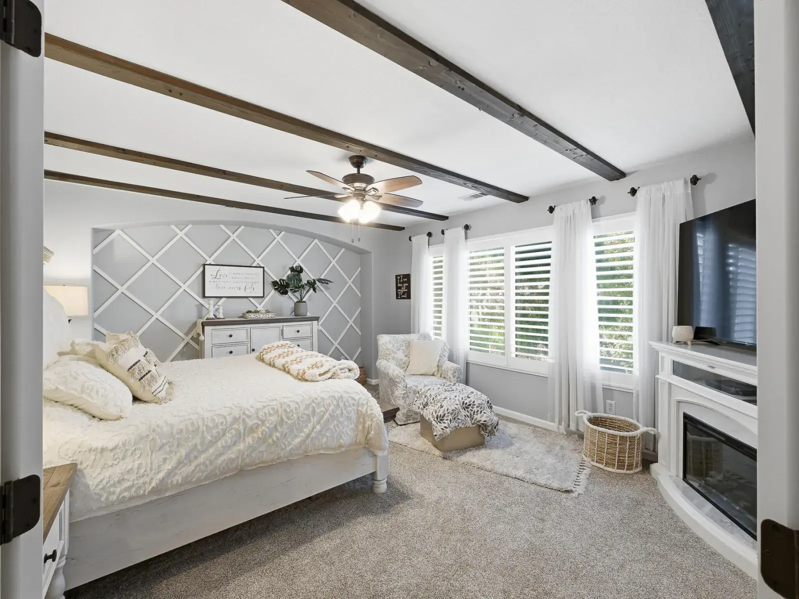 Upstairs, the owner’s retreat feels like a private escape with exposed wood-beam ceilings, a spa-inspired bath featuring a soaking tub, a walk-in shower, and beautiful natural light.