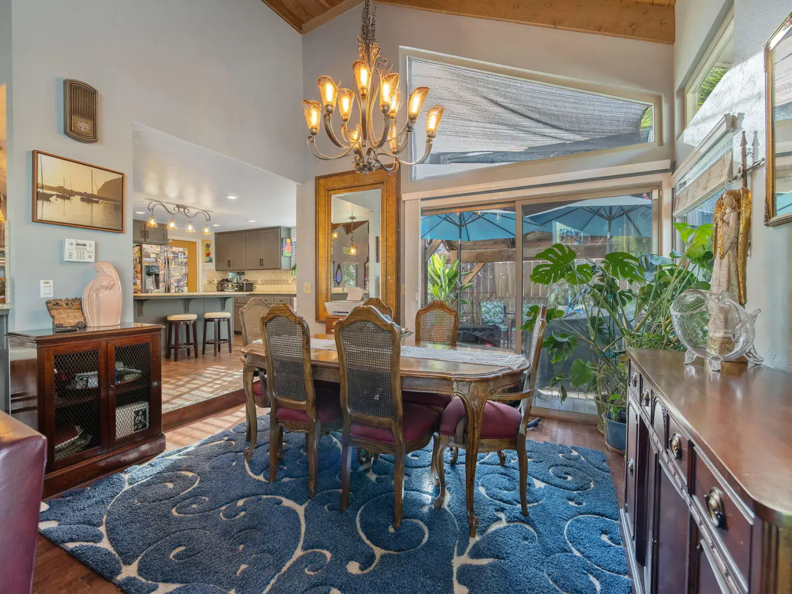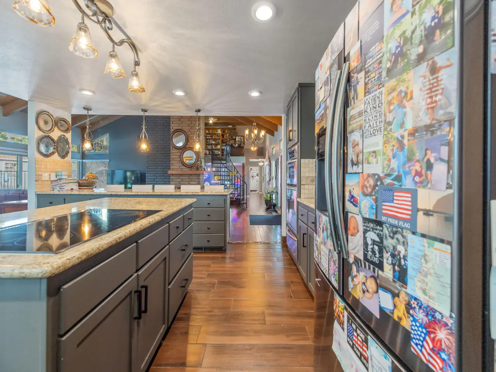 The open kitchen is a chef’s delight, featuring a new cooktop, dishwasher, sink, and garbage disposal. An abundance of natural light floods the main living spaces, highlighting the fresh changes, which also include new lighting fixtures throughout the home.
