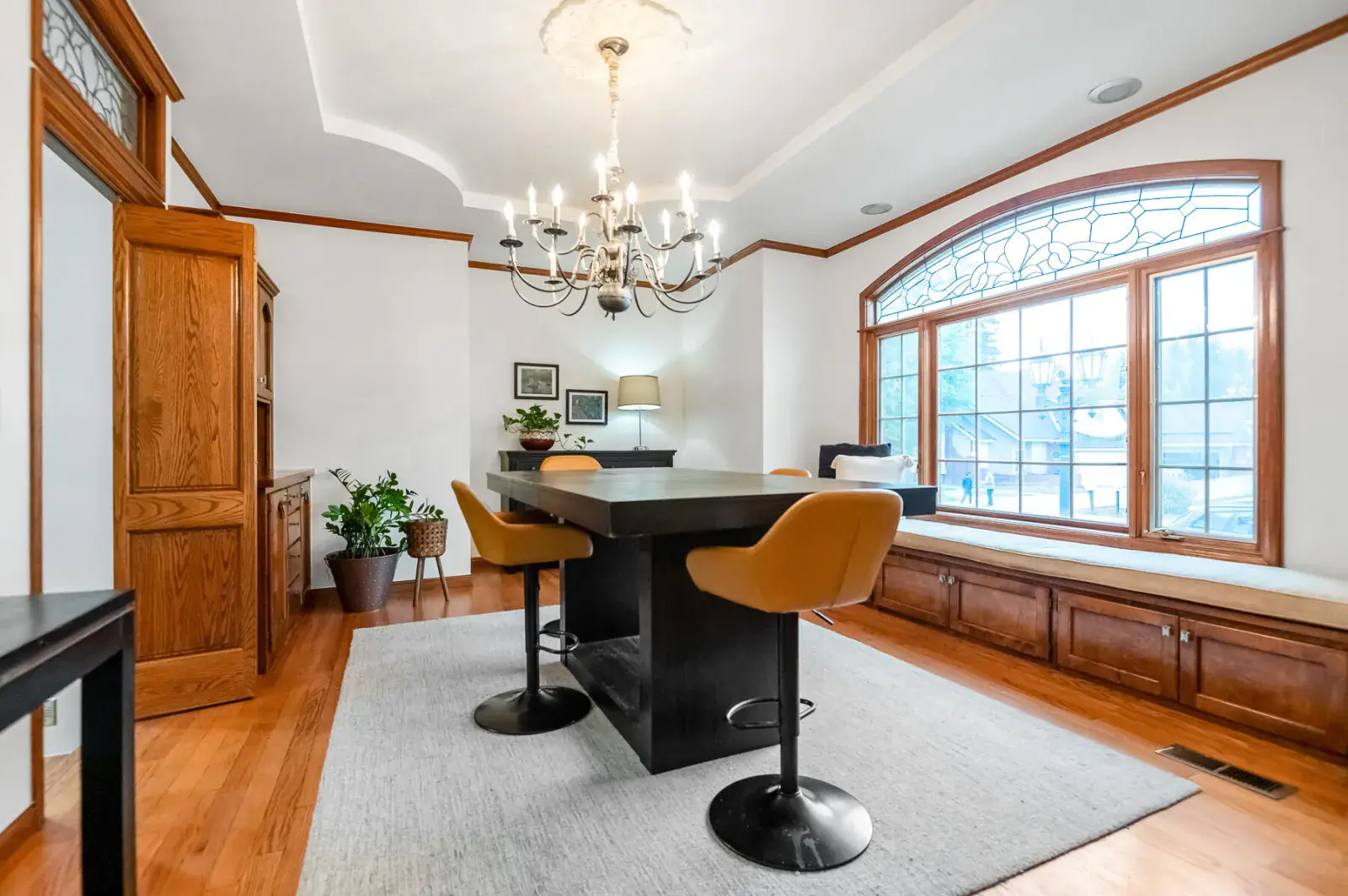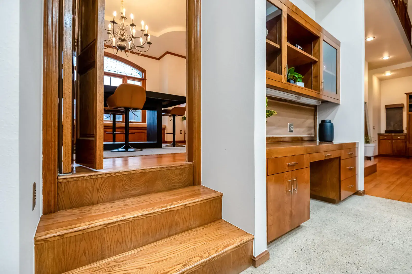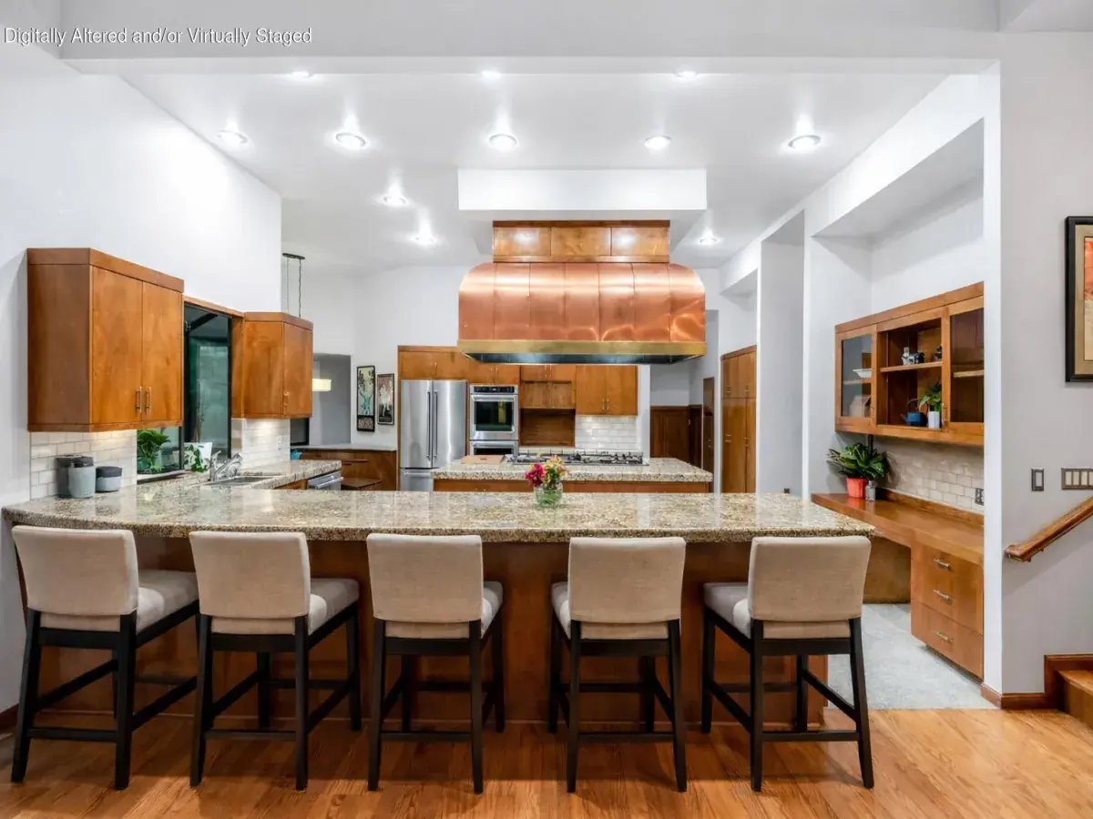 This stunning custom home is truly in a league of its own. From the striking river rock façade to the wood-cased windows, plethora of built-ins, and artful layout, every inch of this residence reflects quality craftsmanship. Enter on hardwood floors to an inviting formal dining room complete with a cozy window seat and built-in buffet—perfect for intimate gatherings or holiday dinners. The heart of the home is the impressive great room, featuring soaring ceilings, a marble-flanked fireplace and wood mantle. Adjoining this is a dream kitchen with large island topped with a dramatic copper hood, housing a gas cooktop and indoor grill. Roomy wood cabinetry, an appliance garage, prep sink, built-in kitchen desk, and pebble-tech flooring add both charm and practicality. A built-in banquette invites relaxed meals or a front-row seat to all the action. Beyond the kitchen, a multi-functional family room/den serves as the informal entry from the garage or side entrance. The spacious laundry room includes a sink, built-in desk, ironing board, and even a laundry chute from the upstairs bathroom—keeping things tidy has never been easier. A half bath with fun chalkboard walls and a generous walk-in pantry are conveniently nearby. The main-level primary suite features a sitting area with floor-to-ceiling bookshelves, a travertine-faced fireplace, coved ceiling, dual walk-in closets, granite-topped vanities, a soaking tub, and walk-in shower. Upstairs, a balcony overlooks the main living areas and connects a private bedroom with half bath on one side, and two additional bedrooms with a shared full bath on the other—ideal for family, guests, or home office. And yes, there’s even a basement! A stairway leads down to additional living space and a temperature-controlled wine room. Step outside to enjoy multiple patio spaces, a sparkling pool, an above-ground spa, and lush mature landscaping. The 3-car garage and ample driveway parking provide plenty of space for guests