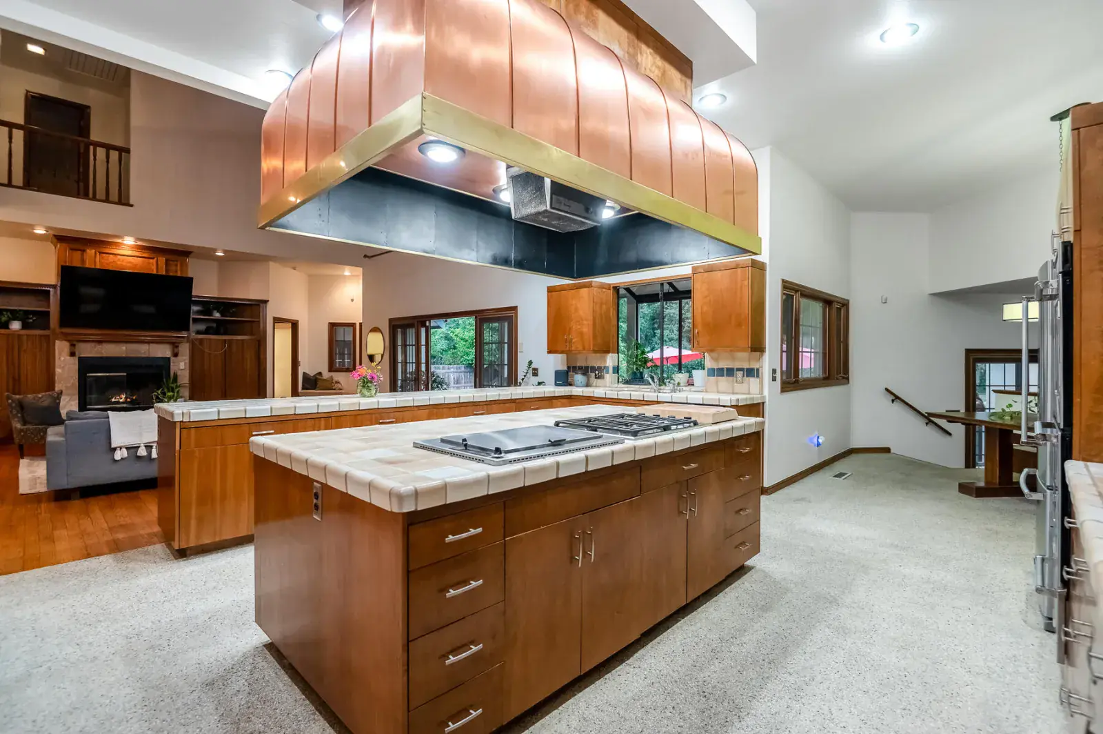 Built-in Features, Bar, Beamed Ceilings, Breakfast Bar, Ceiling Fan(s), Central Vacuum, Crown Molding, Dry Bar, High Ceilings, Kitchen Island, Open Floorplan, Recessed Lighting, Stone Counters, Tile Counters, Tray Ceiling(s), Two Story Ceilings, Vaulted Ceiling(s)