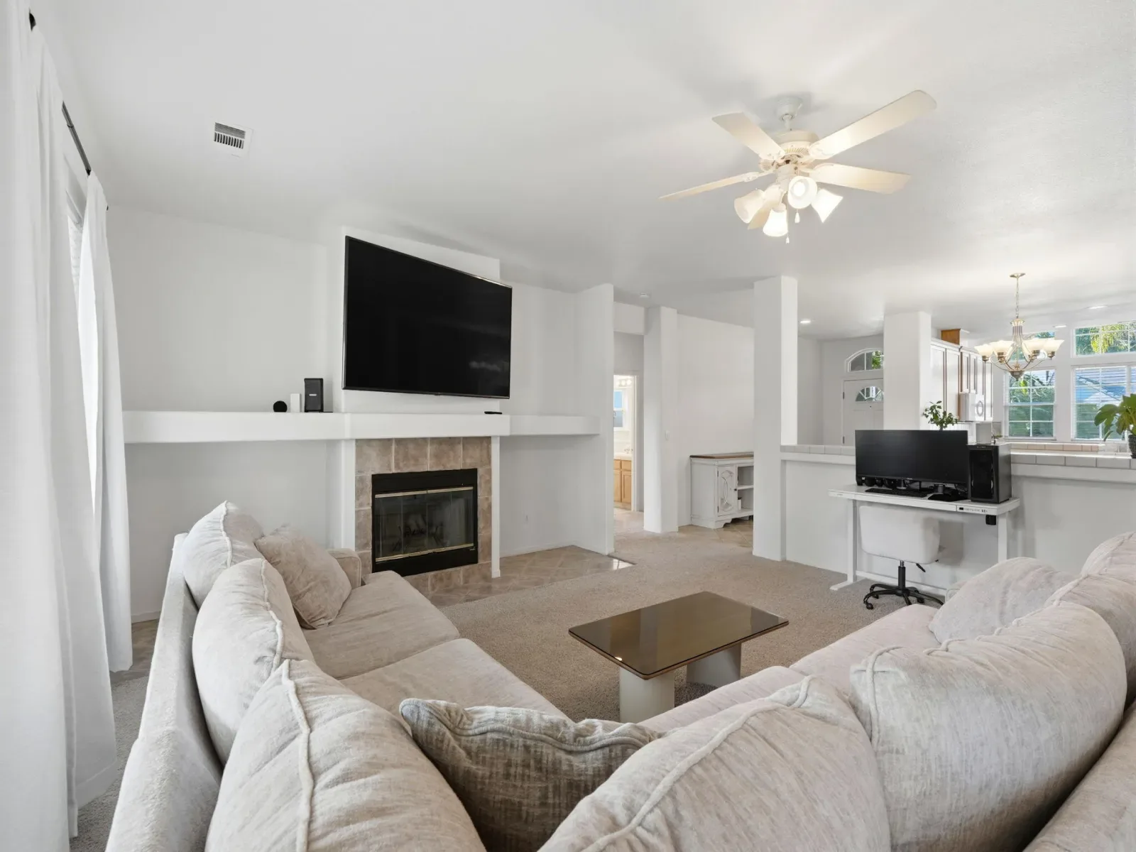 Wonderful home with charming curb appeal featuring a bright open kitchen filled with natural light, abundant windows, generous counter space, and ample cabinetry. The kitchen opens nicely to the dining area and spacious living room with a cozy fireplace, creating a warm and inviting space for both everyday living and entertaining. The split floor plan offers privacy with three spacious bedrooms and two bathrooms. The large owner’s suite feels like a true retreat with plenty of space to relax and unwind. The ensuite bathroom has been tastefully remodeled with a modern, luxurious feel and features a beautiful walk in shower and a walk in closet. The covered patio and backyard provide plenty of space to relax, gather, and entertain.Do not miss the opportunity to make this wonderful home yours. Schedule your private showing today.