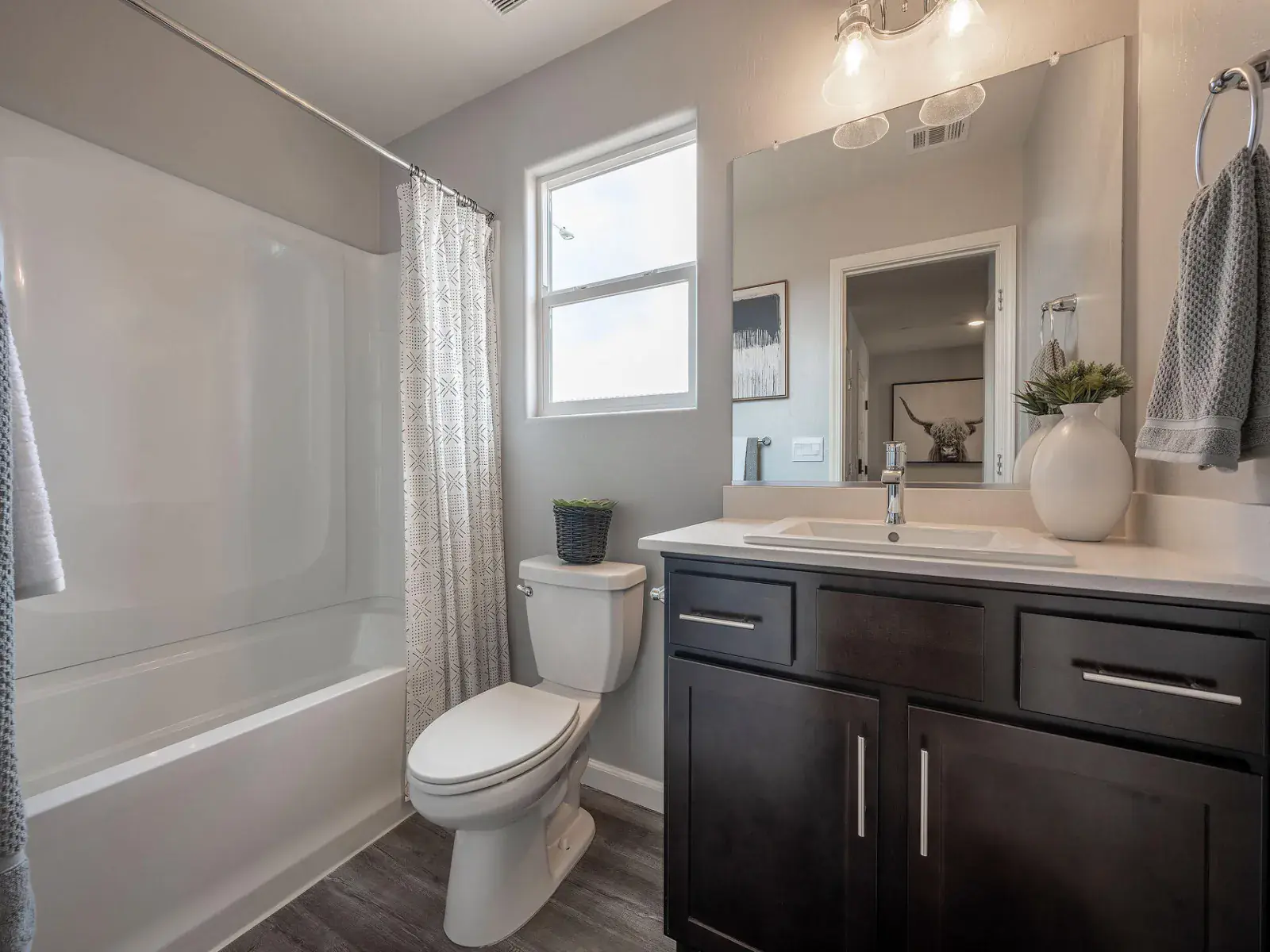 This single-story, four bedroom, two bathroom home is enhanced with 9′ ceilings and offers approximately 1,509 square feet of living space with an open-style living room and adjoining kitchen and dining area that are perfect for entertaining. The kitchen features shaker-style cabinetry, quartz countertops with backsplash, a walk-in pantry, a center island with pendant lighting and snack bar, and Whirlpool® stainless-steel appliances including a range, microwave and dishwasher. Black finishes are standard throughout the home. The main suite has an adjoining bathroom with dual vanity sinks and a large walk-in closet.