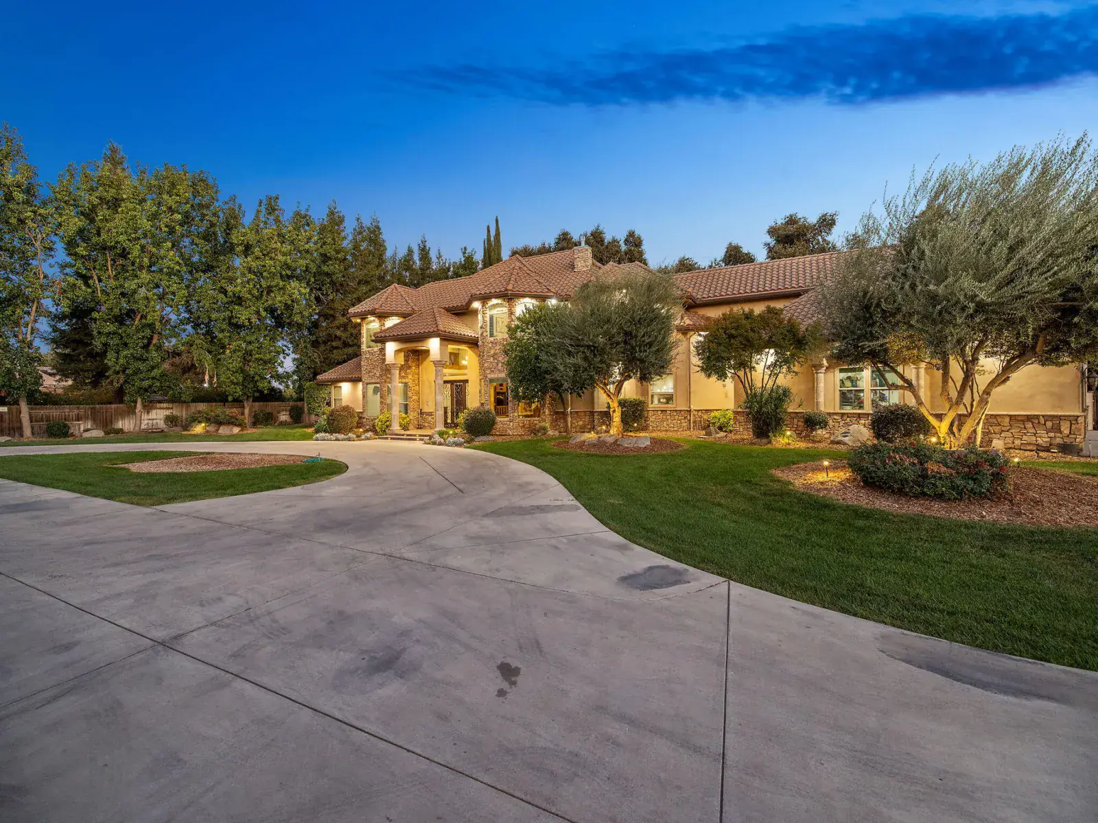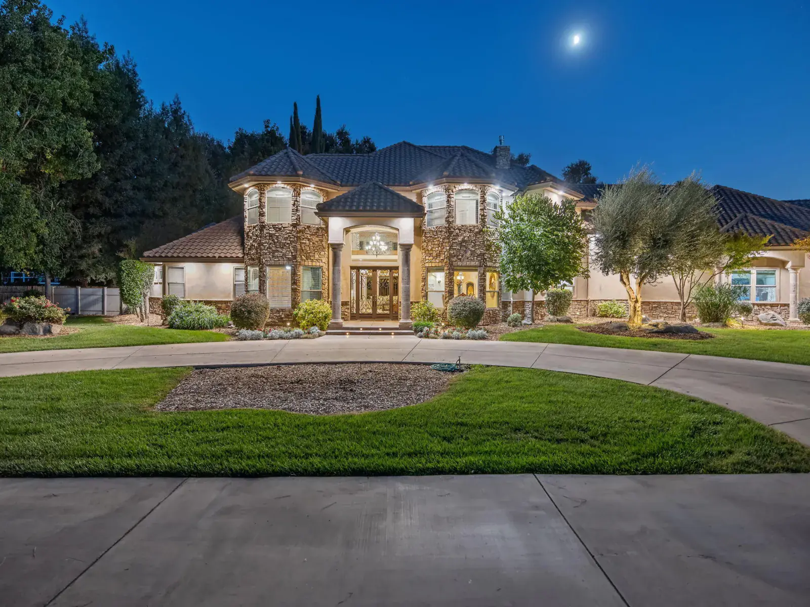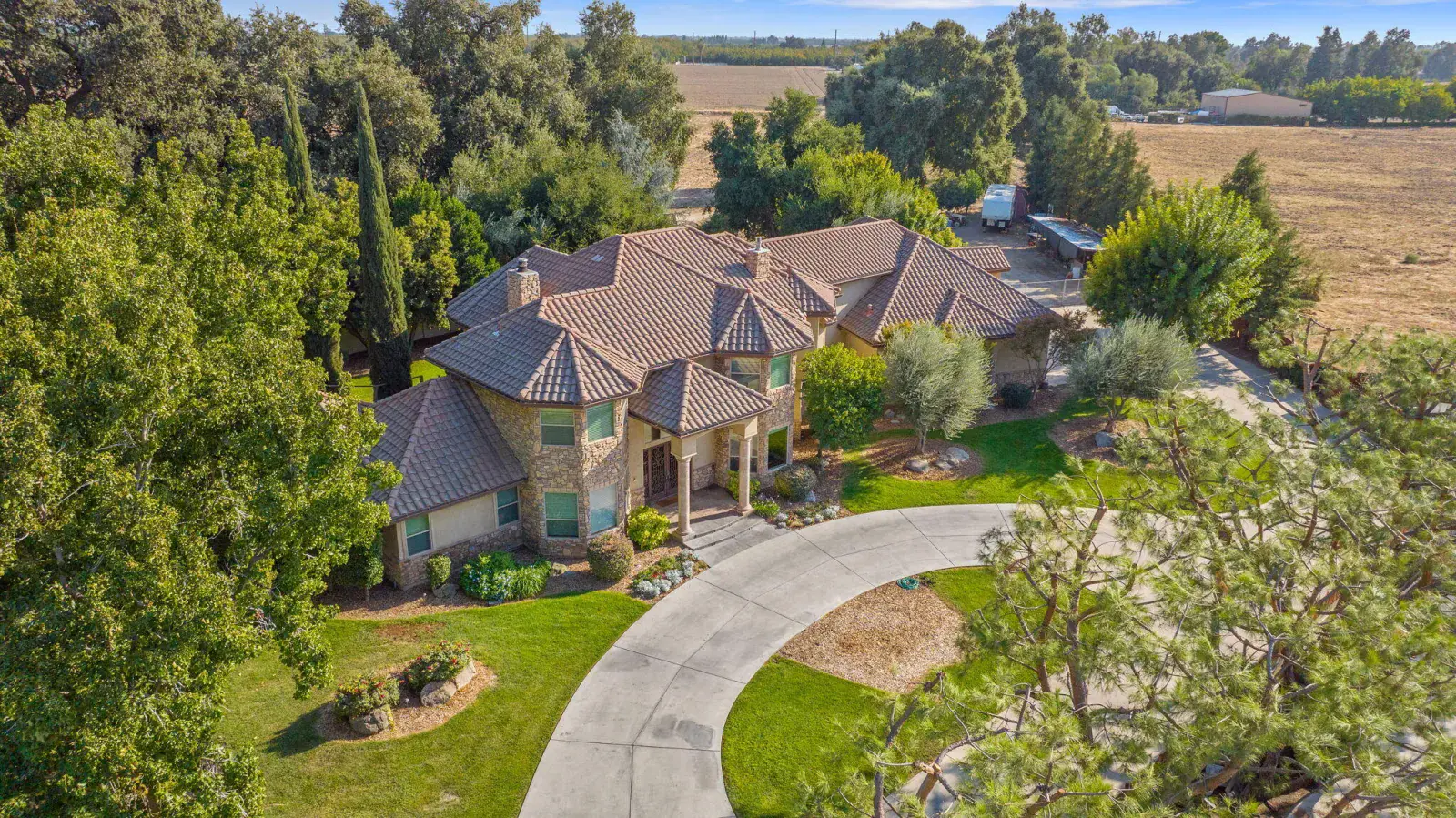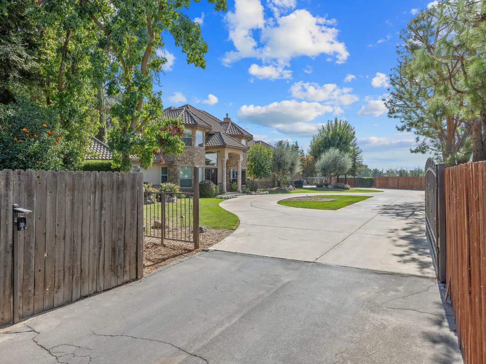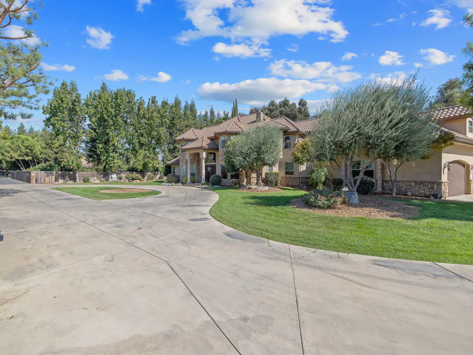 Gorgeous, luxurious estate situated on 1.28 Acres in prime SW Visalia location! Located in the highly desirable rural corridor between NE Tulare and SW Visalia, this custom 5 bed, 3.5 bath luxury home offers a country setting, conveniently located near schools, shopping, and all the amenities. Beyond the private and circle drive, custom wrought iron entry doors into formal entry with two story ceilings, Cantera stone pillars imported from Mexico, and travertine floors. The great room features 20′ ceilings, a wall of windows, wood-burning fireplace, hand-scraped hickory floors, and custom built-in entertainment. Showstopping chef’s kitchen is with two islands, granite countertops, Sub-Zero fridge, Wolf range with double ovens, Butler’s pantry, Knotty Alder cabinetry, under-cabinet lighting, and custom stained glass details. A built-in desk sits just off the kitchen, along with a spacious laundry room and mudroom with built-in bench leading to the 4-car garage. The luxurious ground-floor primary suite features a sitting area, his and hers walk-in closets, French doors to a private patio with above-ground jacuzzi, and spa-like bath with marble countertops and tub surround. A private office (or 5th bedroom) and powder bath with outdoor access round out the main level. Upstairs, a landing with built-in desks and shelves, three spacious bedrooms (Jack & Jill + en suite), a bonus/game room (room for air hockey table, as shown, and more!) with French doors to a deck overlooking the backyard, and a custom home theater with projector, screen, seating, and storage. Outdoors, enjoy an entertainer’s dream setup: covered patio, outdoor kitchen with built-in grill, fridge, gas cooktop, and serving space. The beautifully landscaped yard features mature trees for shade and privacy. Around the property, discover fruit trees (pomegranate, lemon, lime, persimmon, and more), RV parking, chicken coop, dog run, and even an in-ground deep pit. Truly one-of-a-kind home – must see!