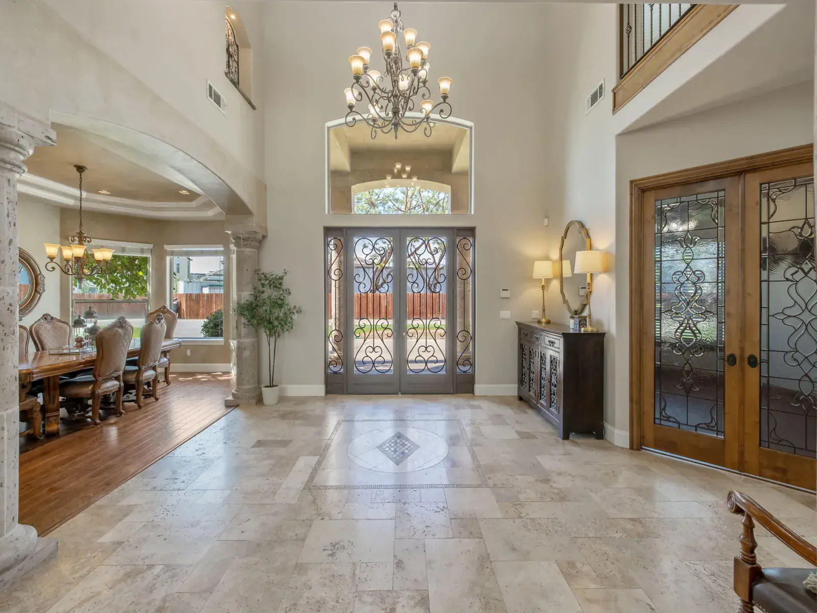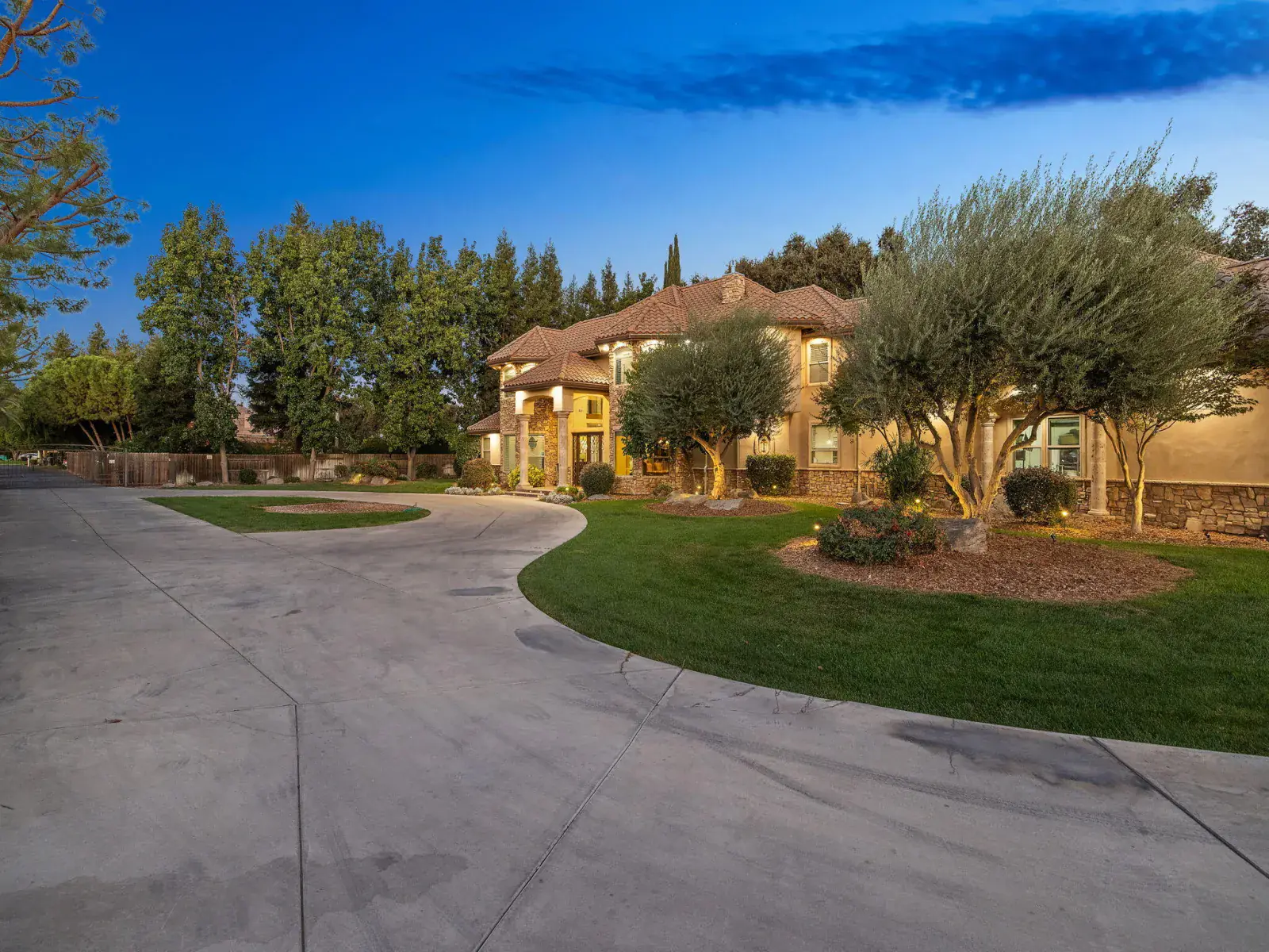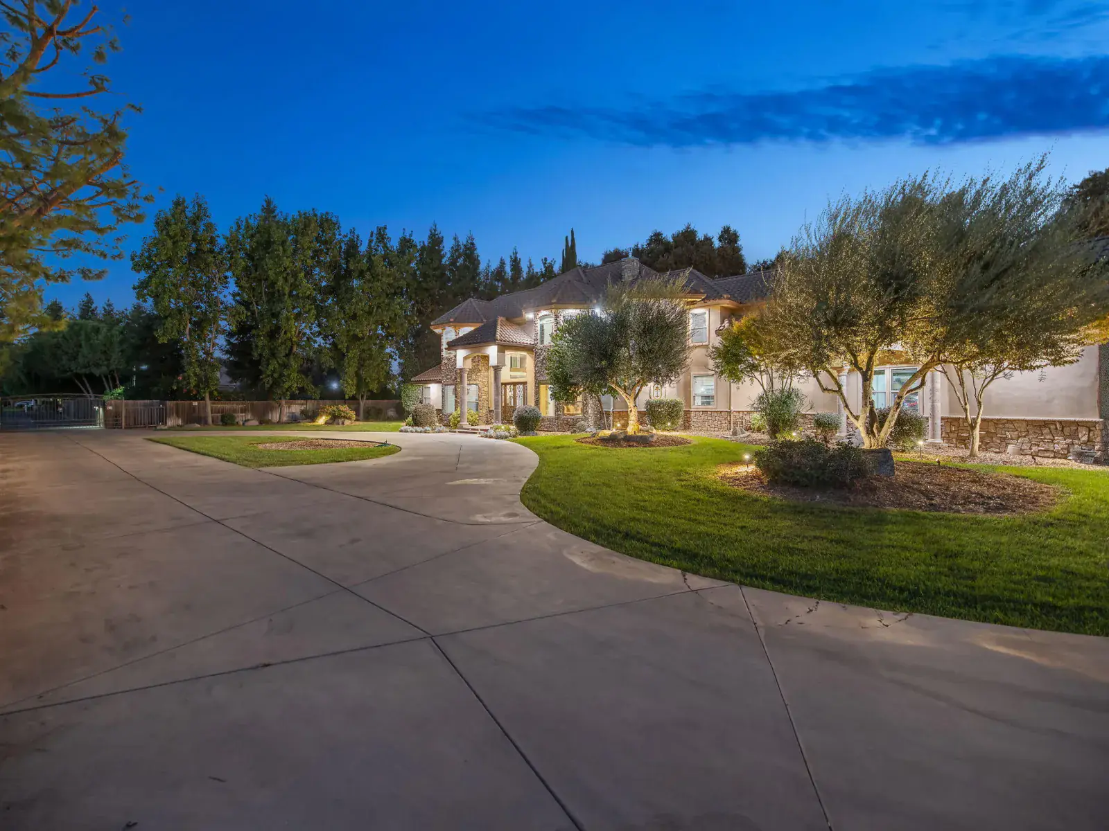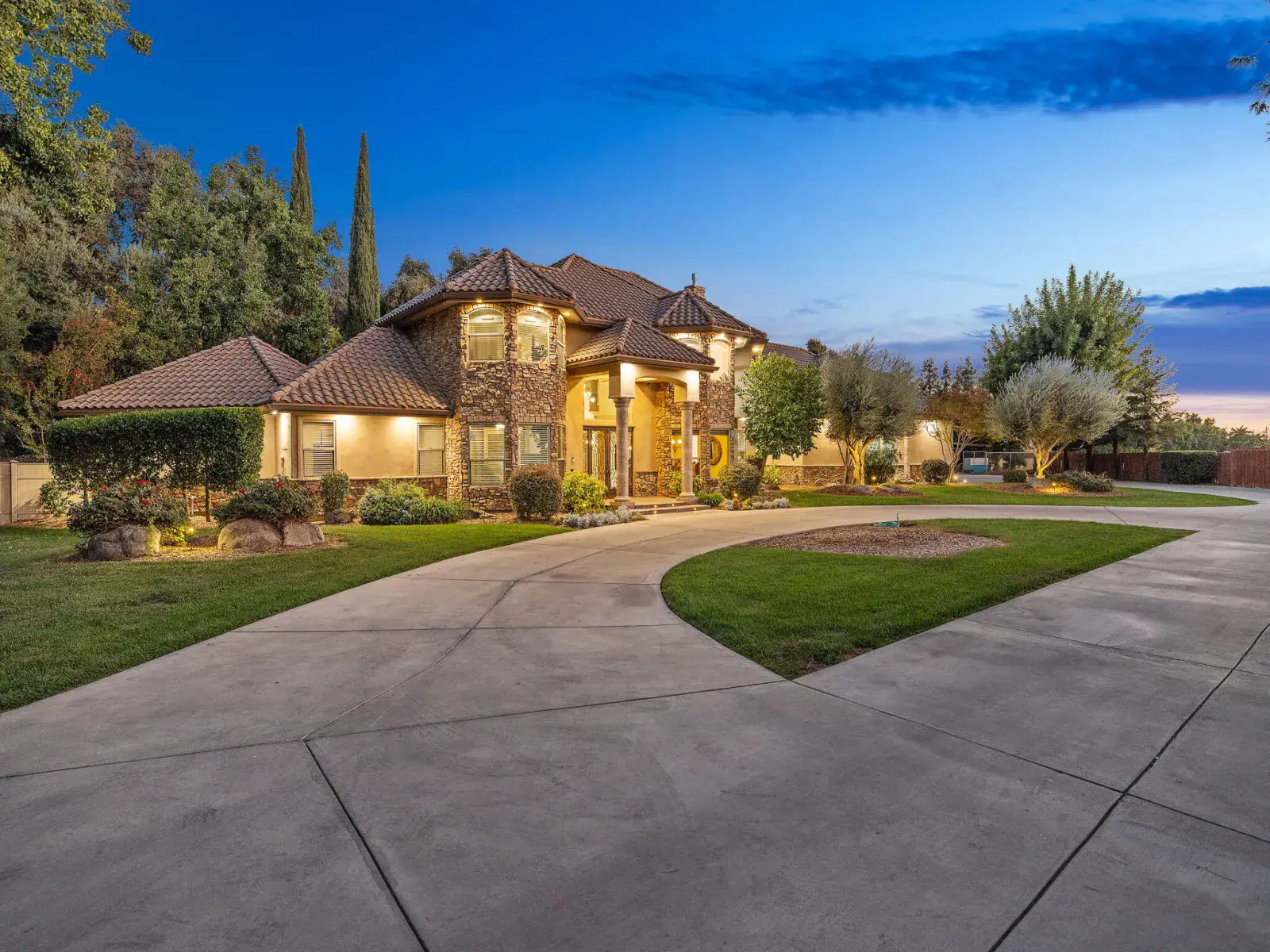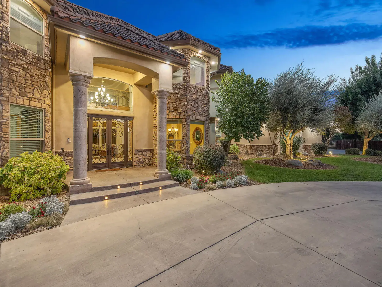 Gorgeous, luxurious estate situated on 1.28 Acres in prime SW Visalia location! Located in the highly desirable rural corridor between NE Tulare and SW Visalia, this custom 5 bed, 3.5 bath luxury home offers a country setting, conveniently located near schools, shopping, and all the amenities. Beyond the private and circle drive, custom wrought iron entry doors into formal entry with two story ceilings, Cantera stone pillars imported from Mexico, and travertine floors. The great room features 20′ ceilings, a wall of windows, wood-burning fireplace, hand-scraped hickory floors, and custom built-in entertainment. Showstopping chef’s kitchen is with two islands, granite countertops, Sub-Zero fridge, Wolf range with double ovens, Butler’s pantry, Knotty Alder cabinetry, under-cabinet lighting, and custom stained glass details. A built-in desk sits just off the kitchen, along with a spacious laundry room and mudroom with built-in bench leading to the 4-car garage. The luxurious ground-floor primary suite features a sitting area, his and hers walk-in closets, French doors to a private patio with above-ground jacuzzi, and spa-like bath with marble countertops and tub surround. A private office (or 5th bedroom) and powder bath with outdoor access round out the main level. Upstairs, a landing with built-in desks and shelves, three spacious bedrooms (Jack & Jill + en suite), a bonus/game room (room for air hockey table, as shown, and more!) with French doors to a deck overlooking the backyard, and a custom home theater with projector, screen, seating, and storage. Outdoors, enjoy an entertainer’s dream setup: covered patio, outdoor kitchen with built-in grill, fridge, gas cooktop, and serving space. The beautifully landscaped yard features mature trees for shade and privacy. Around the property, discover fruit trees (pomegranate, lemon, lime, persimmon, and more), RV parking, chicken coop, dog run, and even an in-ground deep pit. Truly one-of-a-kind home – must see!