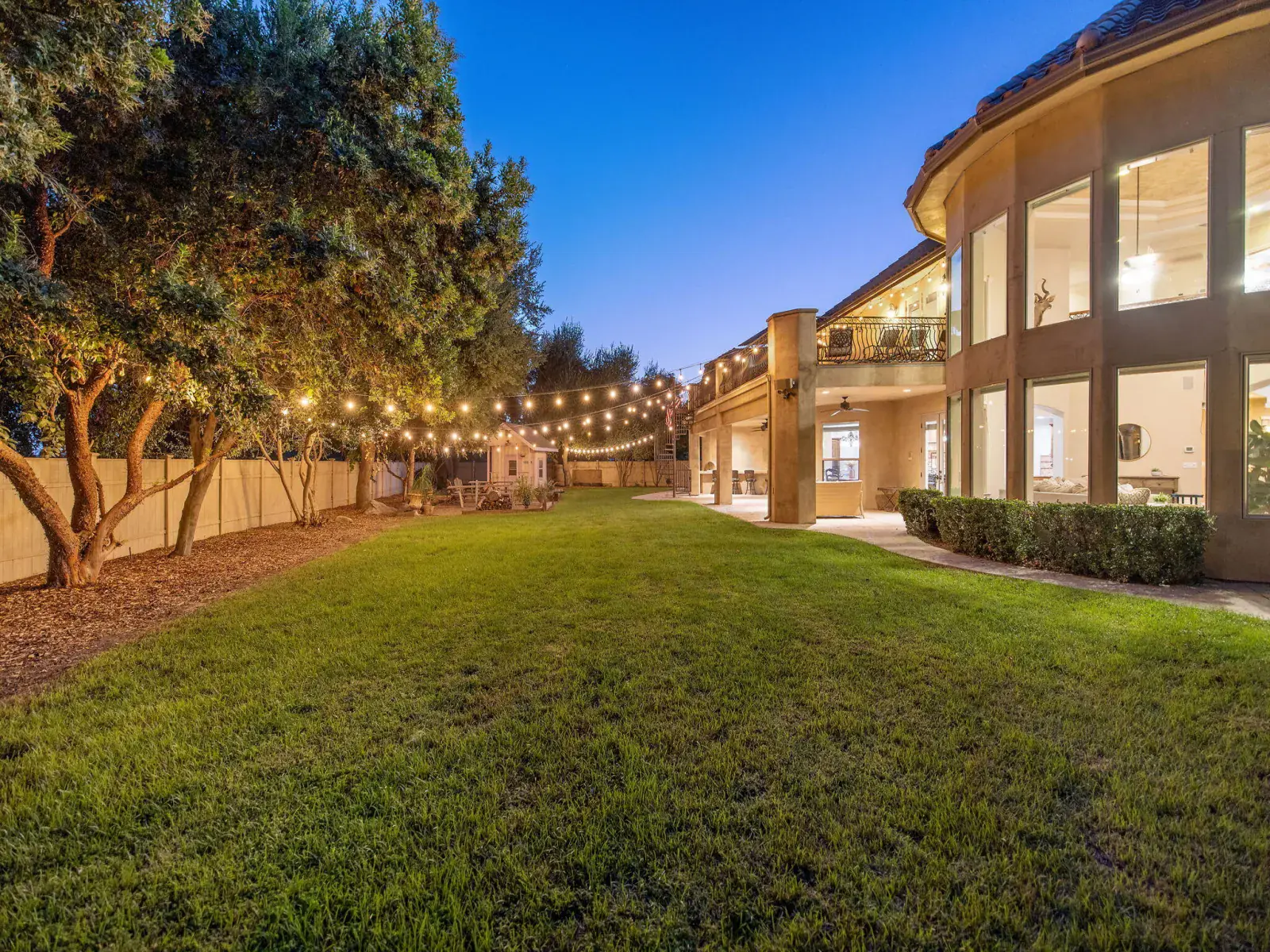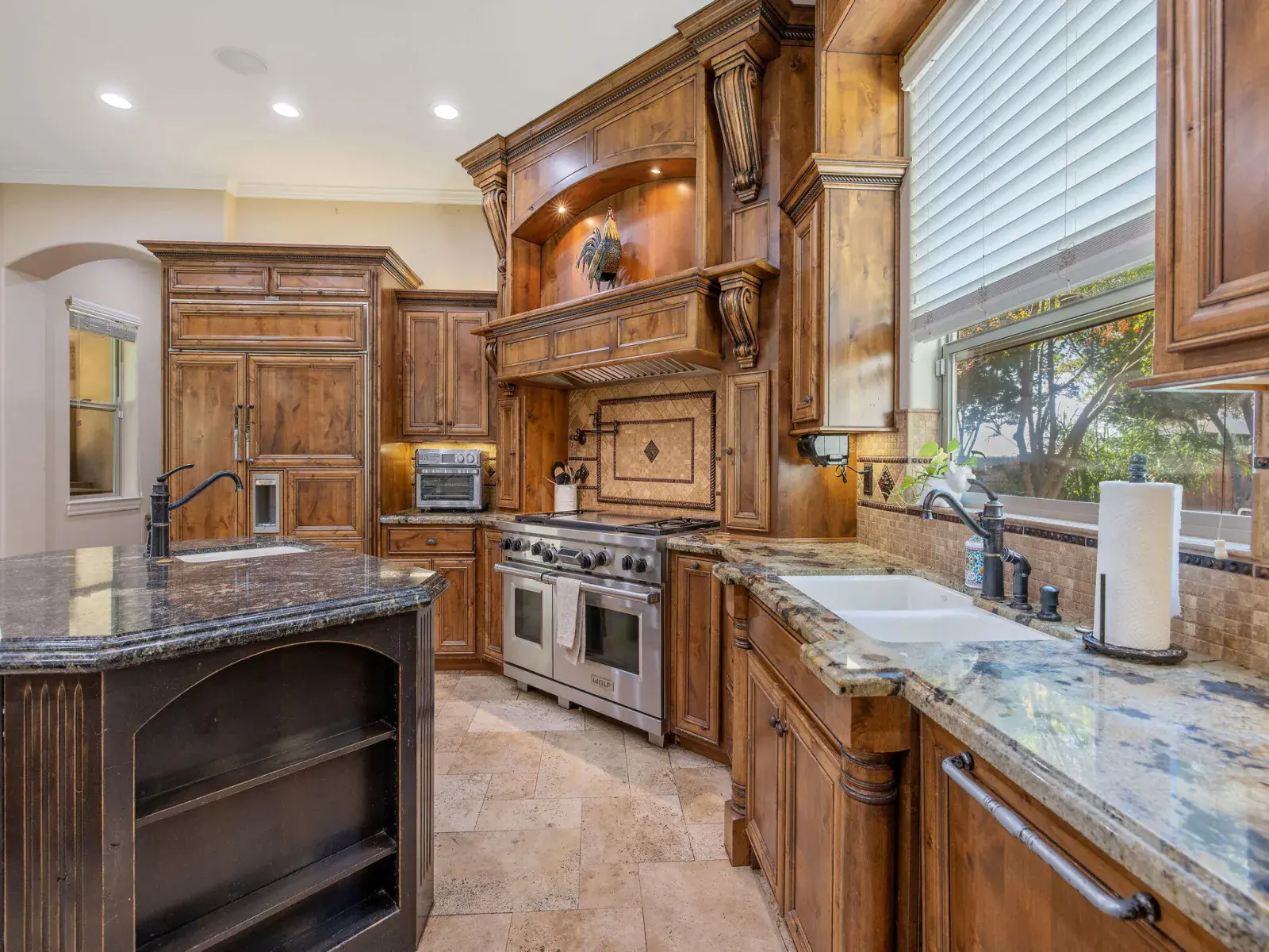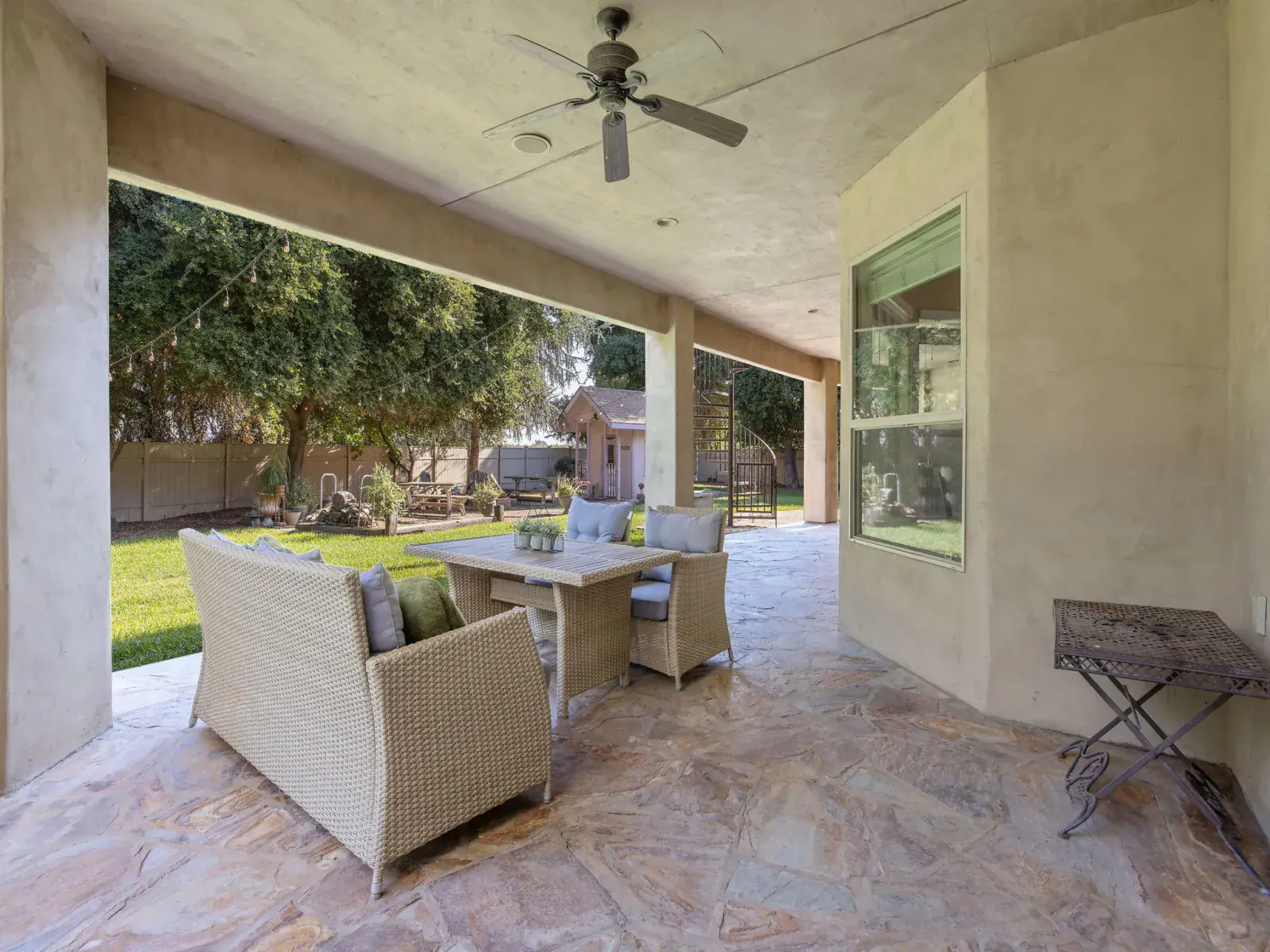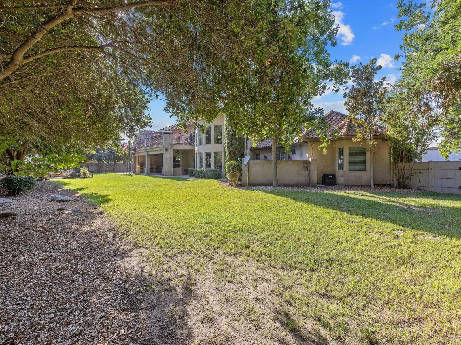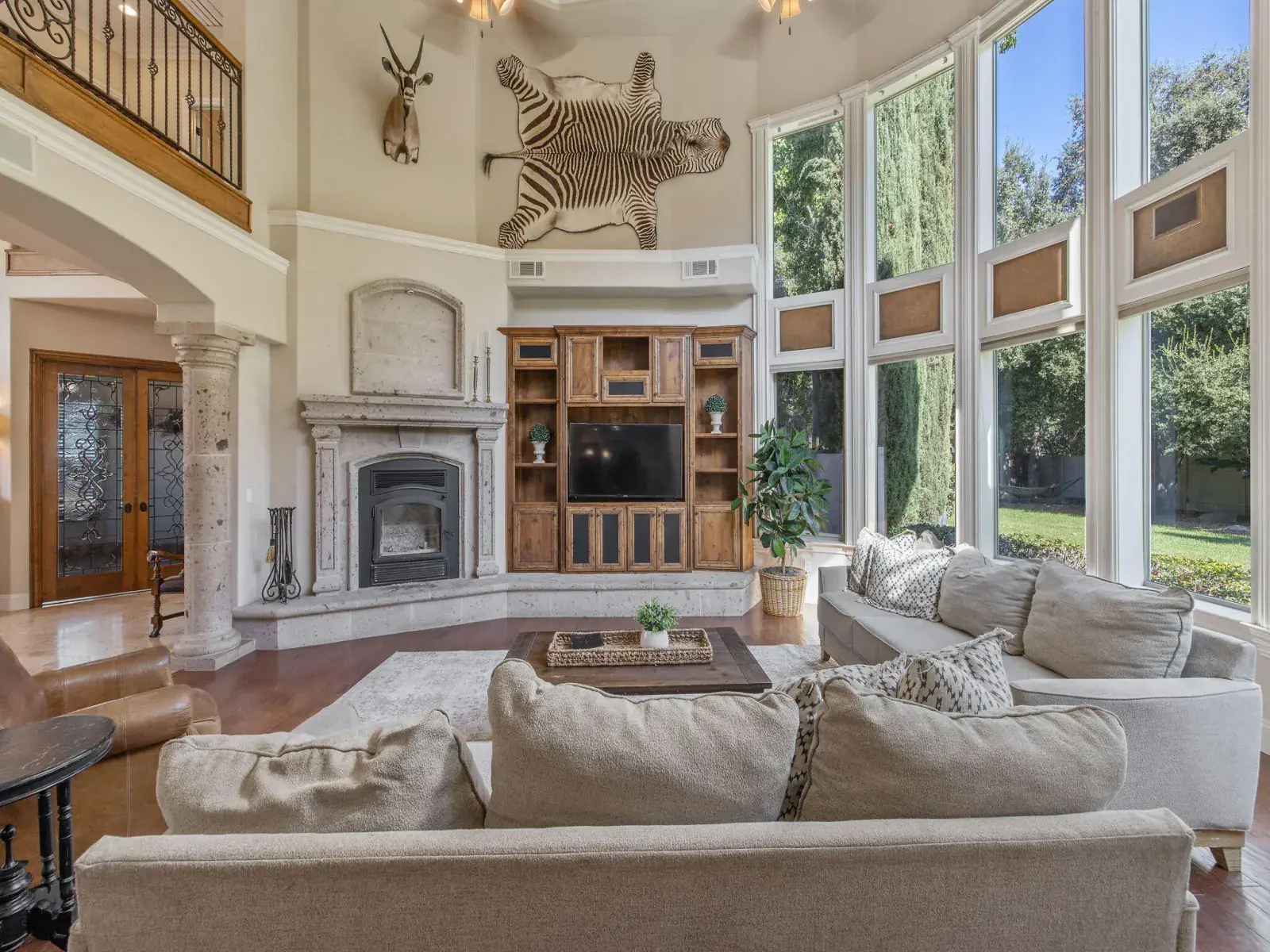 Gorgeous, luxurious estate situated on 1.28 Acres in prime SW Visalia location! Located in the highly desirable rural corridor between NE Tulare and SW Visalia, this custom 5 bed, 3.5 bath luxury home offers a country setting, conveniently located near schools, shopping, and all the amenities. Beyond the private and circle drive, custom wrought iron entry doors into formal entry with two story ceilings, Cantera stone pillars imported from Mexico, and travertine floors. The great room features 20′ ceilings, a wall of windows, wood-burning fireplace, hand-scraped hickory floors, and custom built-in entertainment. Showstopping chef’s kitchen is with two islands, granite countertops, Sub-Zero fridge, Wolf range with double ovens, Butler’s pantry, Knotty Alder cabinetry, under-cabinet lighting, and custom stained glass details. A built-in desk sits just off the kitchen, along with a spacious laundry room and mudroom with built-in bench leading to the 4-car garage. The luxurious ground-floor primary suite features a sitting area, his and hers walk-in closets, French doors to a private patio with above-ground jacuzzi, and spa-like bath with marble countertops and tub surround. A private office (or 5th bedroom) and powder bath with outdoor access round out the main level. Upstairs, a landing with built-in desks and shelves, three spacious bedrooms (Jack & Jill + en suite), a bonus/game room (room for air hockey table, as shown, and more!) with French doors to a deck overlooking the backyard, and a custom home theater with projector, screen, seating, and storage. Outdoors, enjoy an entertainer’s dream setup: covered patio, outdoor kitchen with built-in grill, fridge, gas cooktop, and serving space. The beautifully landscaped yard features mature trees for shade and privacy. Around the property, discover fruit trees (pomegranate, lemon, lime, persimmon, and more), RV parking, chicken coop, dog run, and even an in-ground deep pit. Truly one-of-a-kind home – must see!