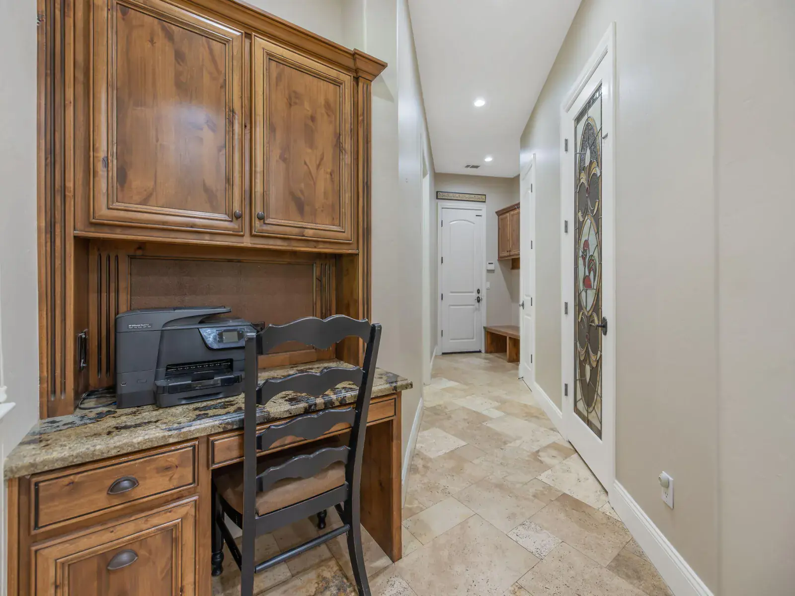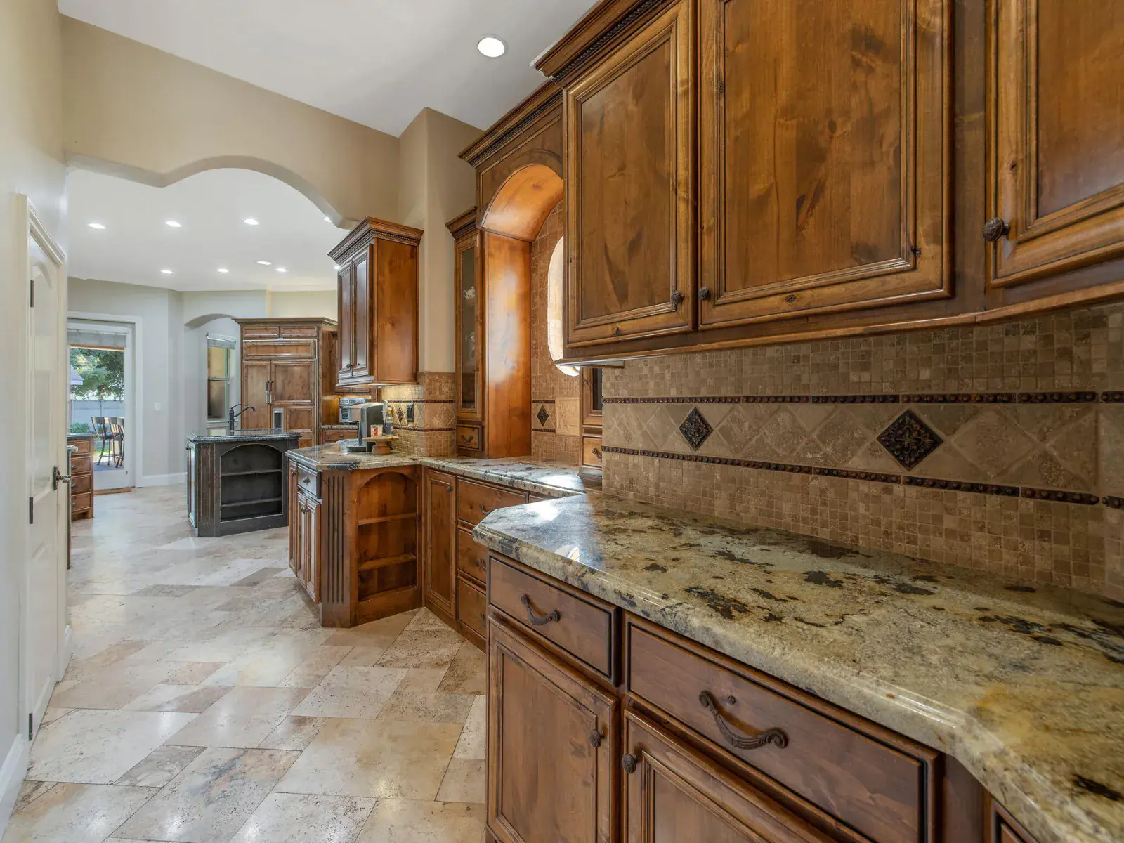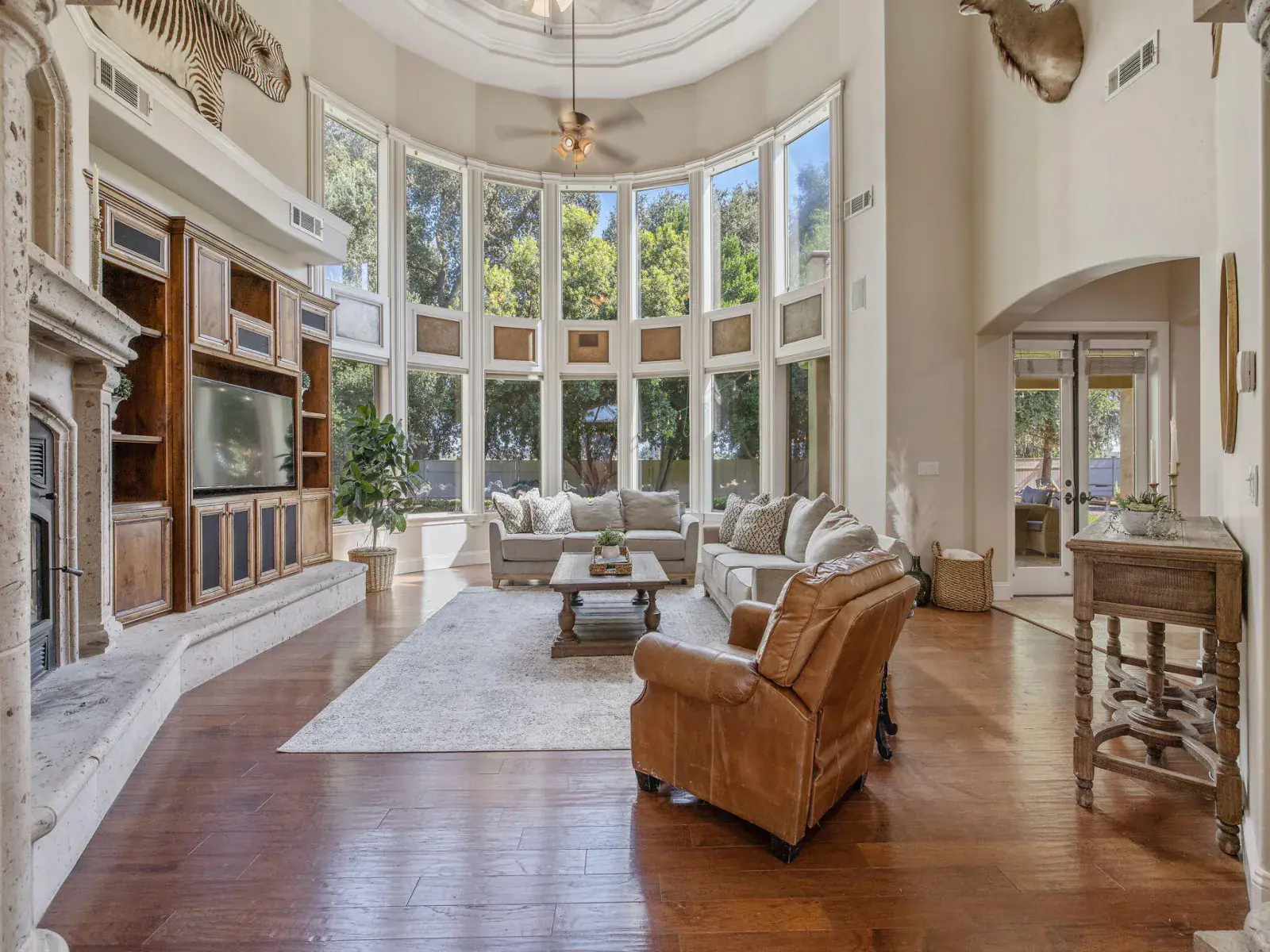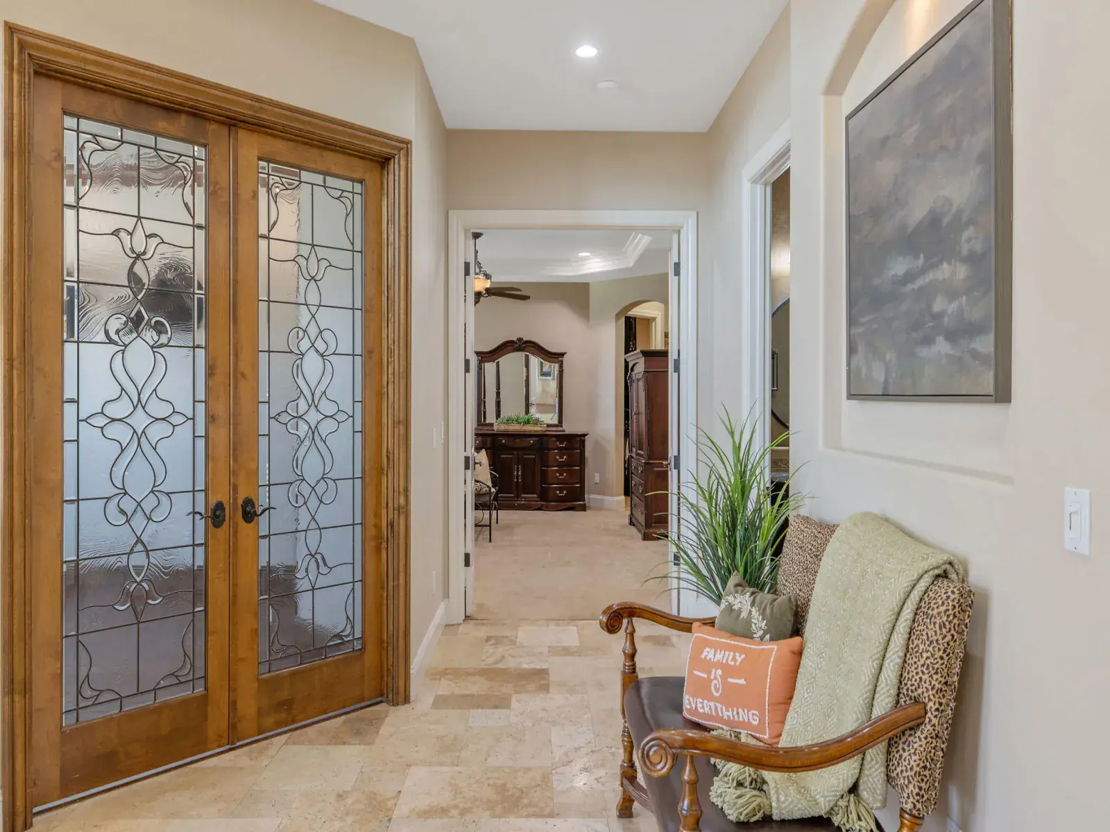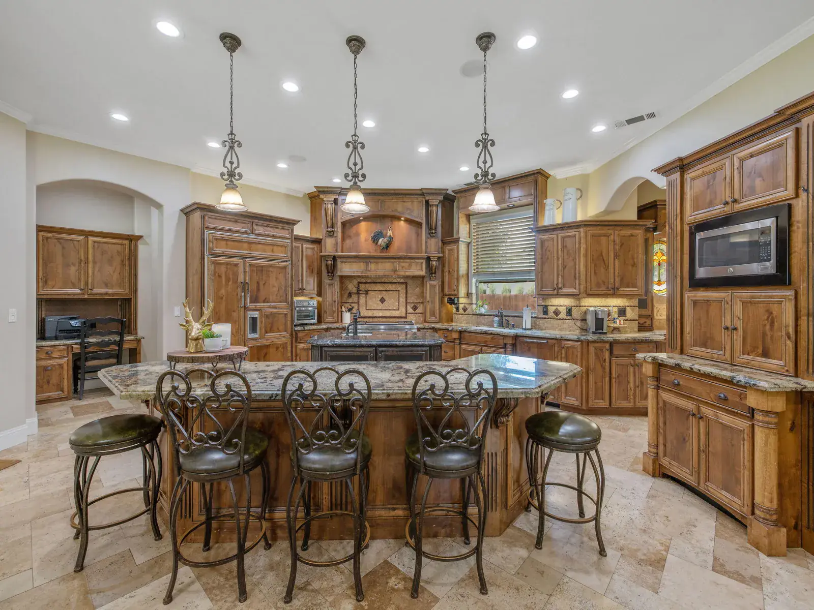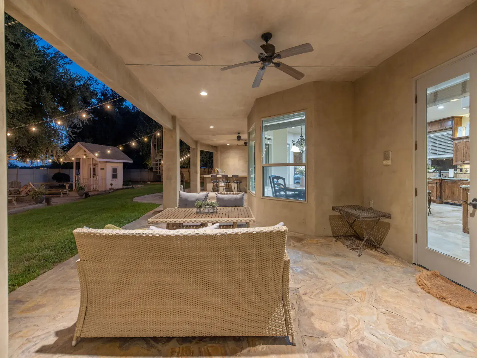 Gorgeous, luxurious estate situated on 1.28 Acres in prime SW Visalia location! Located in the highly desirable rural corridor between NE Tulare and SW Visalia, this custom 5 bed, 3.5 bath luxury home offers a country setting, conveniently located near schools, shopping, and all the amenities. Beyond the private and circle drive, custom wrought iron entry doors into formal entry with two story ceilings, Cantera stone pillars imported from Mexico, and travertine floors. The great room features 20′ ceilings, a wall of windows, wood-burning fireplace, hand-scraped hickory floors, and custom built-in entertainment. Showstopping chef’s kitchen is with two islands, granite countertops, Sub-Zero fridge, Wolf range with double ovens, Butler’s pantry, Knotty Alder cabinetry, under-cabinet lighting, and custom stained glass details. A built-in desk sits just off the kitchen, along with a spacious laundry room and mudroom with built-in bench leading to the 4-car garage. The luxurious ground-floor primary suite features a sitting area, his and hers walk-in closets, French doors to a private patio with above-ground jacuzzi, and spa-like bath with marble countertops and tub surround. A private office (or 5th bedroom) and powder bath with outdoor access round out the main level. Upstairs, a landing with built-in desks and shelves, three spacious bedrooms (Jack & Jill + en suite), a bonus/game room (room for air hockey table, as shown, and more!) with French doors to a deck overlooking the backyard, and a custom home theater with projector, screen, seating, and storage. Outdoors, enjoy an entertainer’s dream setup: covered patio, outdoor kitchen with built-in grill, fridge, gas cooktop, and serving space. The beautifully landscaped yard features mature trees for shade and privacy. Around the property, discover fruit trees (pomegranate, lemon, lime, persimmon, and more), RV parking, chicken coop, dog run, and even an in-ground deep pit. Truly one-of-a-kind home – must see!