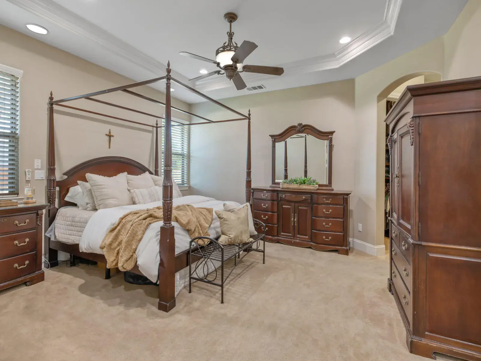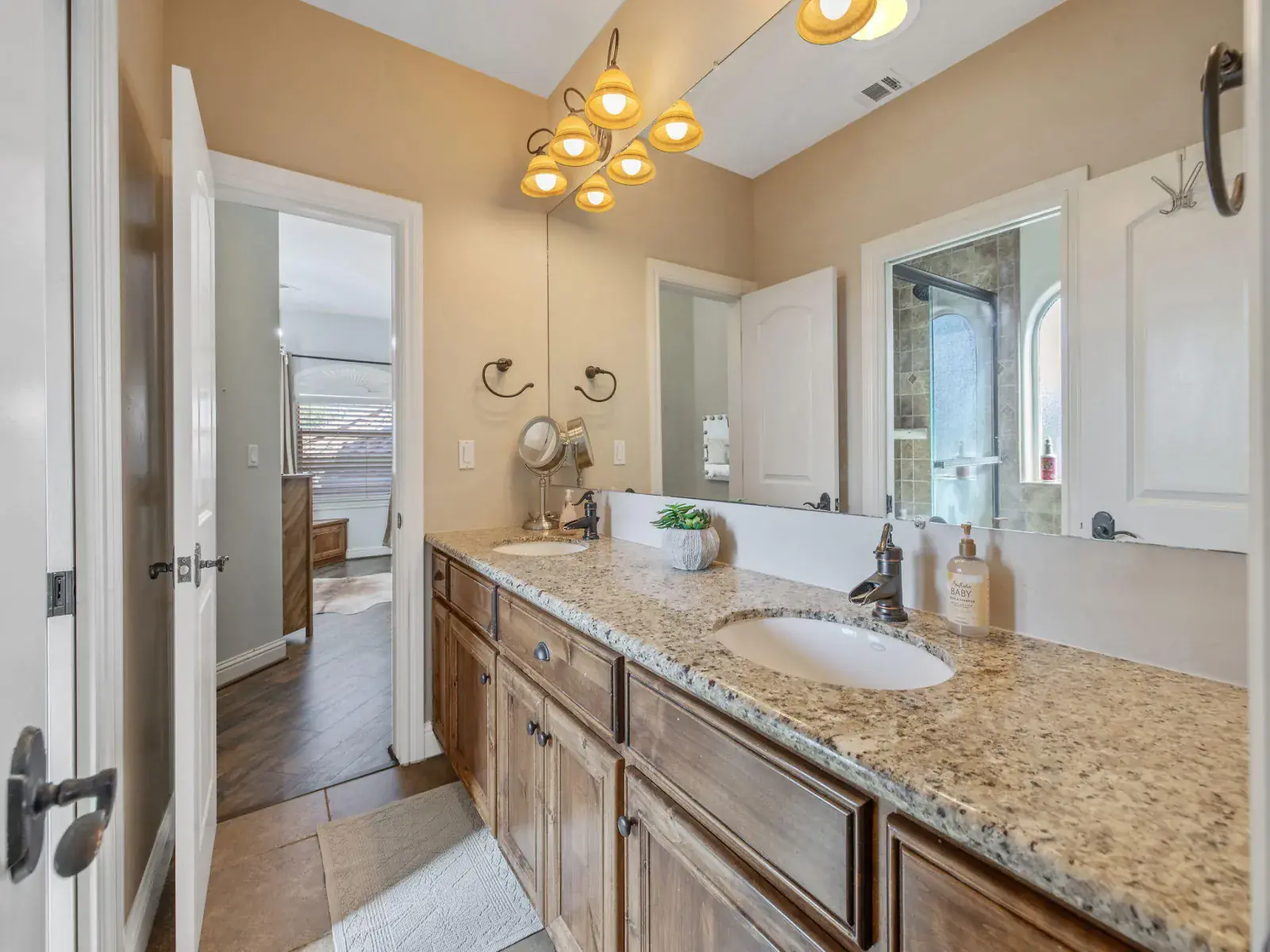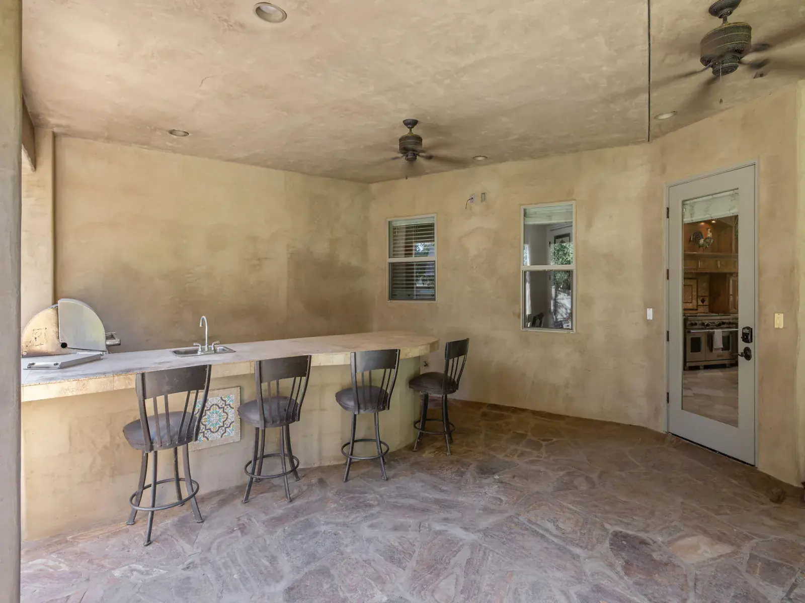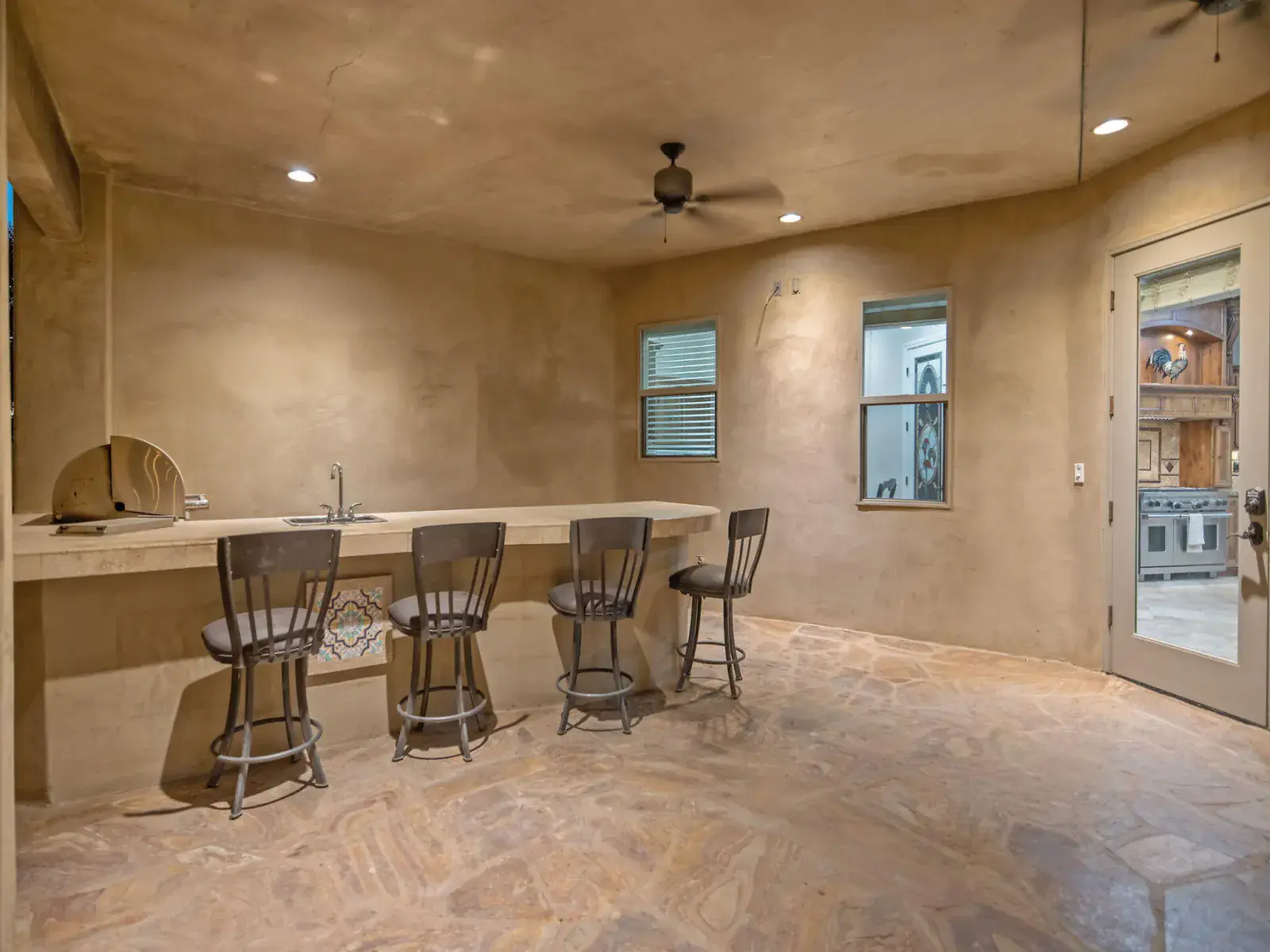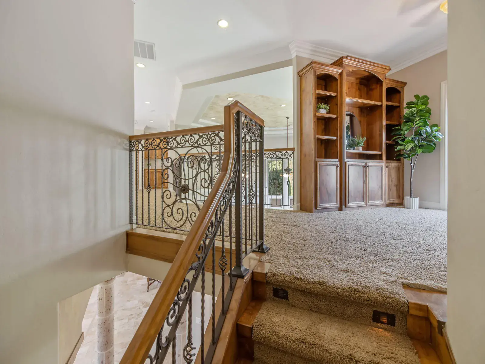 Gorgeous, luxurious estate situated on 1.28 Acres in prime SW Visalia location! Located in the highly desirable rural corridor between NE Tulare and SW Visalia, this custom 5 bed, 3.5 bath luxury home offers a country setting, conveniently located near schools, shopping, and all the amenities. Beyond the private and circle drive, custom wrought iron entry doors into formal entry with two story ceilings, Cantera stone pillars imported from Mexico, and travertine floors. The great room features 20′ ceilings, a wall of windows, wood-burning fireplace, hand-scraped hickory floors, and custom built-in entertainment. Showstopping chef’s kitchen is with two islands, granite countertops, Sub-Zero fridge, Wolf range with double ovens, Butler’s pantry, Knotty Alder cabinetry, under-cabinet lighting, and custom stained glass details. A built-in desk sits just off the kitchen, along with a spacious laundry room and mudroom with built-in bench leading to the 4-car garage. The luxurious ground-floor primary suite features a sitting area, his and hers walk-in closets, French doors to a private patio with above-ground jacuzzi, and spa-like bath with marble countertops and tub surround. A private office (or 5th bedroom) and powder bath with outdoor access round out the main level. Upstairs, a landing with built-in desks and shelves, three spacious bedrooms (Jack & Jill + en suite), a bonus/game room (room for air hockey table, as shown, and more!) with French doors to a deck overlooking the backyard, and a custom home theater with projector, screen, seating, and storage. Outdoors, enjoy an entertainer’s dream setup: covered patio, outdoor kitchen with built-in grill, fridge, gas cooktop, and serving space. The beautifully landscaped yard features mature trees for shade and privacy. Around the property, discover fruit trees (pomegranate, lemon, lime, persimmon, and more), RV parking, chicken coop, dog run, and even an in-ground deep pit. Truly one-of-a-kind home – must see!