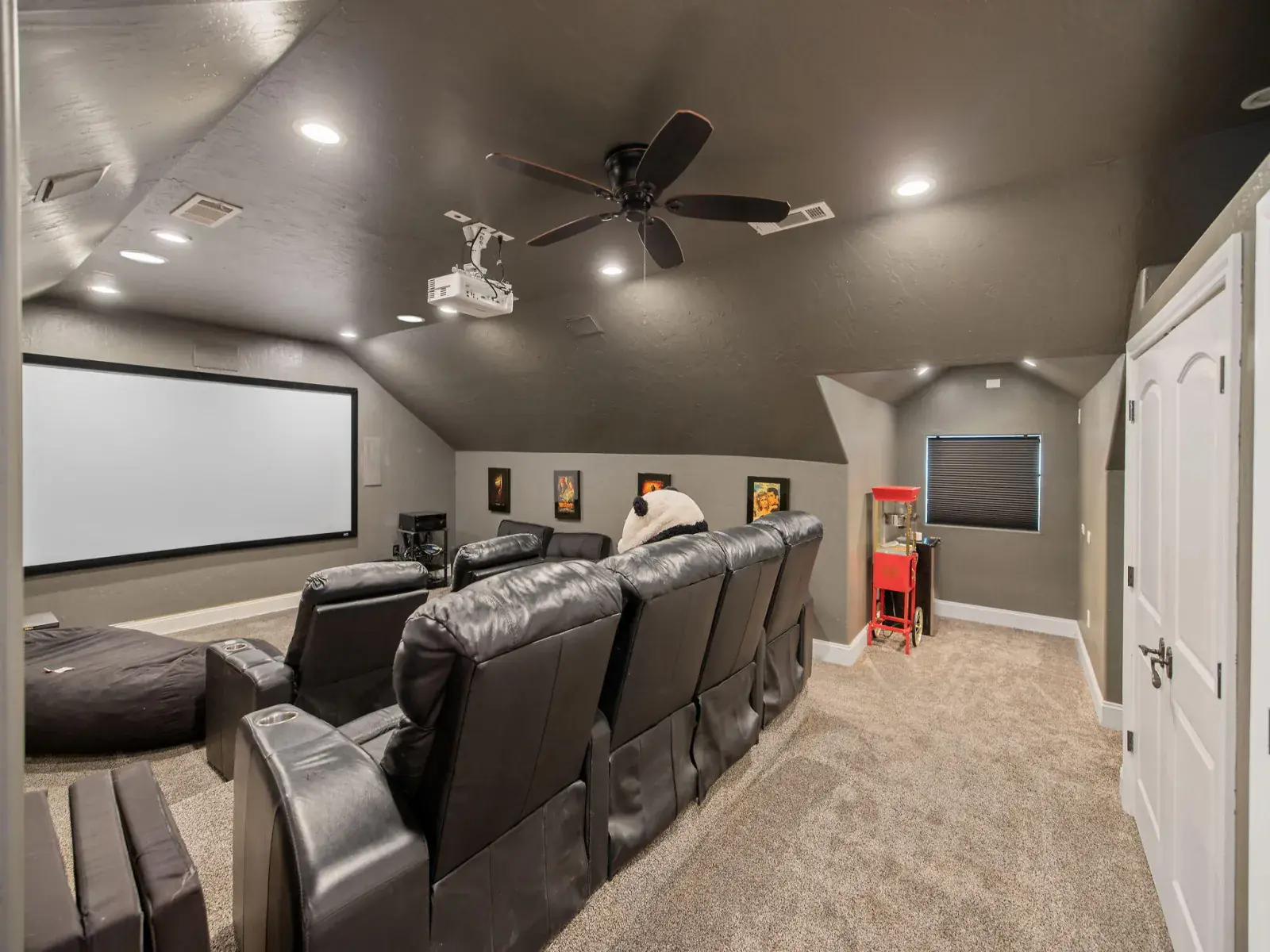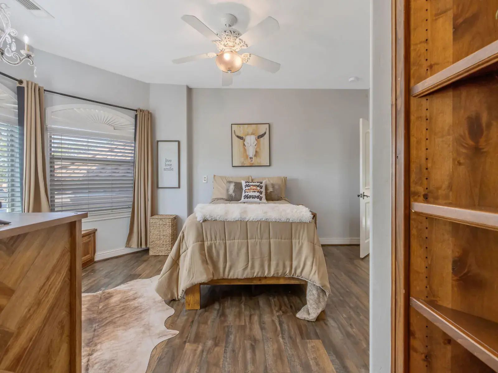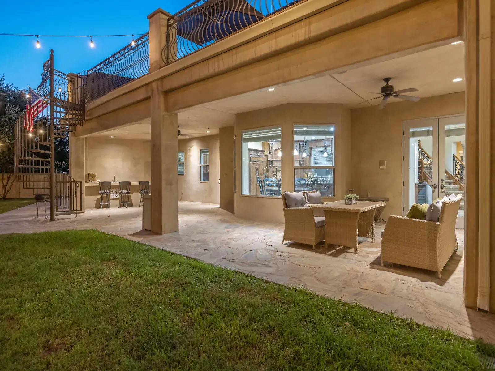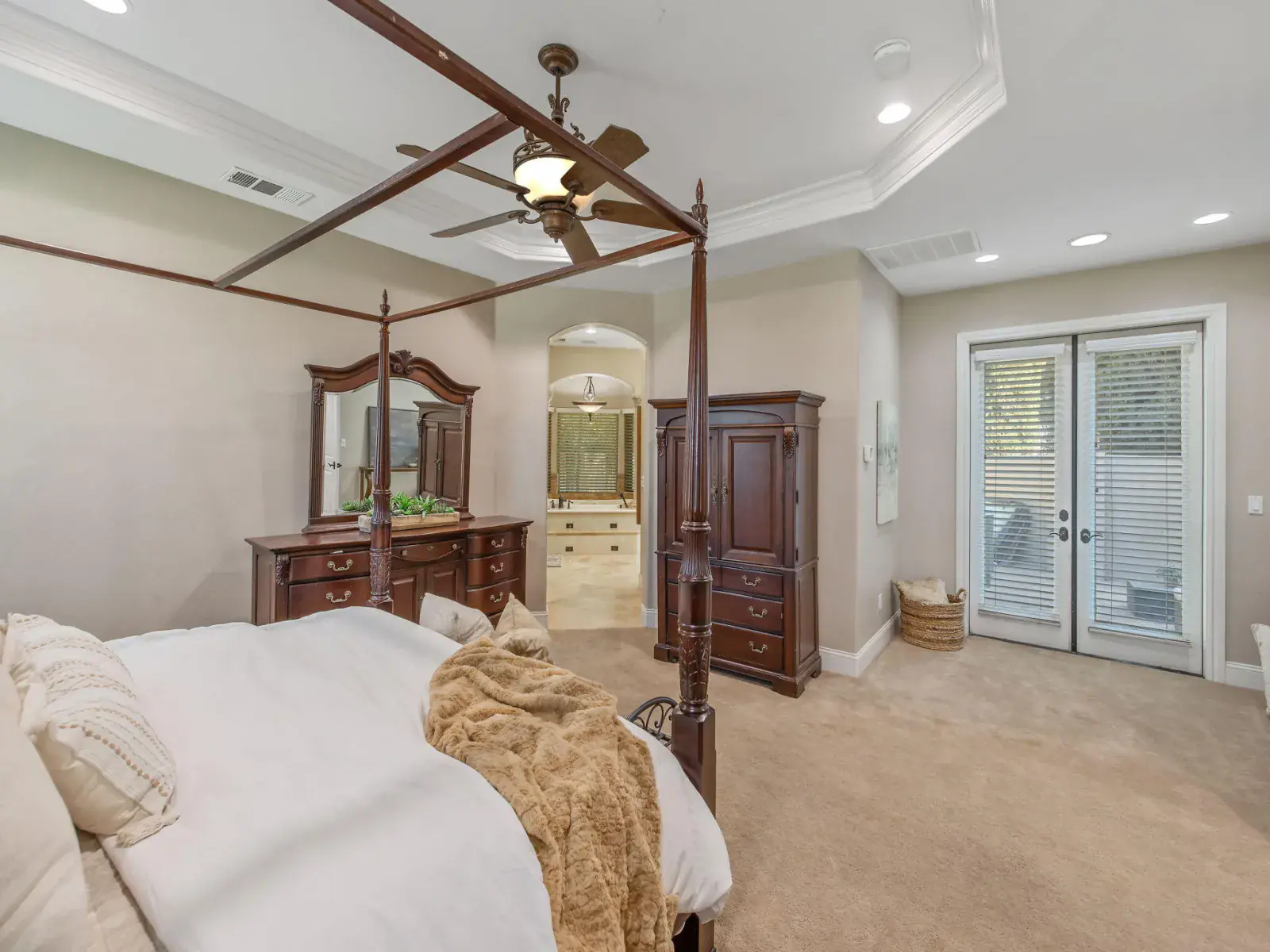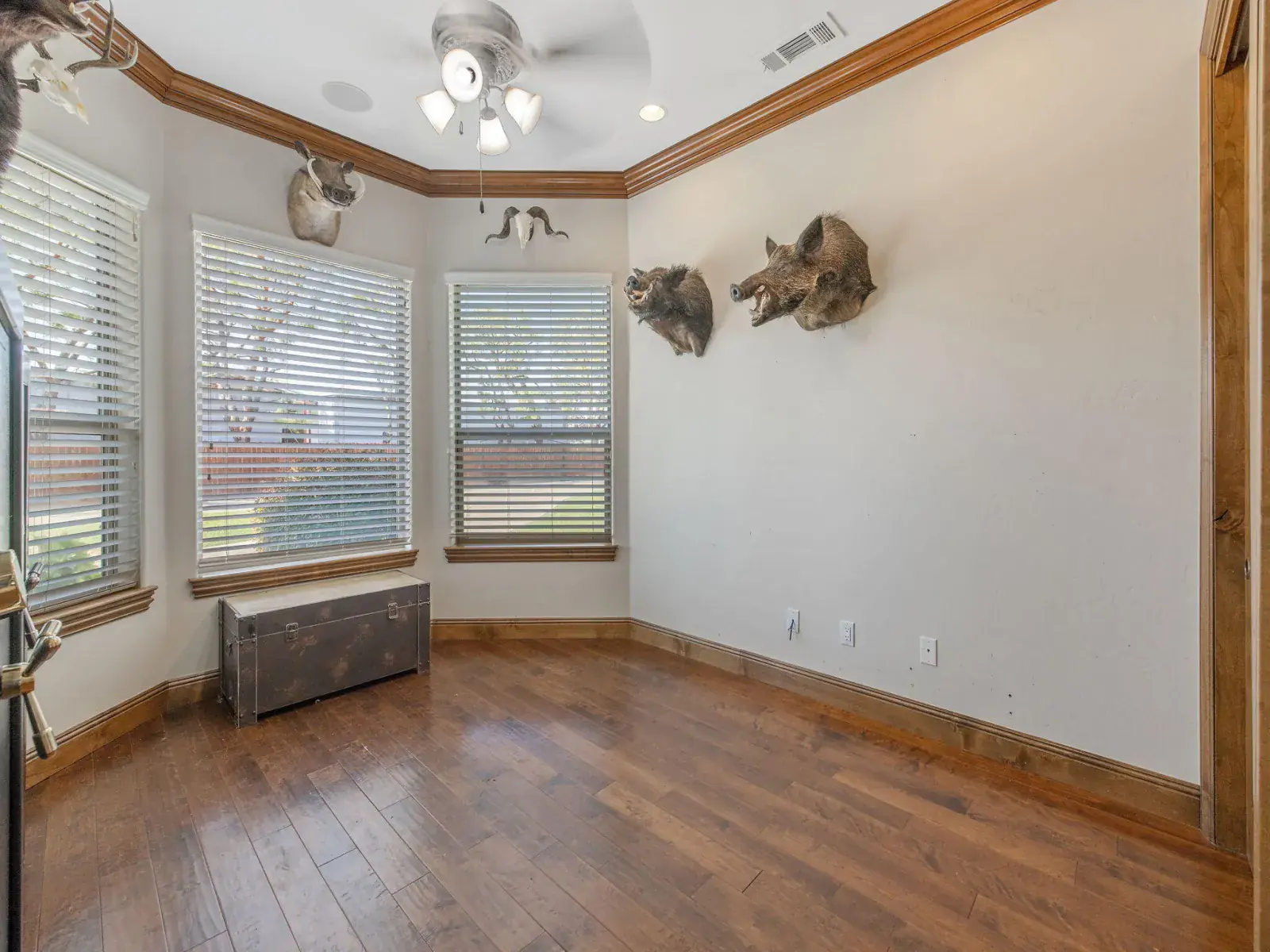 Gorgeous, luxurious estate situated on 1.28 Acres in prime SW Visalia location! Located in the highly desirable rural corridor between NE Tulare and SW Visalia, this custom 5 bed, 3.5 bath luxury home offers a country setting, conveniently located near schools, shopping, and all the amenities. Beyond the private and circle drive, custom wrought iron entry doors into formal entry with two story ceilings, Cantera stone pillars imported from Mexico, and travertine floors. The great room features 20′ ceilings, a wall of windows, wood-burning fireplace, hand-scraped hickory floors, and custom built-in entertainment. Showstopping chef’s kitchen is with two islands, granite countertops, Sub-Zero fridge, Wolf range with double ovens, Butler’s pantry, Knotty Alder cabinetry, under-cabinet lighting, and custom stained glass details. A built-in desk sits just off the kitchen, along with a spacious laundry room and mudroom with built-in bench leading to the 4-car garage. The luxurious ground-floor primary suite features a sitting area, his and hers walk-in closets, French doors to a private patio with above-ground jacuzzi, and spa-like bath with marble countertops and tub surround. A private office (or 5th bedroom) and powder bath with outdoor access round out the main level. Upstairs, a landing with built-in desks and shelves, three spacious bedrooms (Jack & Jill + en suite), a bonus/game room (room for air hockey table, as shown, and more!) with French doors to a deck overlooking the backyard, and a custom home theater with projector, screen, seating, and storage. Outdoors, enjoy an entertainer’s dream setup: covered patio, outdoor kitchen with built-in grill, fridge, gas cooktop, and serving space. The beautifully landscaped yard features mature trees for shade and privacy. Around the property, discover fruit trees (pomegranate, lemon, lime, persimmon, and more), RV parking, chicken coop, dog run, and even an in-ground deep pit. Truly one-of-a-kind home – must see!