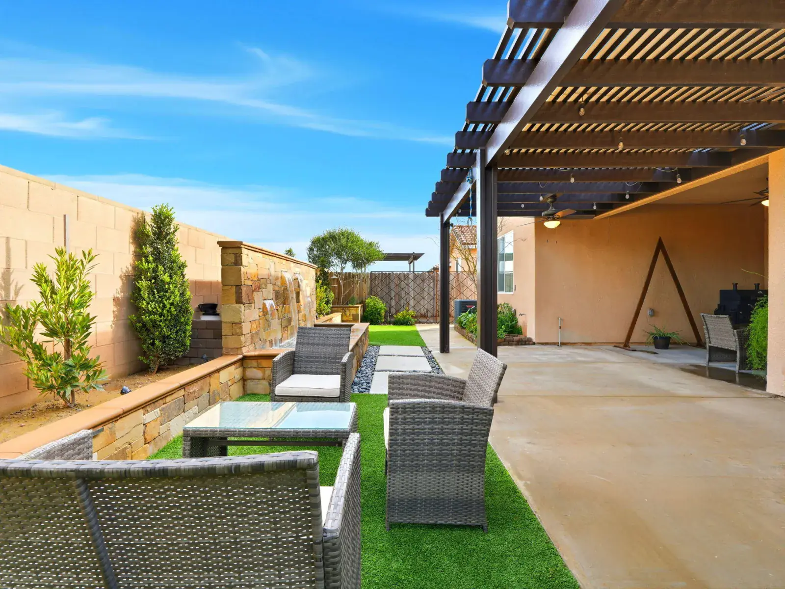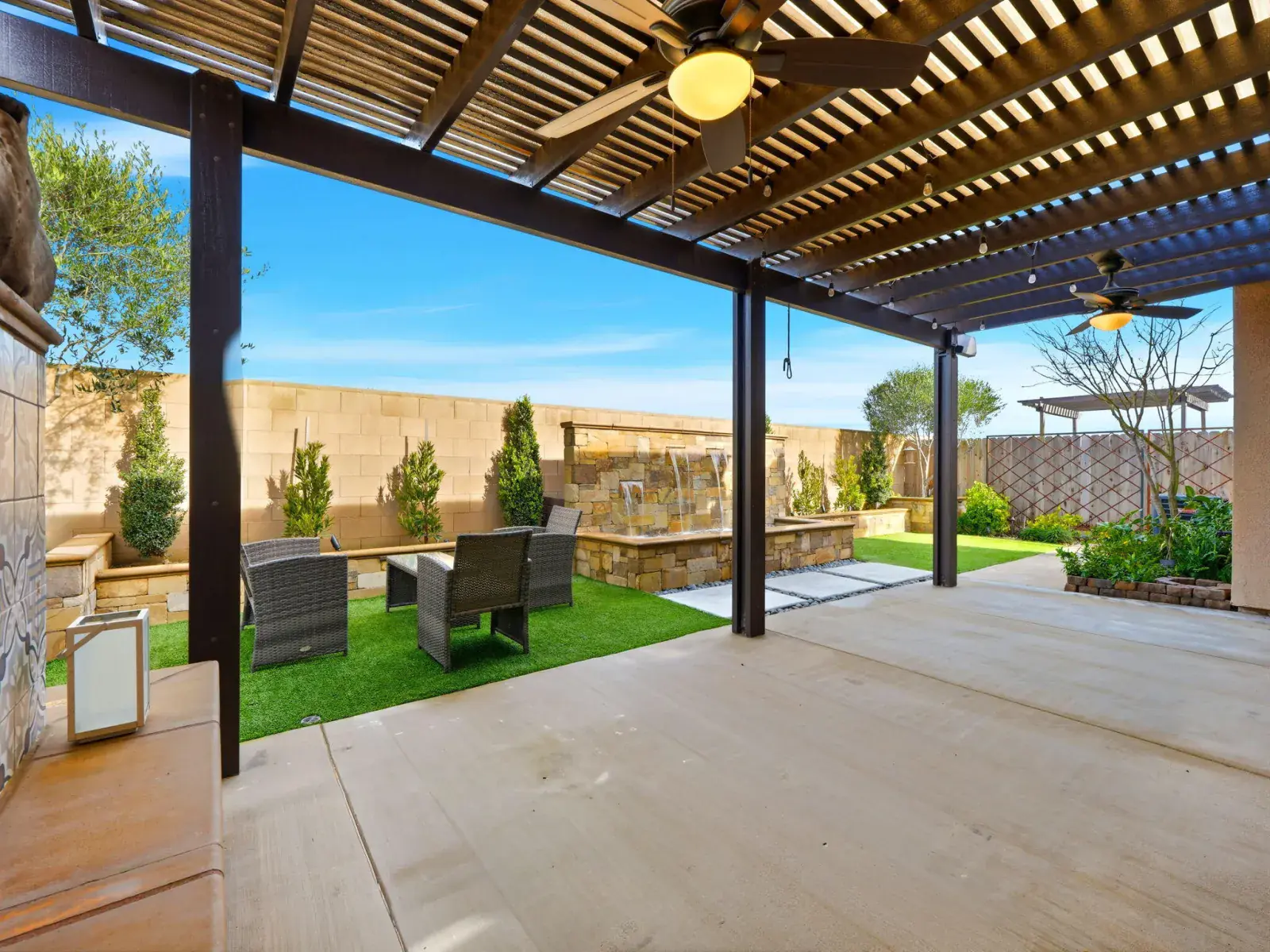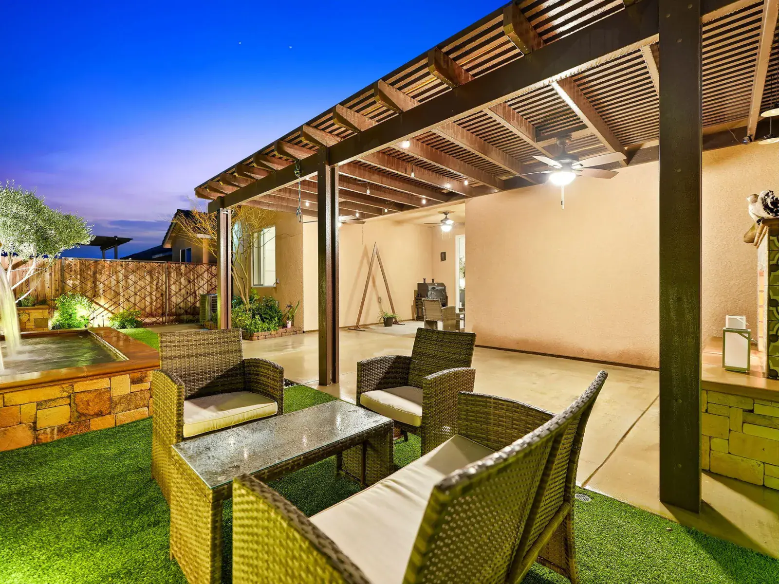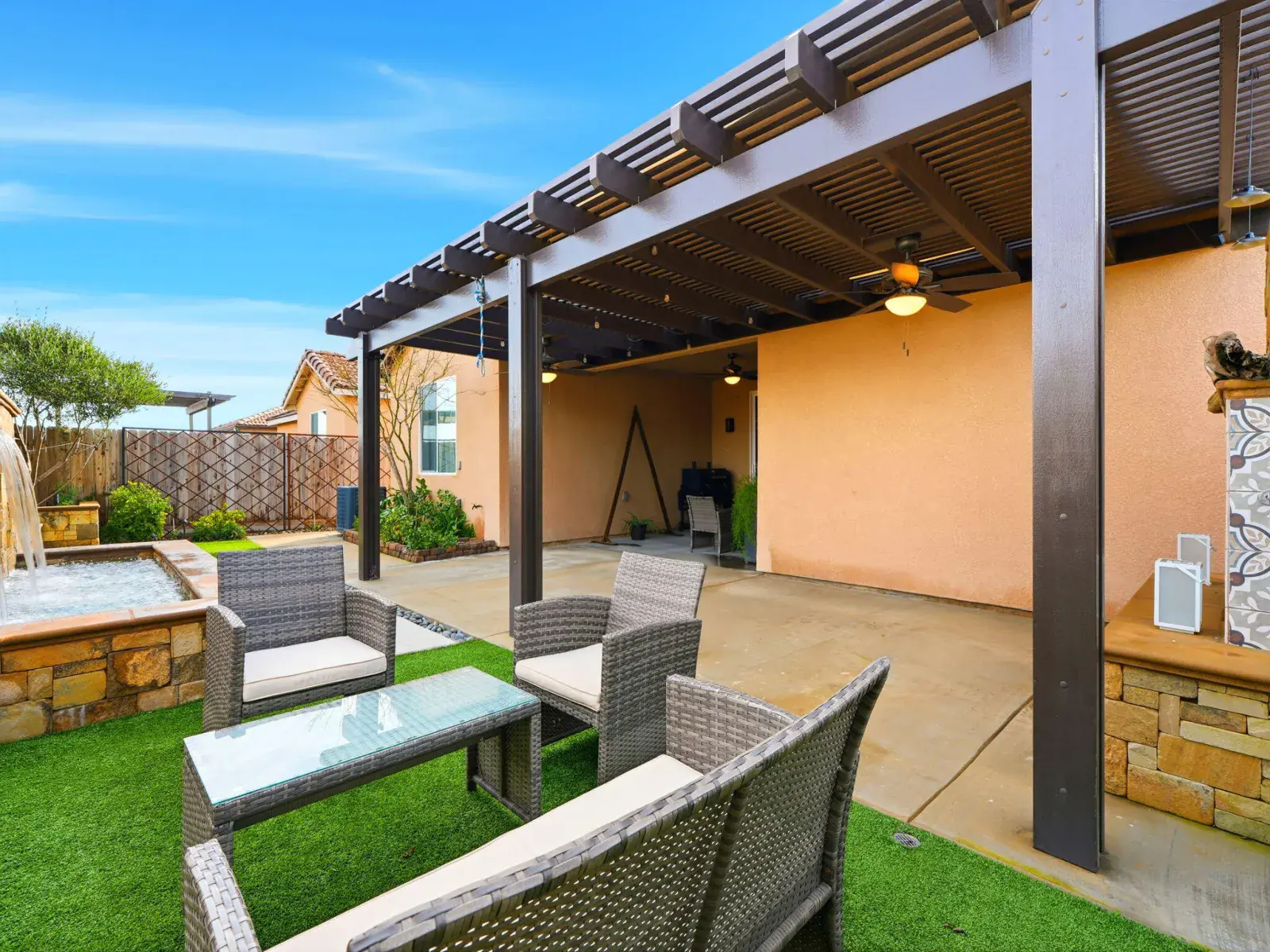 Welcome home to a standout property in NW Visalia where privacy, style, and convenience come together. Located in the gated Ashton Park community in the desirable 93291 zip code, this updated 3 bedroom, 2 bathroom, 1,426 sq ft single family home sits on a cul-de-sac, not on a main road, with no homes behind it and no random foot traffic or door knockers. The home is within the Denton Elementary School district and surrounded by walking, running, and biking paths, with a new Costco currently under construction within walking distance. Inside, recent updates include fresh modern paint within the last six months, upgraded black door hardware, accent walls in all three bedrooms, updated light fixtures, and new ceiling fans throughout, plus a whole house fan for added efficiency. The modern kitchen flows into the dining area with matching tile flooring, and both bathrooms have been updated with individual mirrors, new faucets, and gold and black accents. The home is prewired for surround sound and offers Alexa and app based smart control for multiple functions, including the backyard waterfall. Storage is well designed with custom shelving in secondary bedroom closets, a walk-in primary closet with custom shelving and extra space ideal for a small office or vanity, and decorative open shelving in the laundry room. The fully finished, low maintenance backyard features turf landscaping, olive trees, a built-in water fountain and outdoor fireplace, landscape lighting front and back, paved walkways around the home, and three outdoor ceiling fans under the pergola, along with updated exterior lighting. Additional highlights include a two car garage, a $95 per month solar lease that covers all electricity usage year round, and an HOA that maintains the front yard, parks, streets, and gated access, making this Ashton Park home an exceptional lifestyle opportunity.