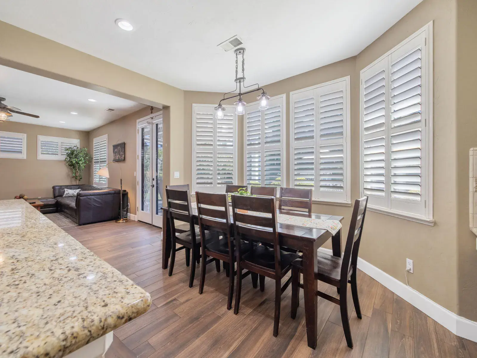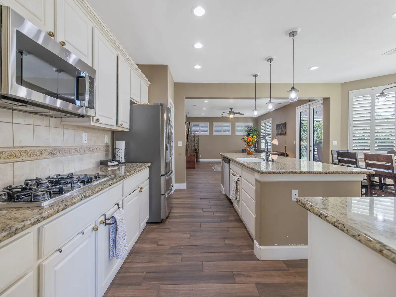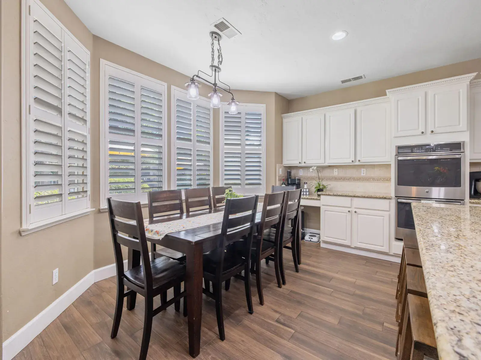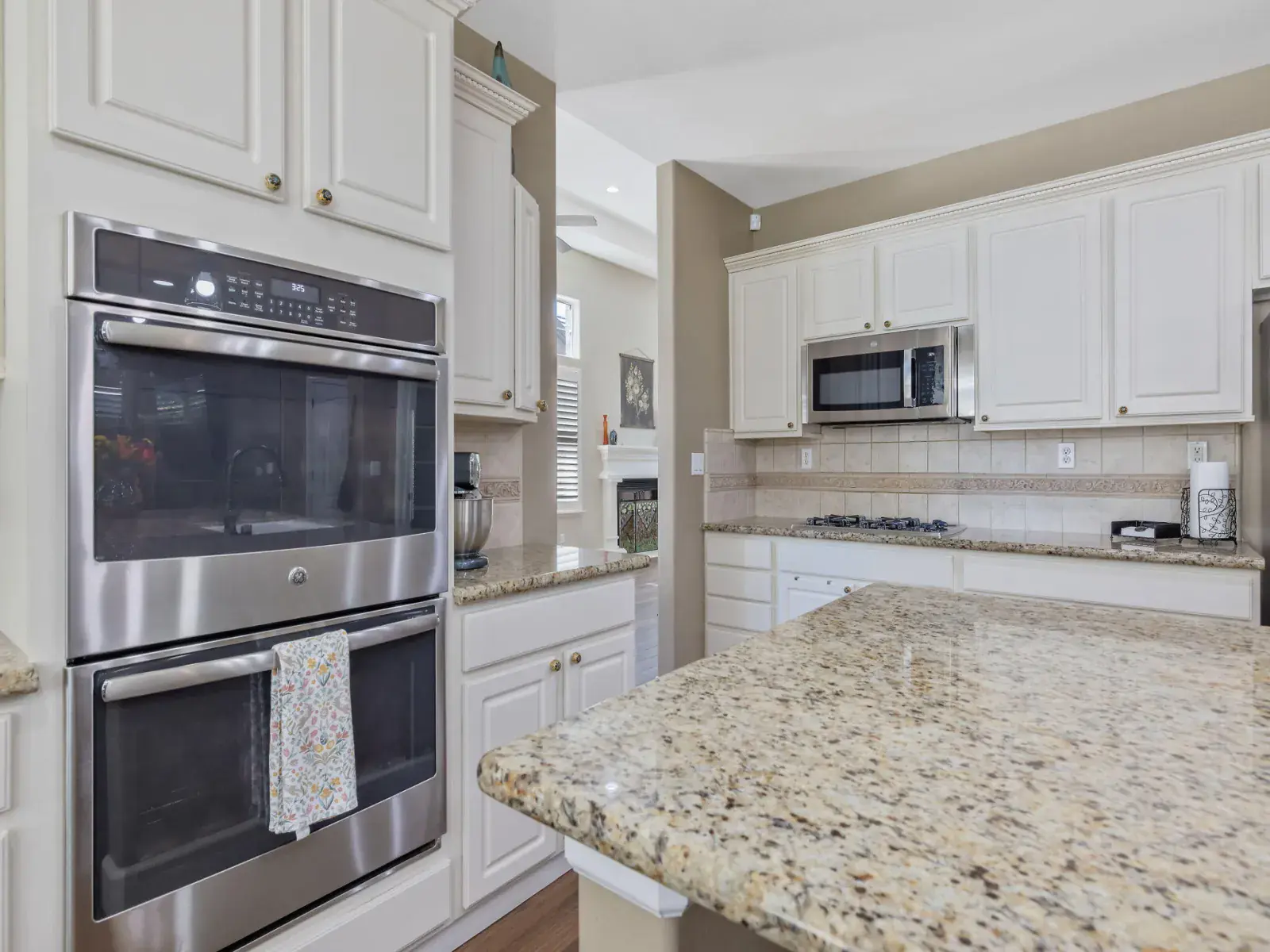 The spacious, open-concept kitchen is ideal for entertaining, featuring granite countertops, a center island, double ovens, and a charming breakfast nook with large windows overlooking the backyard. The formal living and dining areas are filled with natural light and highlighted by a cozy fireplace and elegant French doors that open to the outdoor space.