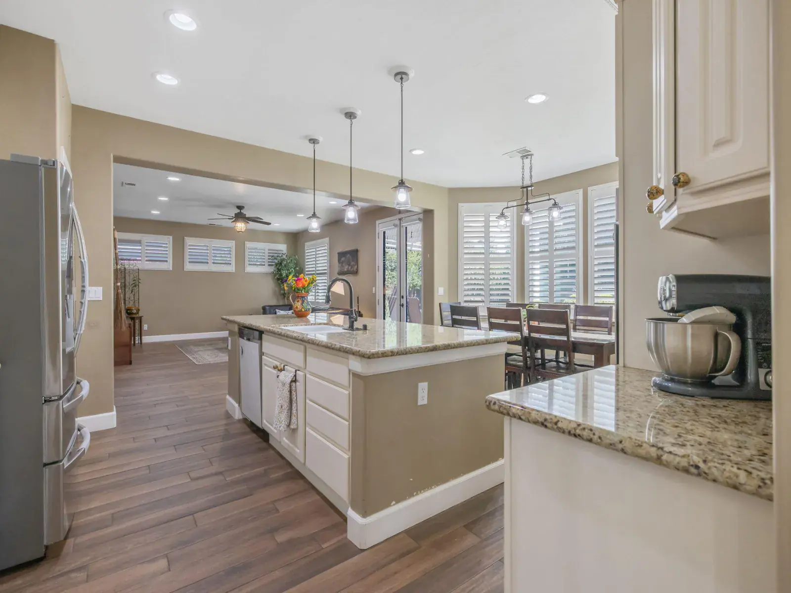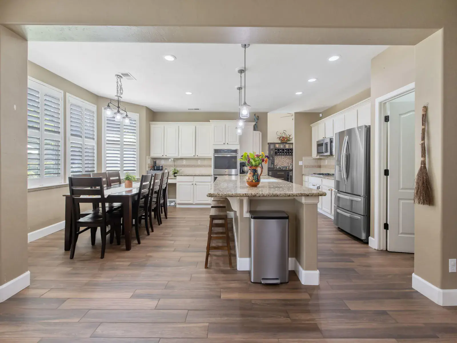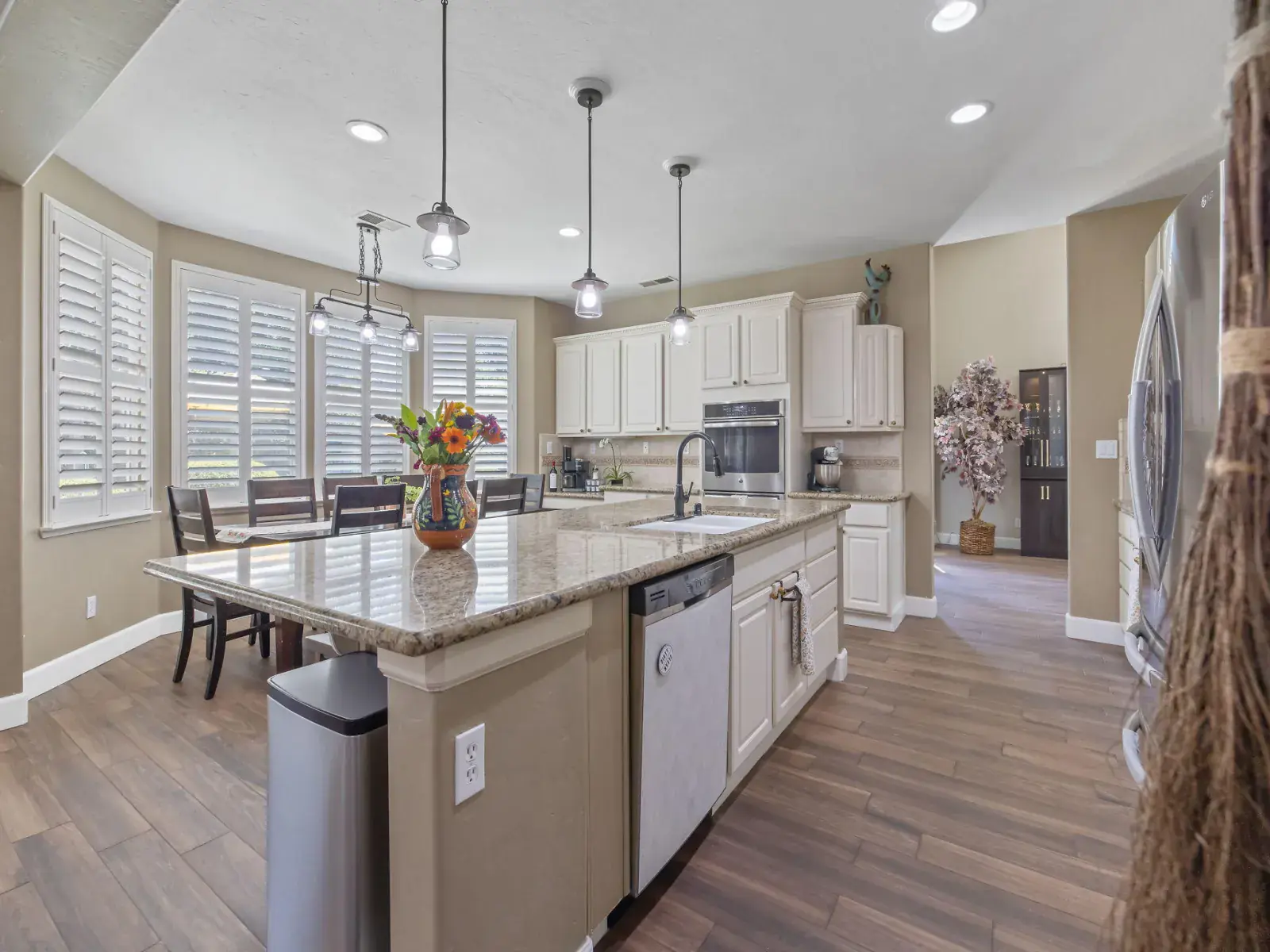 The spacious, open-concept kitchen is ideal for entertaining, featuring granite countertops, a center island, double ovens, and a charming breakfast nook with large windows overlooking the backyard. The formal living and dining areas are filled with natural light and highlighted by a cozy fireplace and elegant French doors that open to the outdoor space.
