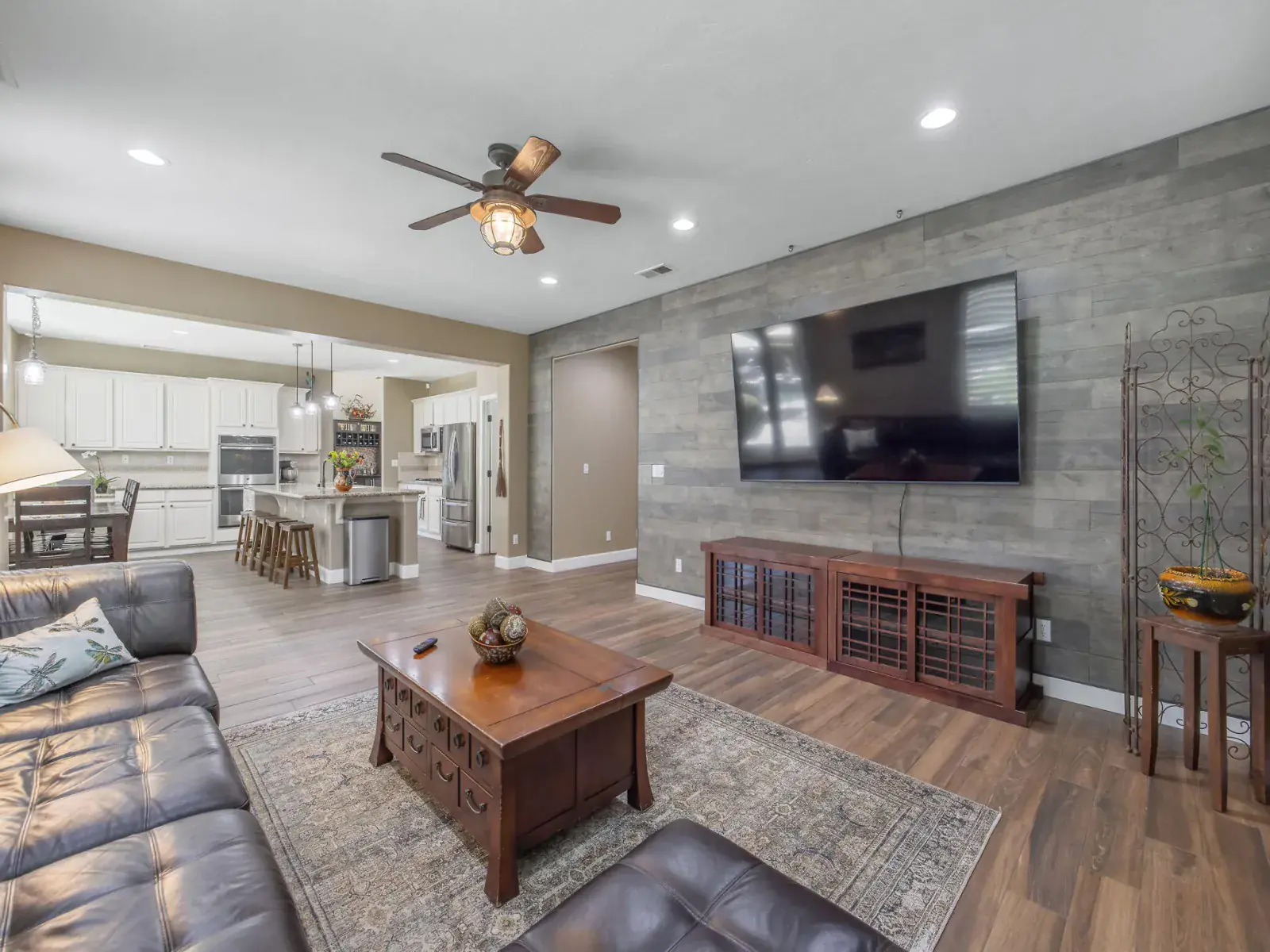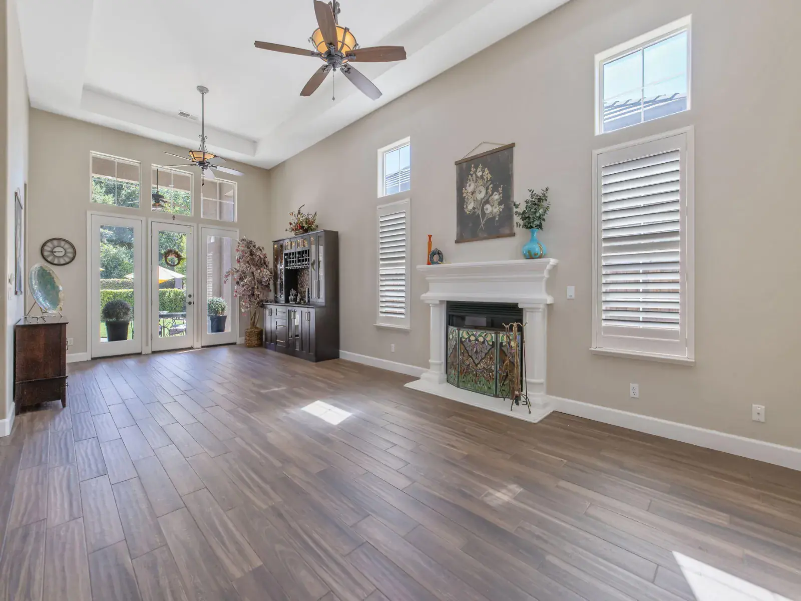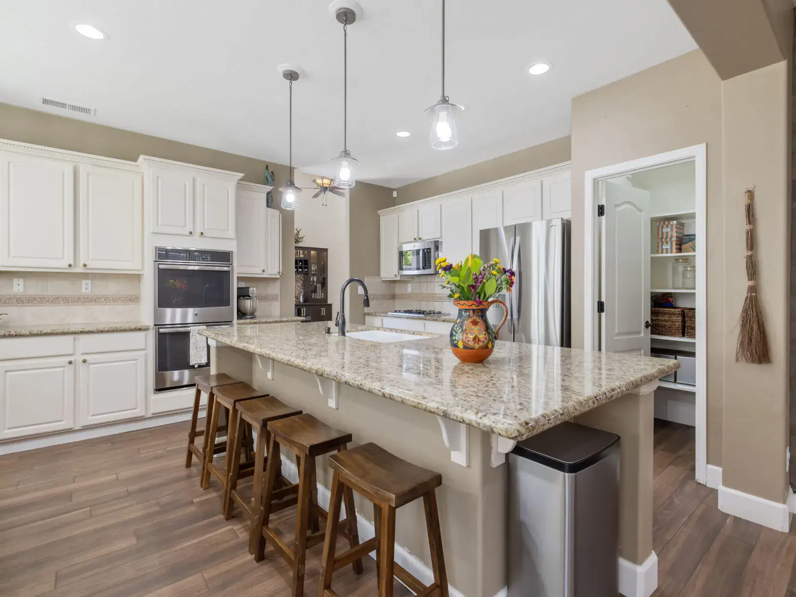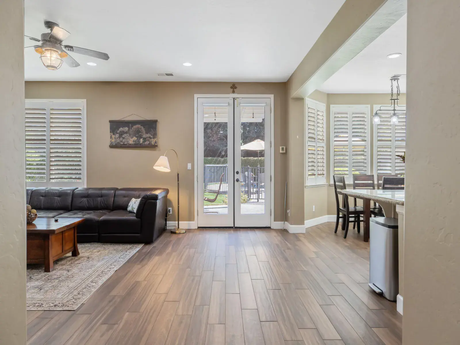 The spacious, open-concept kitchen is ideal for entertaining, featuring granite countertops, a center island, double ovens, and a charming breakfast nook with large windows overlooking the backyard. The formal living and dining areas are filled with natural light and highlighted by a cozy fireplace and elegant French doors that open to the outdoor space.