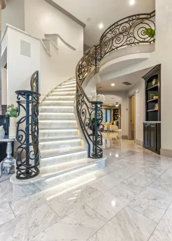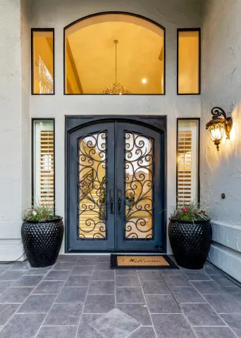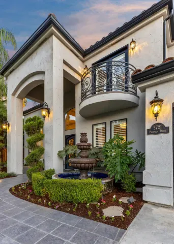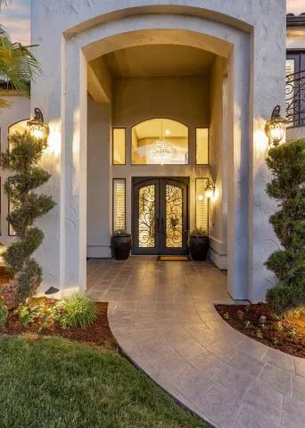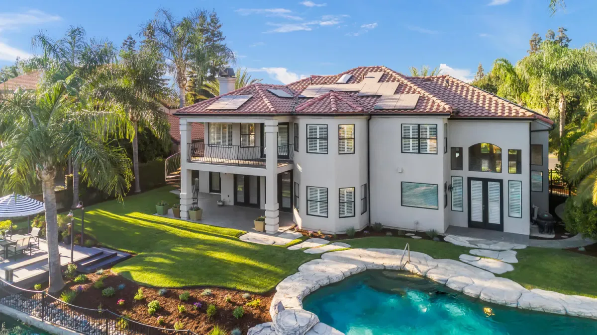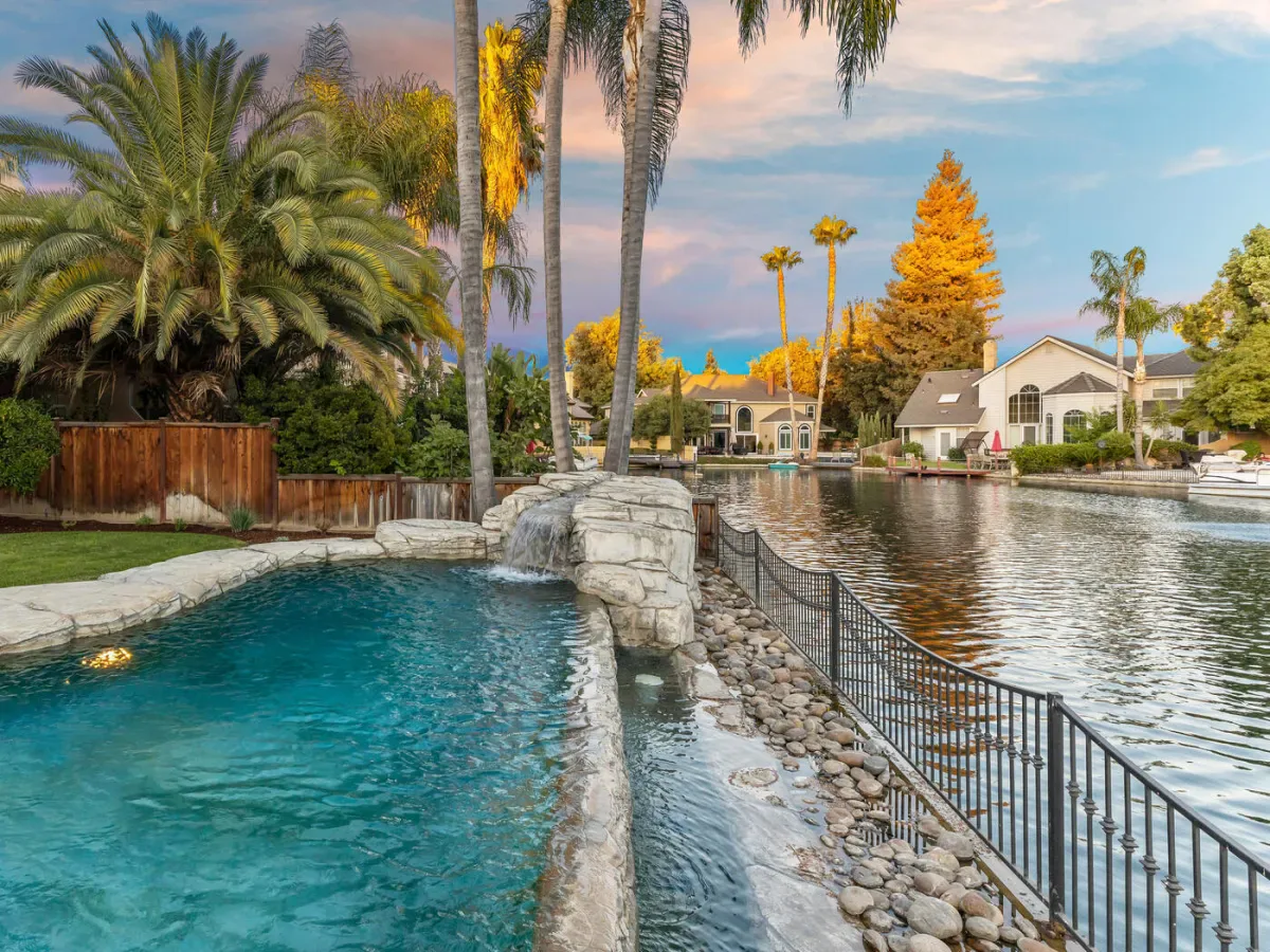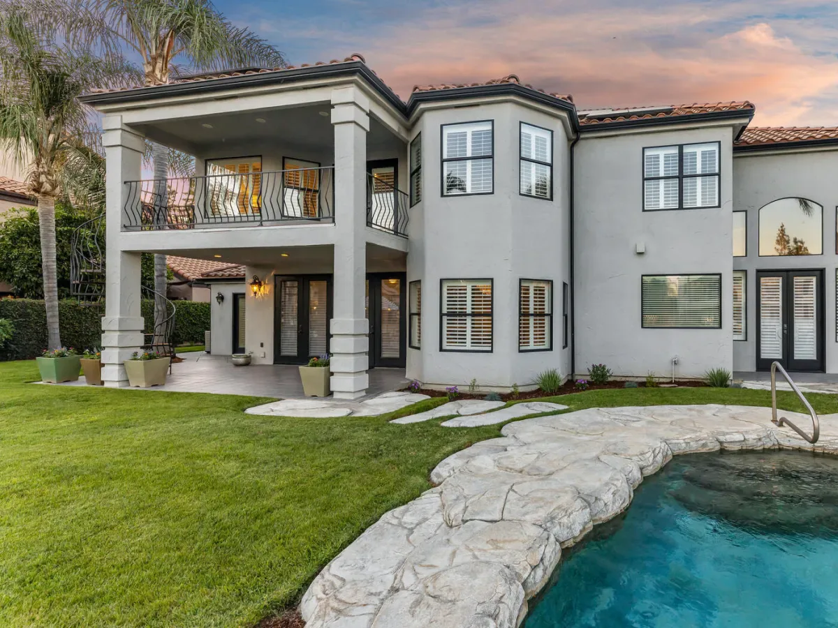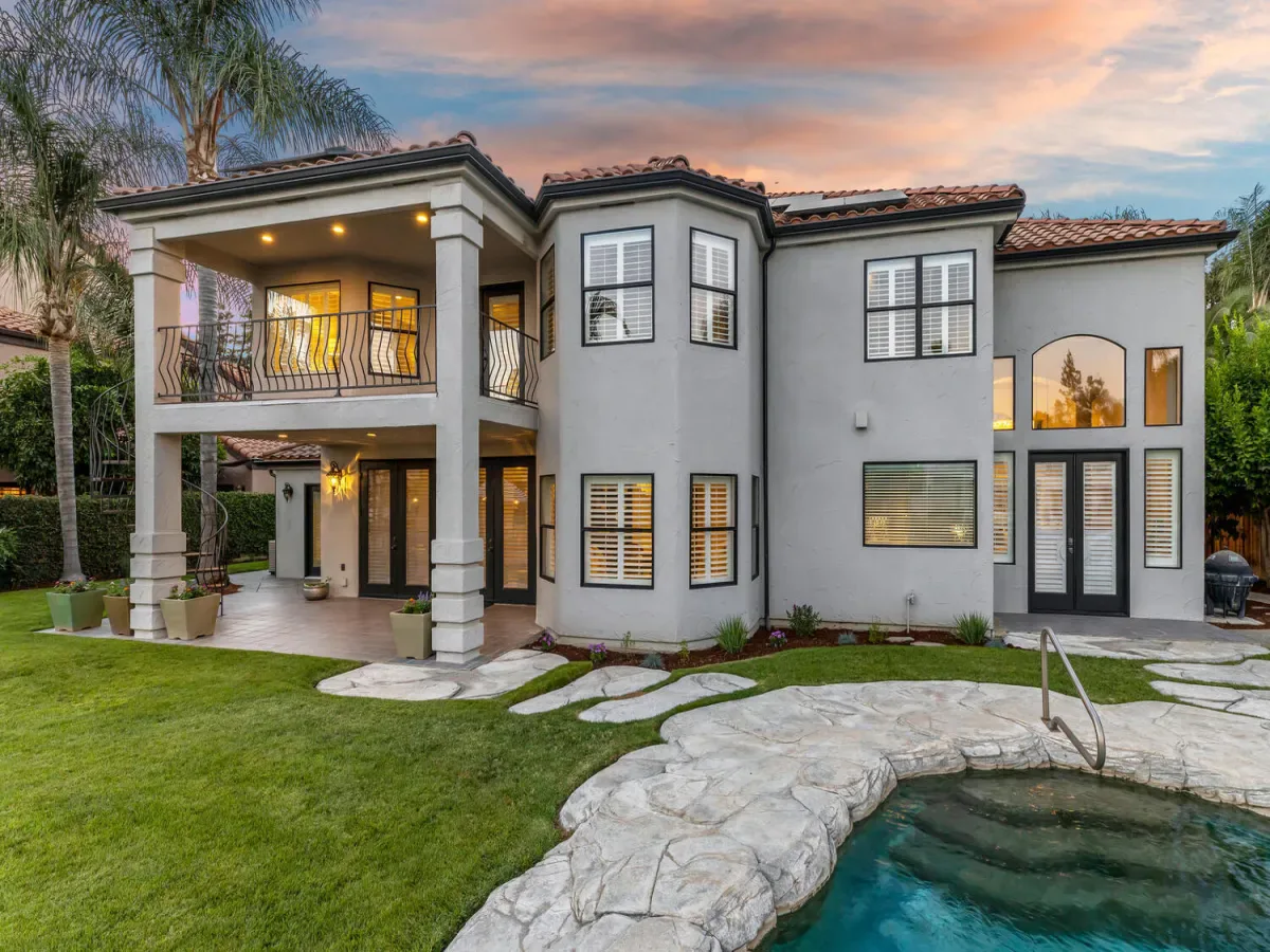 Located in one of the most coveted neighborhoods in Visalia- The Lakes, in north west Visalia, this staggering home has been masterfully crafted for absolute glamour and comfort. The magnificent foyer captivates with its wrought iron lined grand staircase- made to match the substantial front door, Calcutta marble flooring, limestone pillars, and a spectacular modern chandelier that dazzles. This home is lined with an ample amount of windows accompanied by custom wooden shutters to provide access to abundant sunlight when desired. Custom cabinetry with beautiful finishes complement the elegant visual while curating a calming, resort style living experience. The state of the art kitchen consists of a Wolf stove, a stunning glass fronted SubZero fridge, and digital JennAir microwave and oven for the utmost convenience. Upstairs, the primary bedroom evokes pure tranquility with its splendid dark wood flooring, substantial walk-in closet with custom shelving, and grandiose balcony that overlooks the stunning lake view. Outside, the resort-inspired backyard features a stone lined infinity pool that seems to flow into the remarkable man-made lake, lush landscaping equipped with citrus trees, a well shaded gazebo with extensive grilling space with a pizza oven as well as a bar area, and a wooden deck, perfect for entertaining, with its ample lighting and camouflaged outdoor speakers. The boat that comes with the property is perfect for warm sunset time cruises along the water, as well as catch and release fishing when so desired. Drenched in the finest materials and appliances, chandeliers galore, and unparalleled views- this is a beyond spectacular opportunity in Visalia’s exclusive, 24/7 guard gated neighborhood of the Lakes.