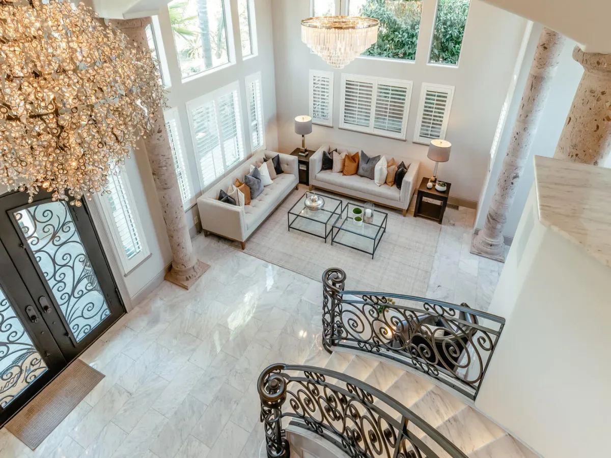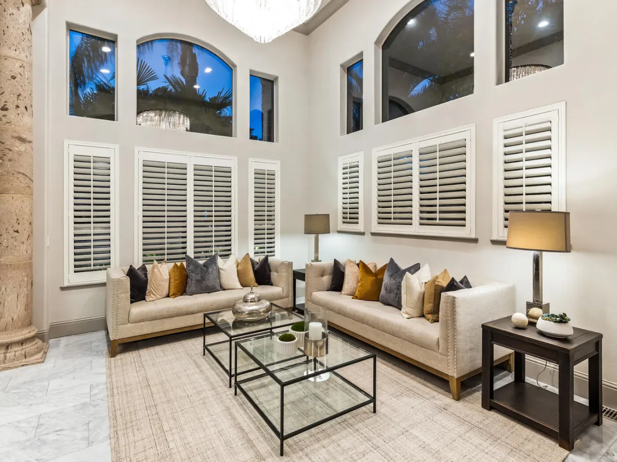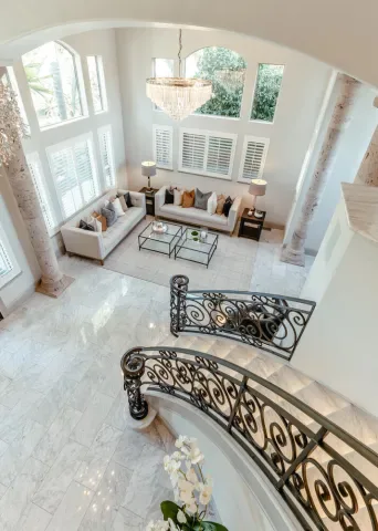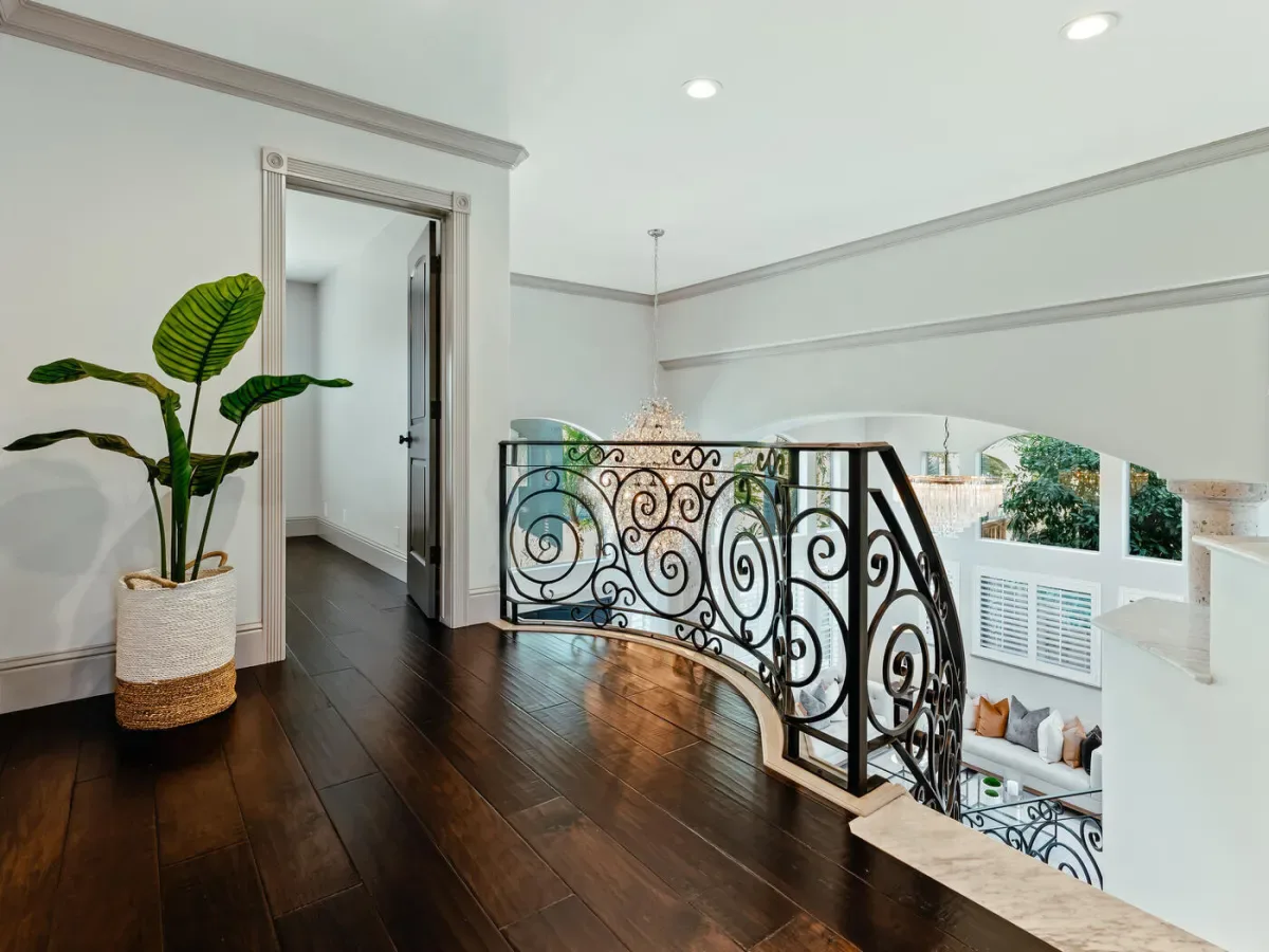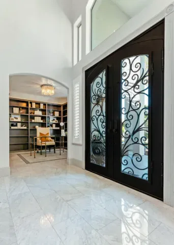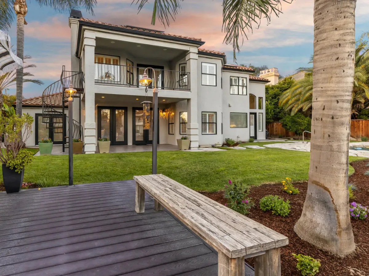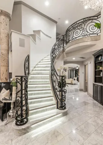 Located in one of the most coveted neighborhoods in Visalia- The Lakes, in north west Visalia, this staggering home has been masterfully crafted for absolute glamour and comfort. The magnificent foyer captivates with its wrought iron lined grand staircase- made to match the substantial front door, Calcutta marble flooring, limestone pillars, and a spectacular modern chandelier that dazzles. This home is lined with an ample amount of windows accompanied by custom wooden shutters to provide access to abundant sunlight when desired. Custom cabinetry with beautiful finishes complement the elegant visual while curating a calming, resort style living experience. The state of the art kitchen consists of a Wolf stove, a stunning glass fronted SubZero fridge, and digital JennAir microwave and oven for the utmost convenience. Upstairs, the primary bedroom evokes pure tranquility with its splendid dark wood flooring, substantial walk-in closet with custom shelving, and grandiose balcony that overlooks the stunning lake view. Outside, the resort-inspired backyard features a stone lined infinity pool that seems to flow into the remarkable man-made lake, lush landscaping equipped with citrus trees, a well shaded gazebo with extensive grilling space with a pizza oven as well as a bar area, and a wooden deck, perfect for entertaining, with its ample lighting and camouflaged outdoor speakers. The boat that comes with the property is perfect for warm sunset time cruises along the water, as well as catch and release fishing when so desired. Drenched in the finest materials and appliances, chandeliers galore, and unparalleled views- this is a beyond spectacular opportunity in Visalia’s exclusive, 24/7 guard gated neighborhood of the Lakes.