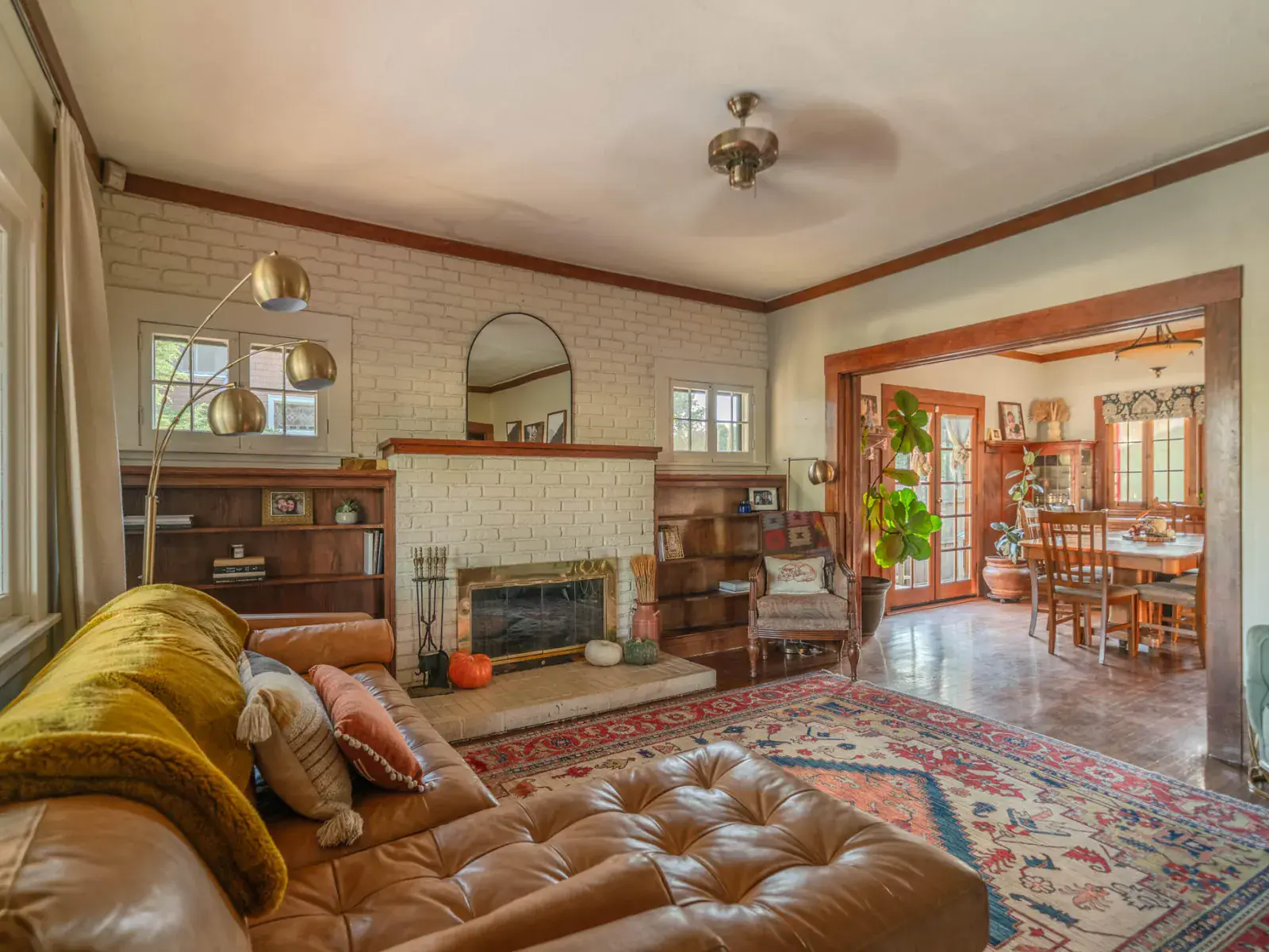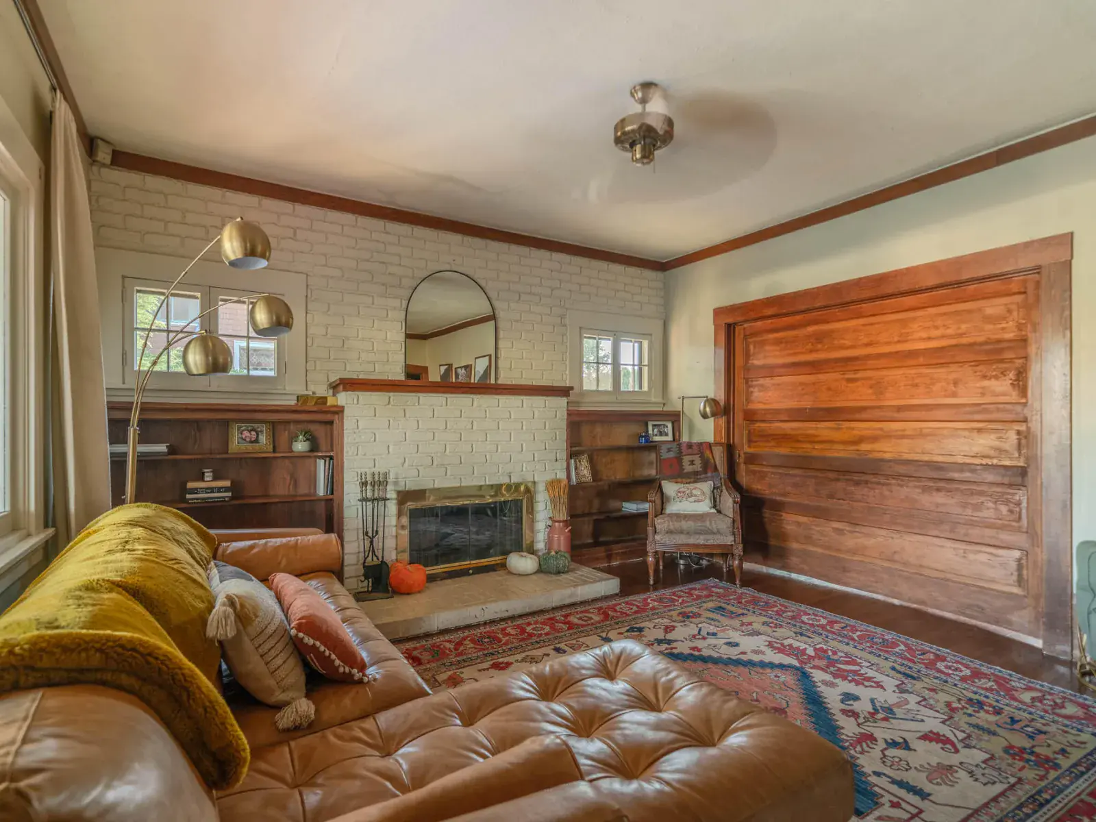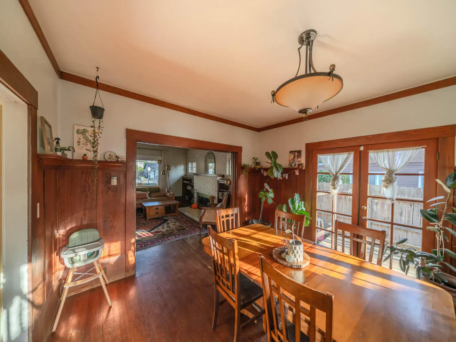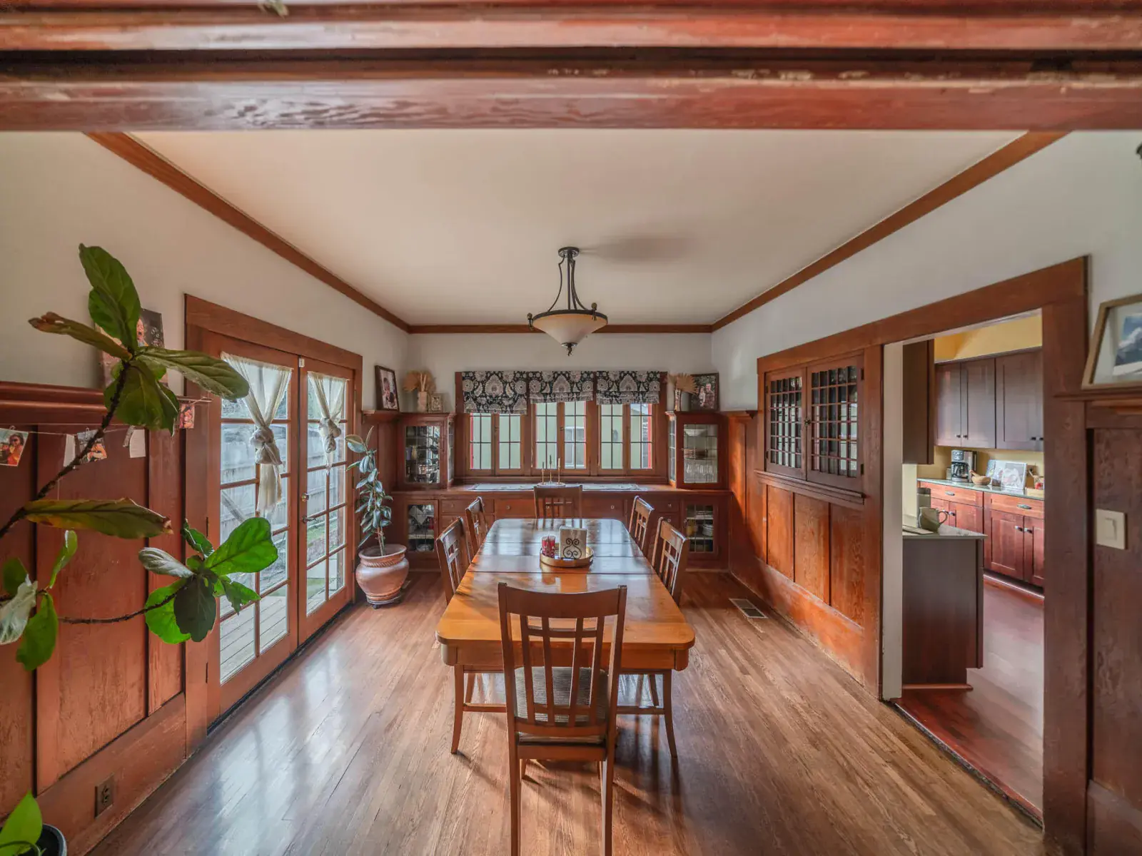 Inside, the home is a celebration of vintage craftsmanship, highlighted by rich, original wood trim and hardwood floors throughout the main living areas. The spacious dining room is perfect for hosting, featuring beautiful built-in wood hutches and french doors leading to the exterior. The cozy living room is anchored by a brick fireplace, flanked by built-in bookshelves, offering a warm and inviting atmosphere.