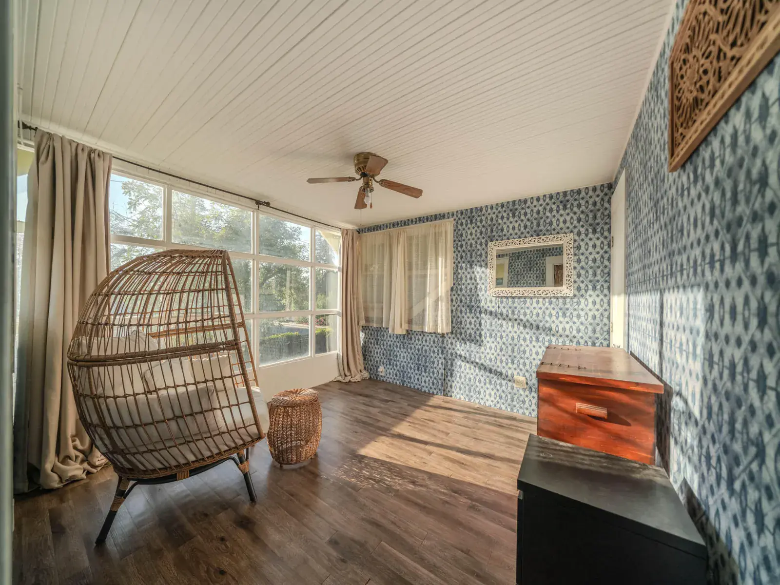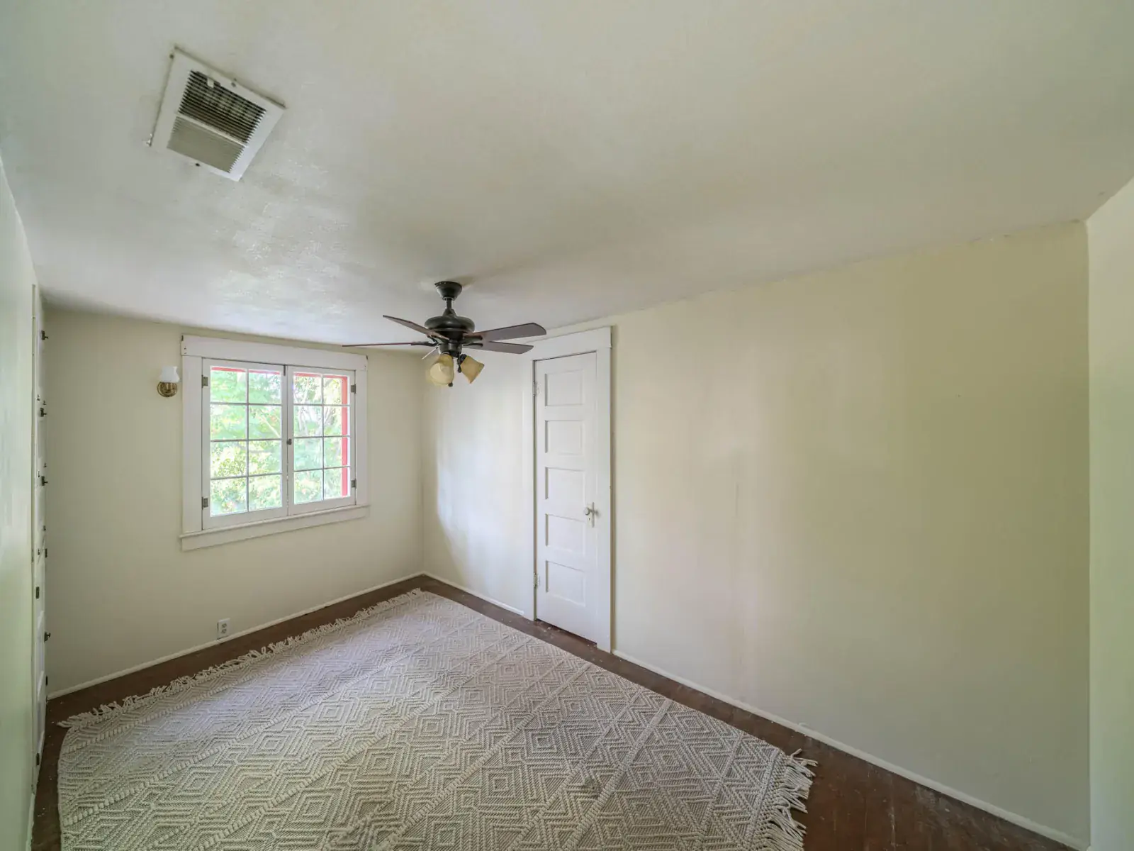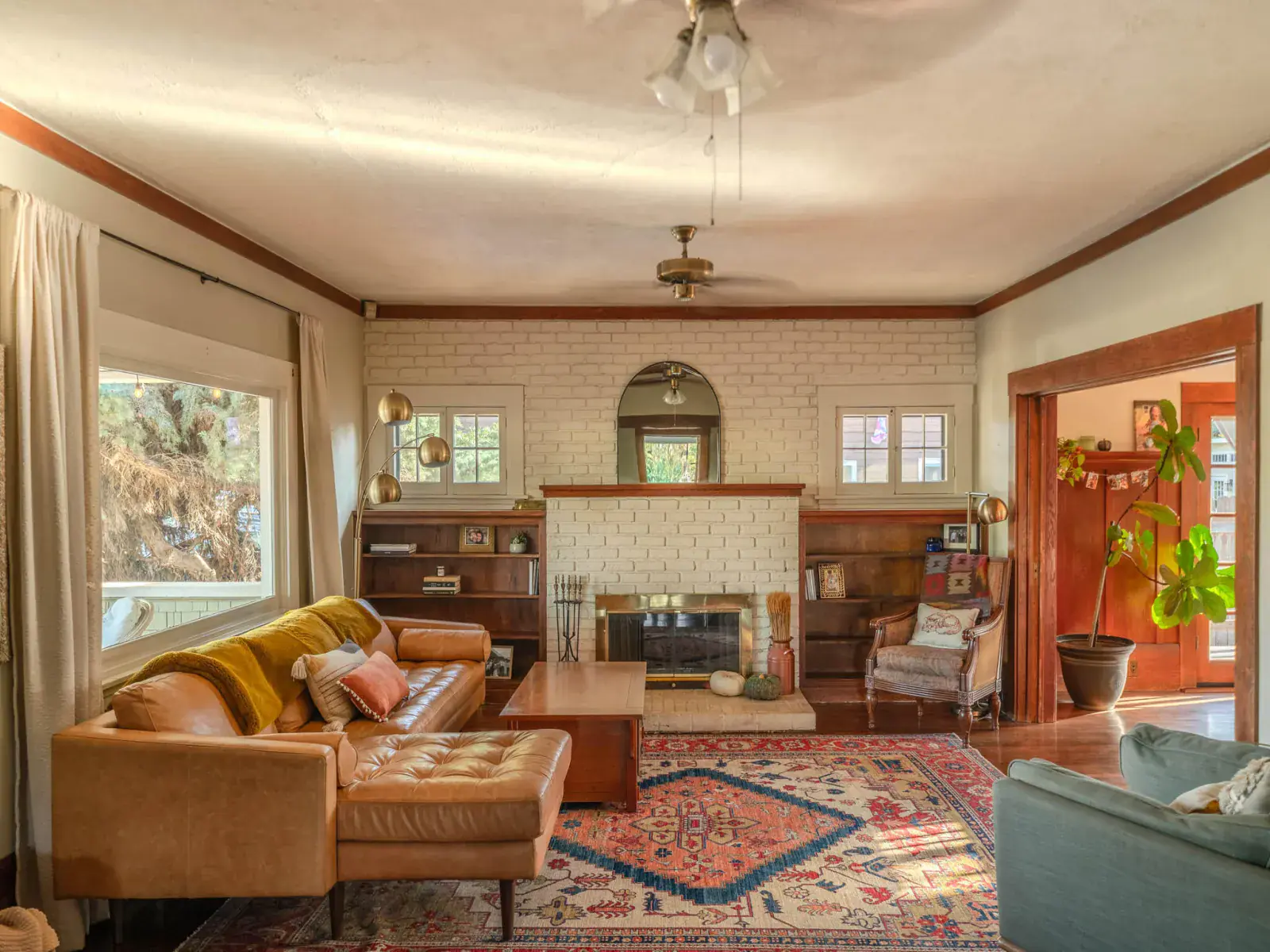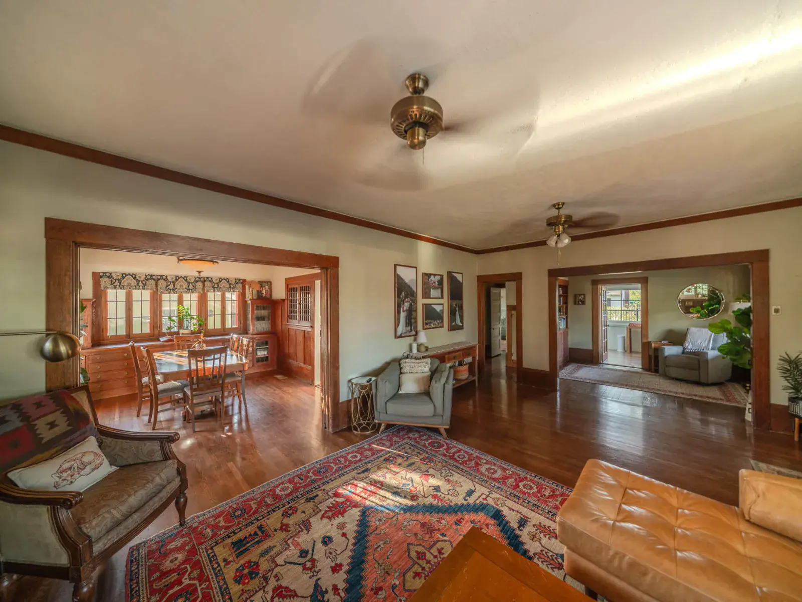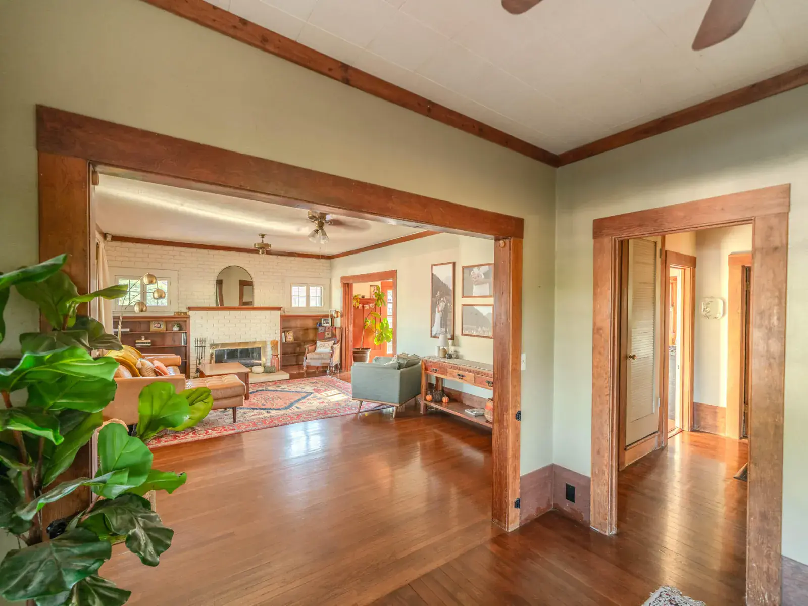 Inside, the home is a celebration of vintage craftsmanship, highlighted by rich, original wood trim and hardwood floors throughout the main living areas. The spacious dining room is perfect for hosting, featuring beautiful built-in wood hutches and french doors leading to the exterior. The cozy living room is anchored by a brick fireplace, flanked by built-in bookshelves, offering a warm and inviting atmosphere.