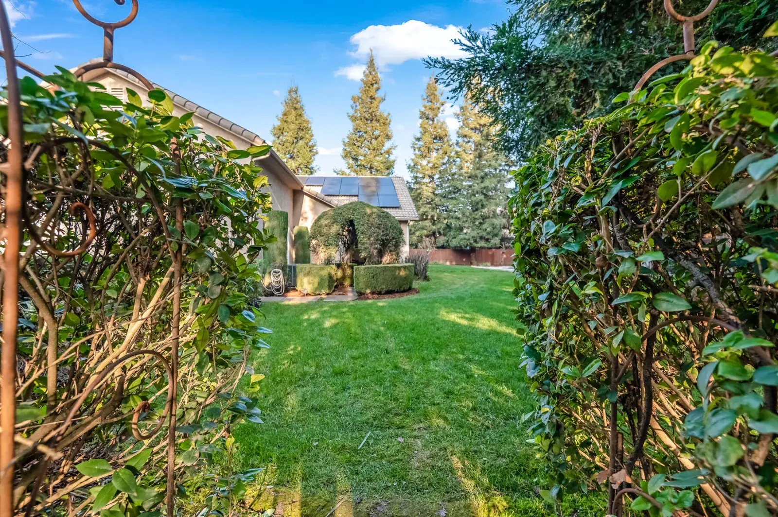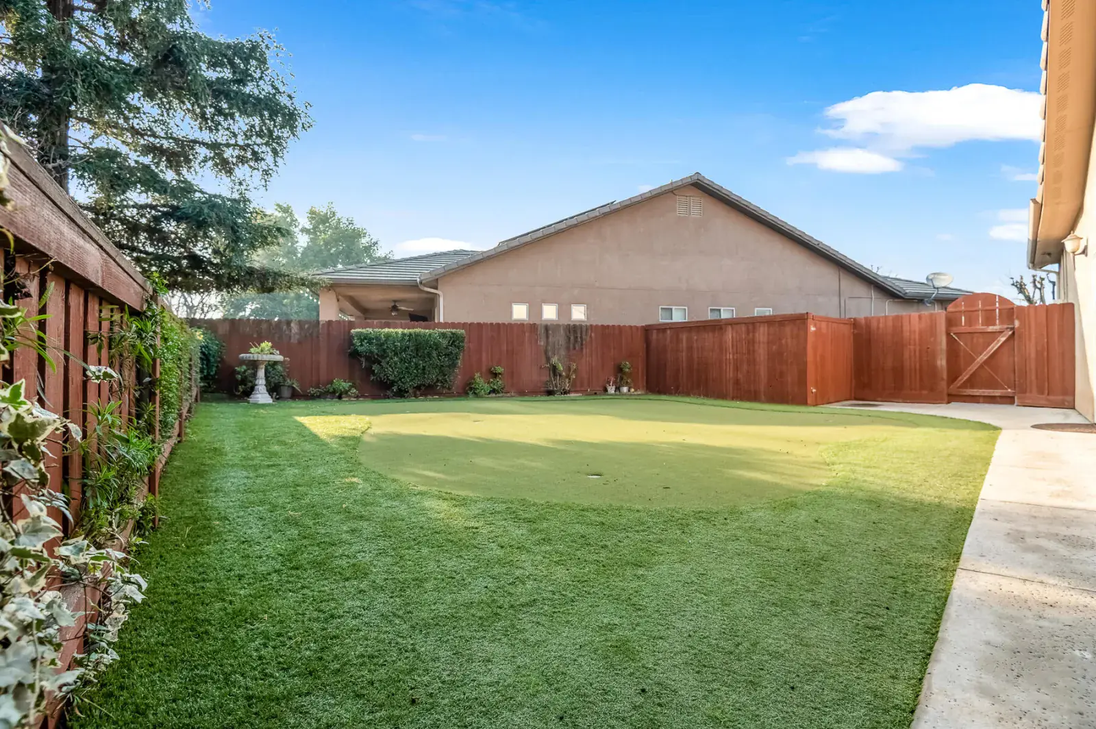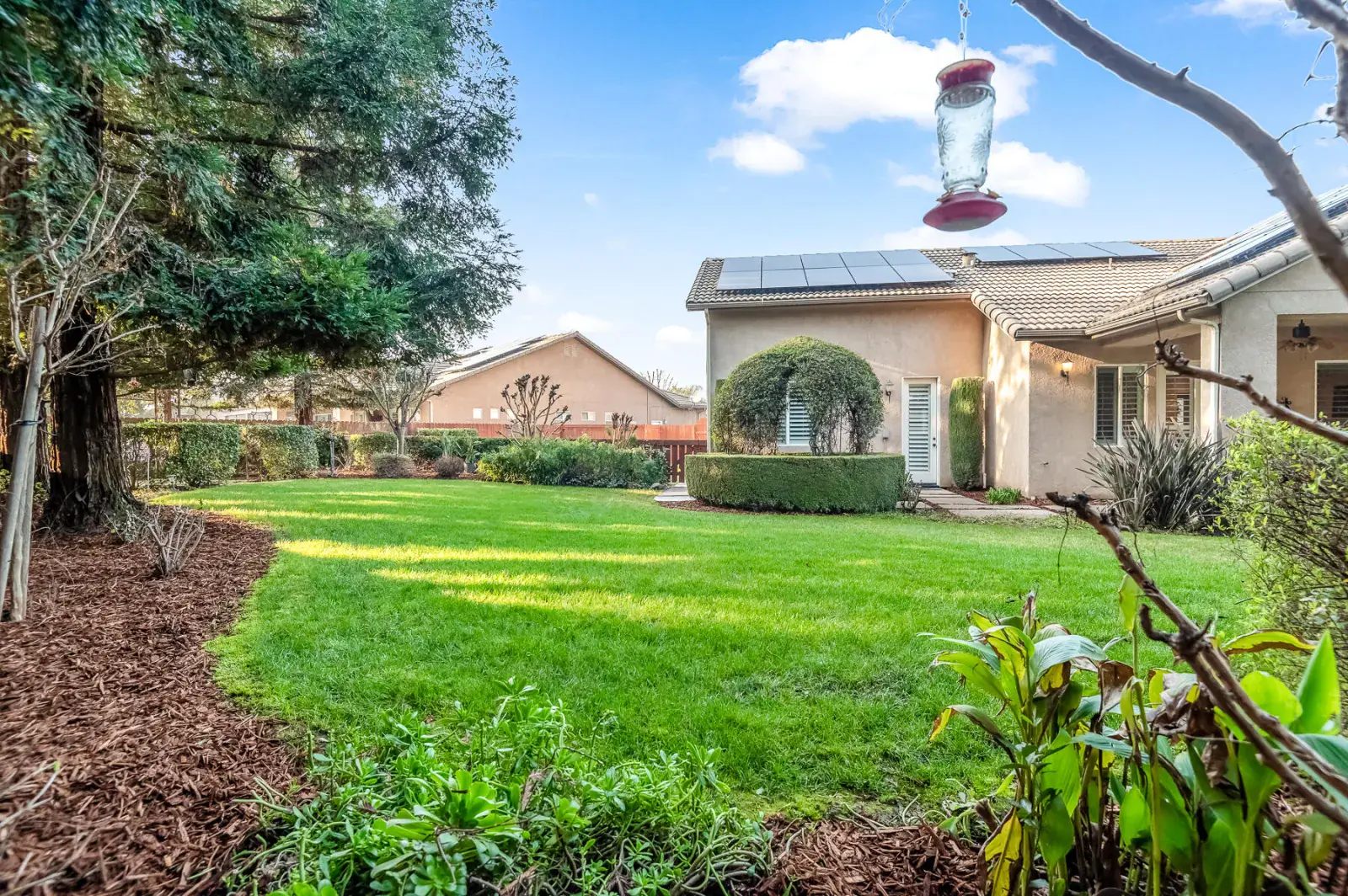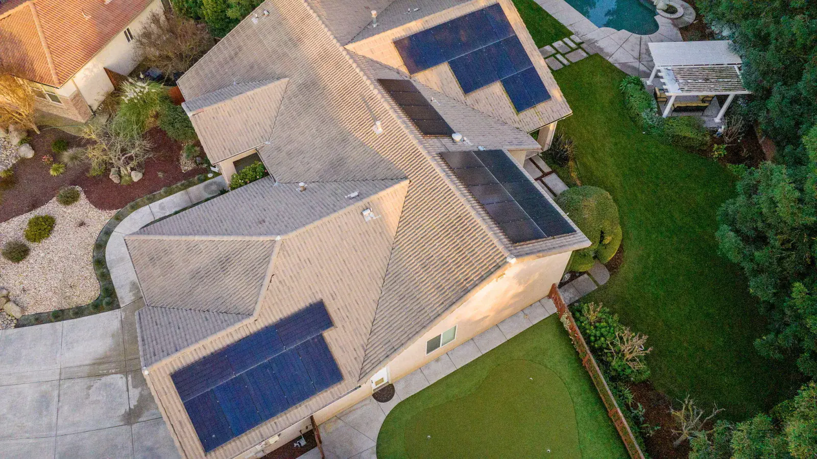 Welcome to this absolutely stunning home in lovely Amber Crossing! This NW neighborhood has been a favorite for its location and wonderful Mangano design, and this home is an absolute gem and not to be missed! Set on a .38 acre lot with sparkling pool, 5-hole putting green, delightful garden areas, large side yard for pets, citrus trees, huge pergola space for extra entertaining and outdoor enjoyment, and so much more, this property is truly one-of-a-kind! Inside, three lovely bedrooms and a fourth bedroom with separate entrance make for a very practical floorplan. The living space features a large great room open to kitchen, breakfast nook, and dining. Primary suite has two separate closets, private WC, soaking tub, and large shower. Amber Crossing homes feature high ceilings and doors, and this one is filled with many extras, including tray ceilings and many built-ins for both display and storage, including a large built-in wine fridge in dining room. Wonderful amenities including OWNED SOLAR make this home an absolute MUST-SEE and an incredible place to get a jump-start on spring enjoyment in a yard that will provide year-round enjoyment and become a favorite retreat. Make your appointment today!