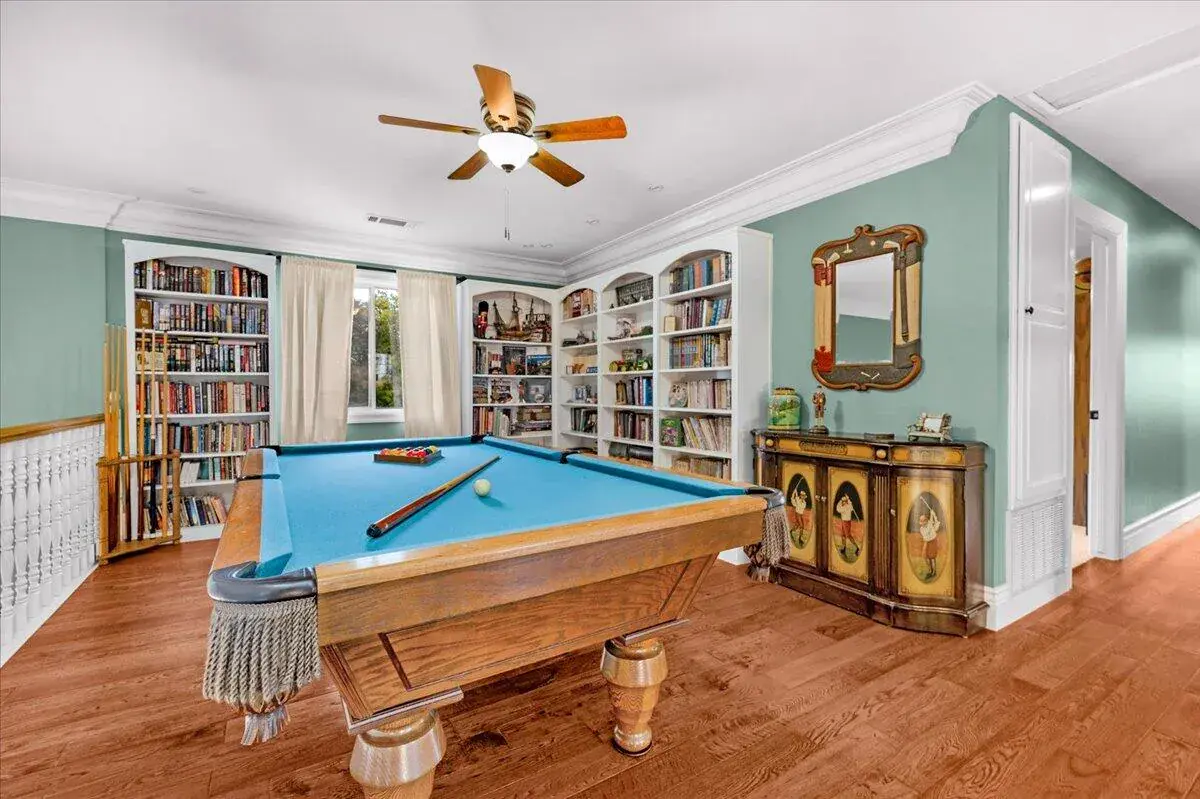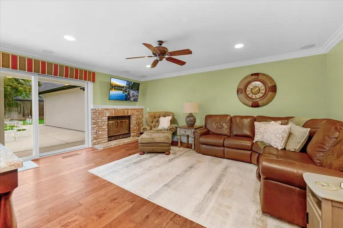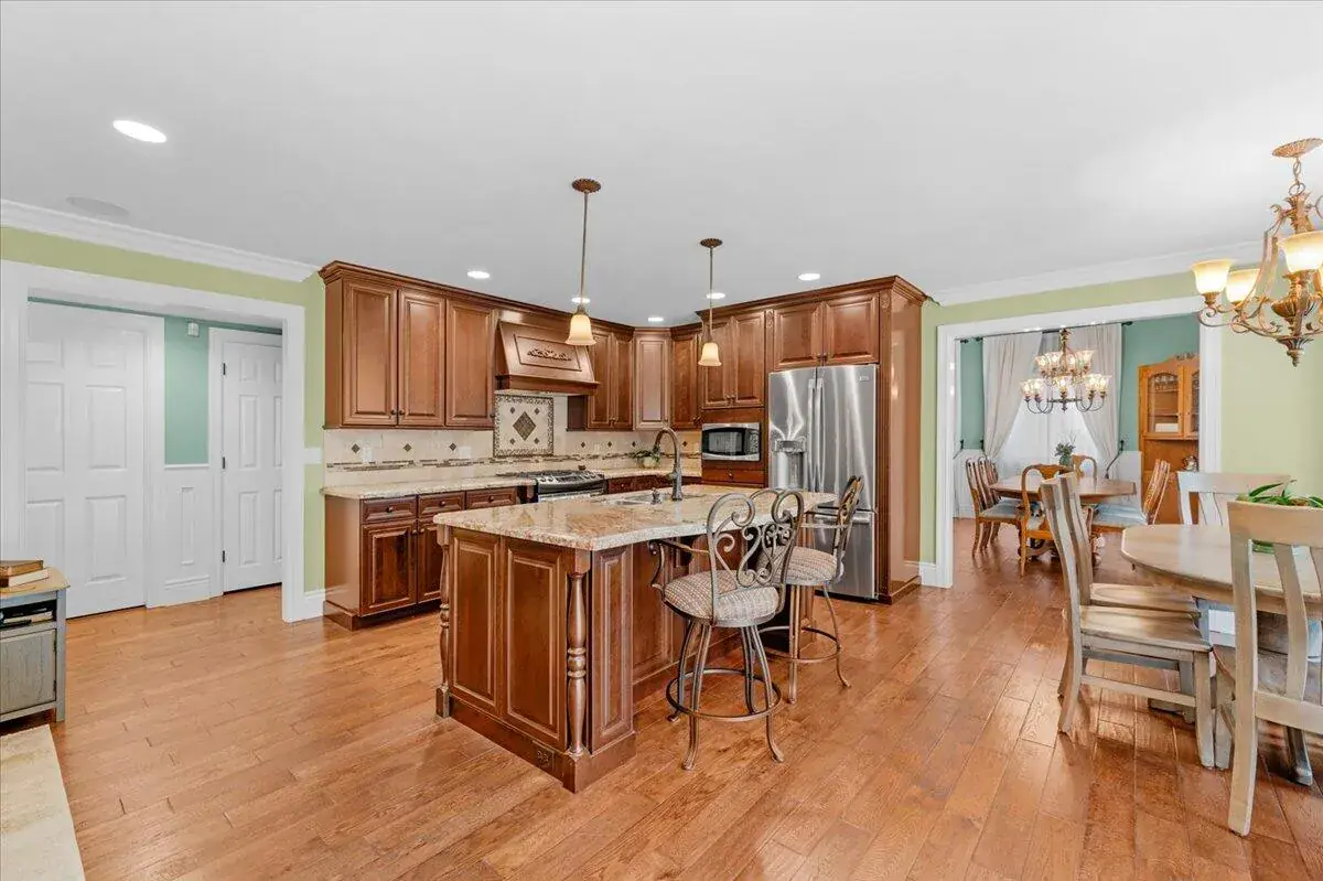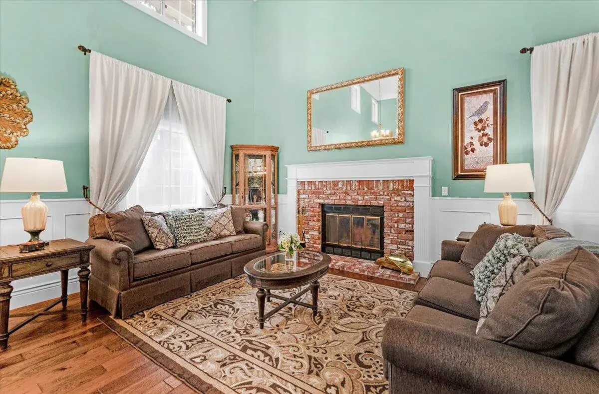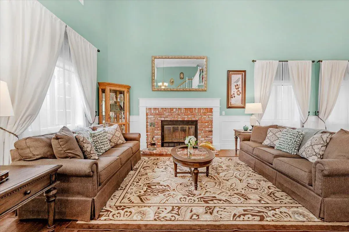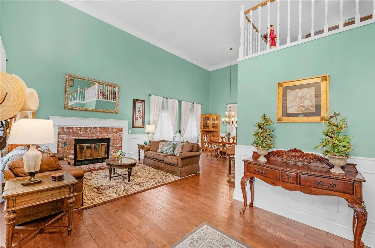 The gourmet kitchen showcases granite countertops, fine cabinetry, and quality finishes, flowing seamlessly into both formal and informal dining areas. The family room and living room each feature a cozy fireplace, while molding throughout adds refined character.