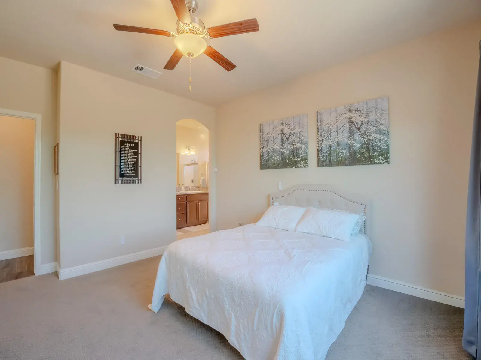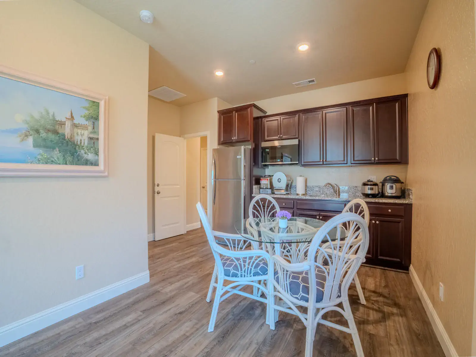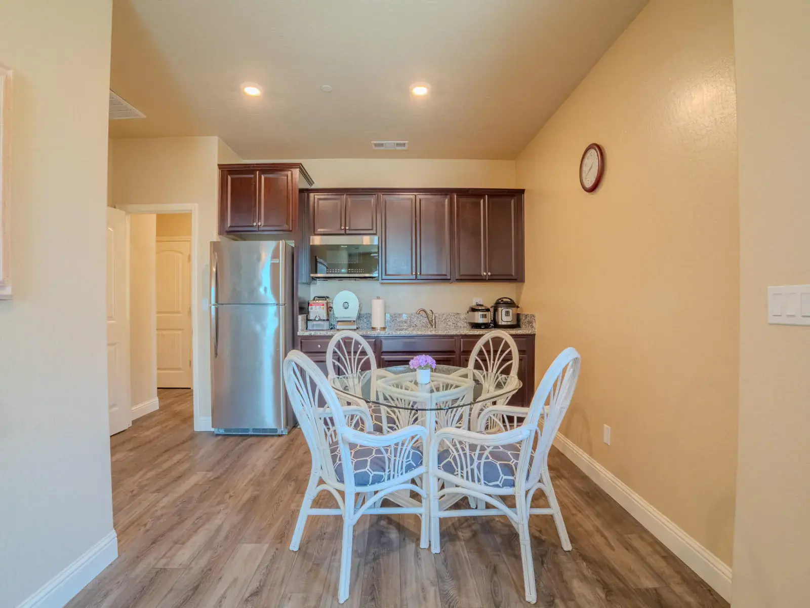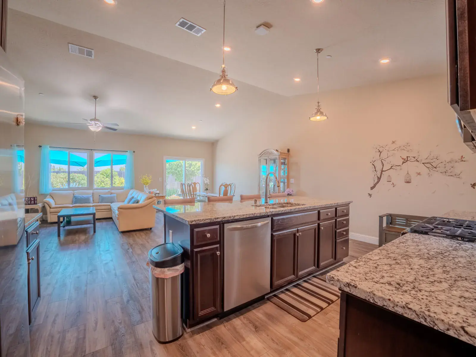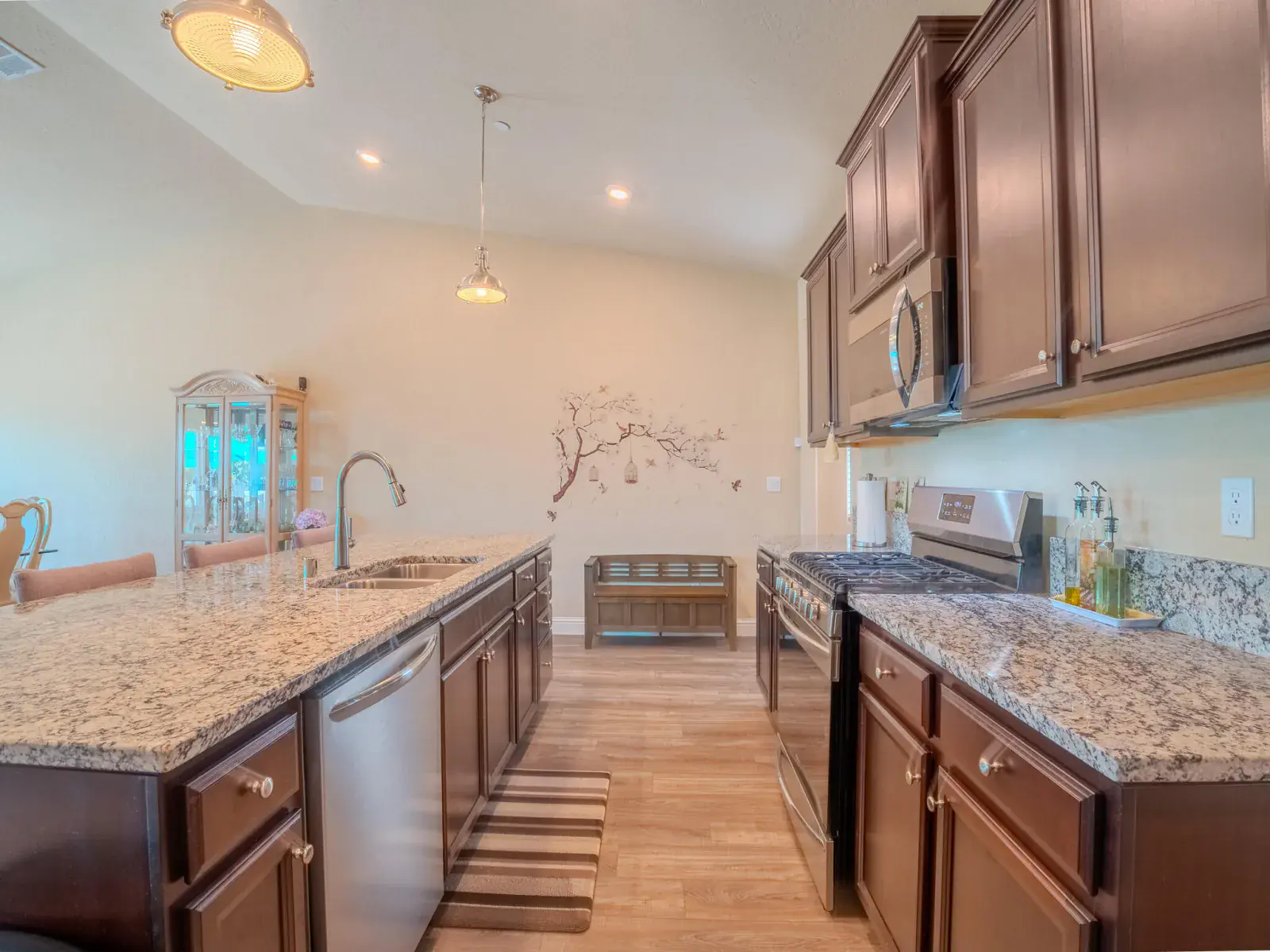 The heart of the main home features a chef-inspired kitchen, designed with both form and function in mind. You’ll find extended granite countertops, custom cabinetry, and a large center island, providing additional prep and seating space. The open-concept layout is flooded with natural light and creates a seamless flow from the kitchen to the dining and main living areas.