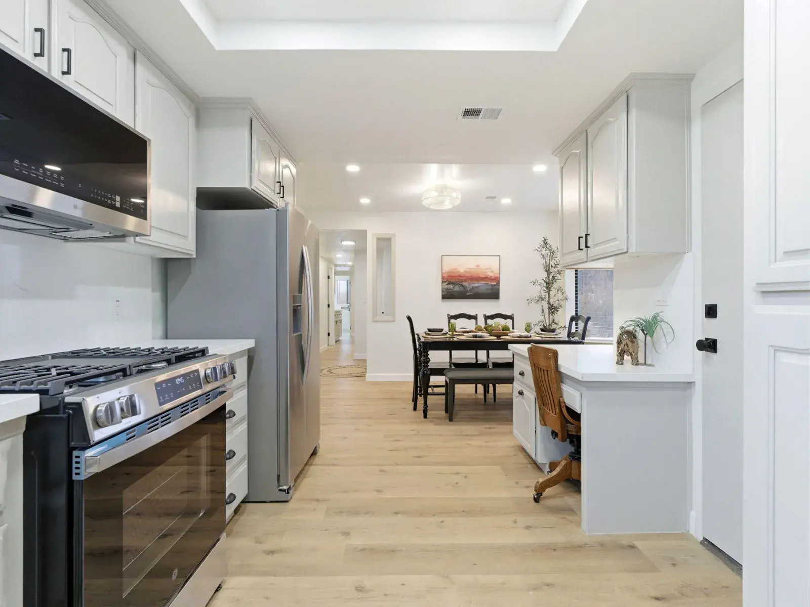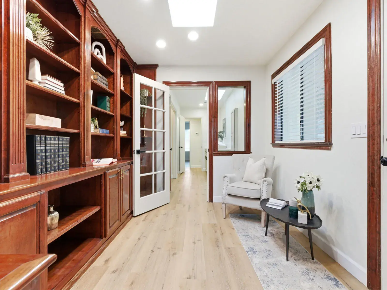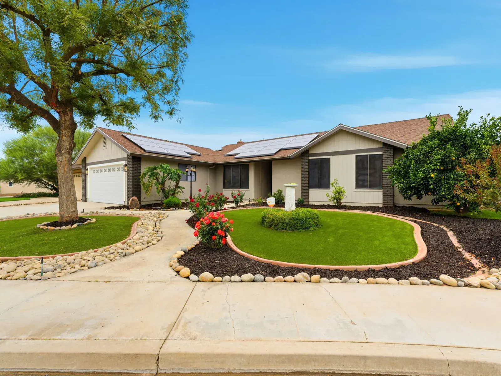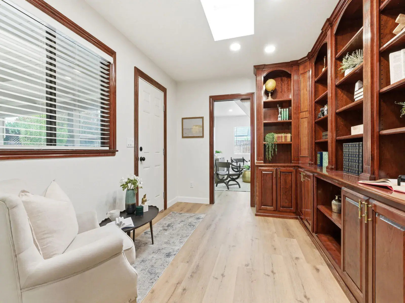 Enjoy a beautifully remodeled kitchen with quartz countertops, luxury flooring, designer lighting, skylights, and all-new high-end appliances. Each bathroom has been exquisitely renovated, blending contemporary elegance with timeless appeal. Dual AC/heating systems and solar power ensure year-round comfort and energy efficiency. An additional finished room in the garage—complete with a window and its own AC—offers the perfect space for a home office, gym, or hobby area.