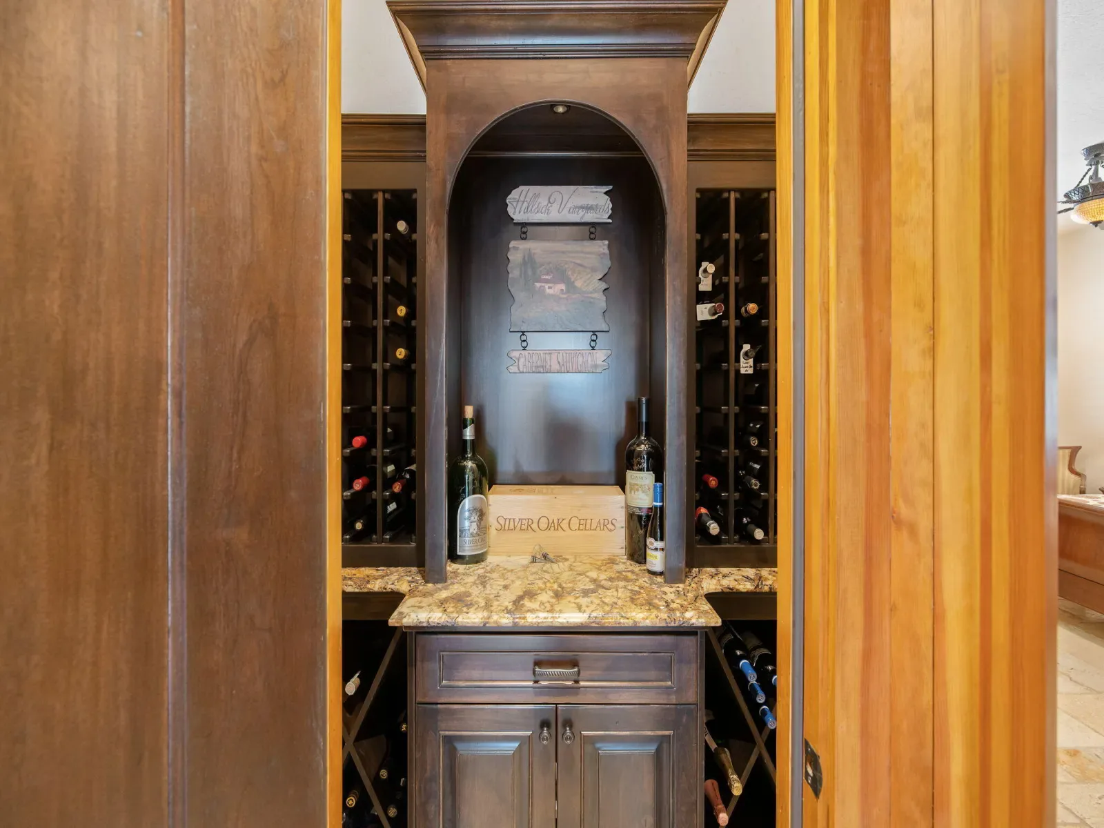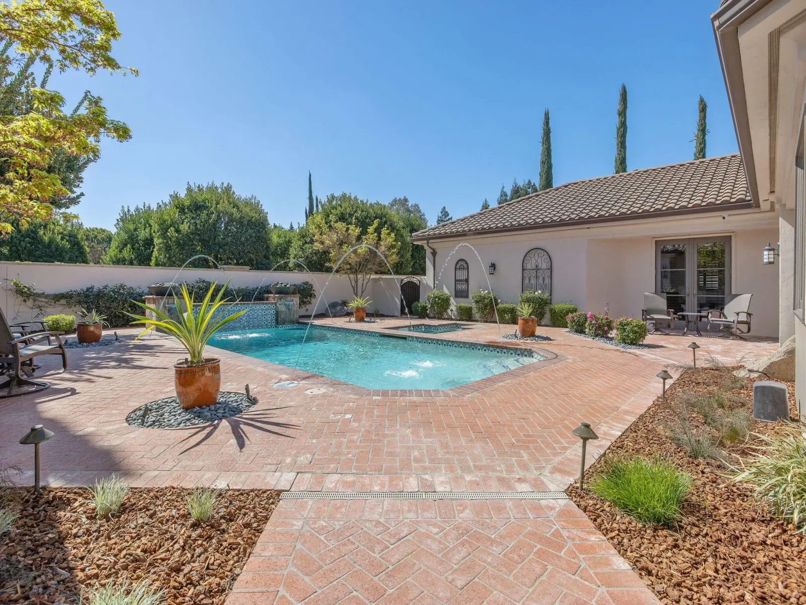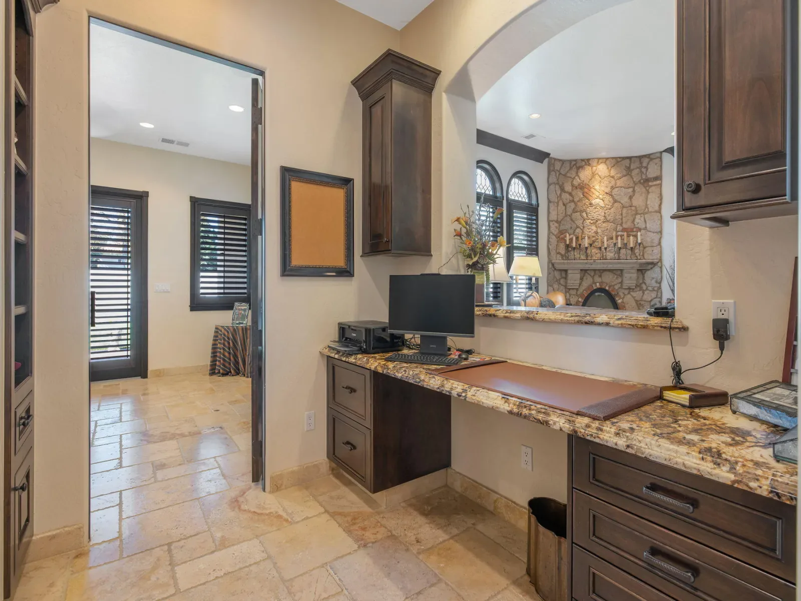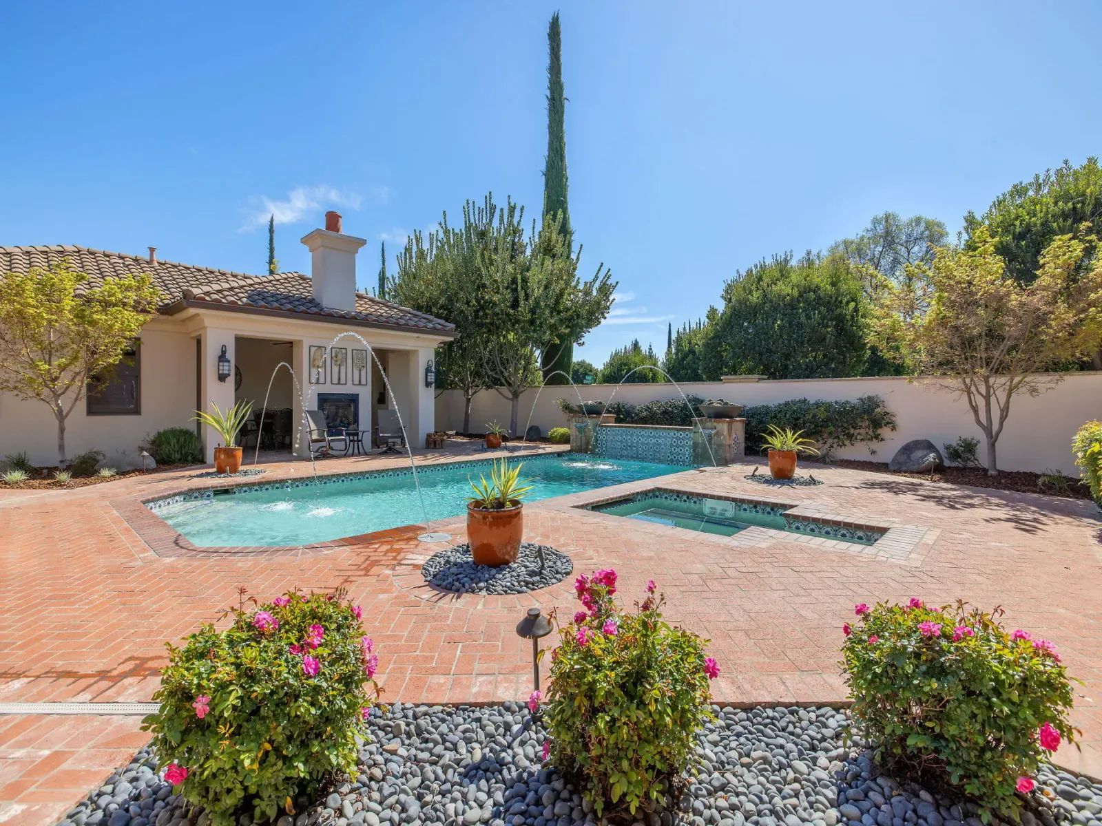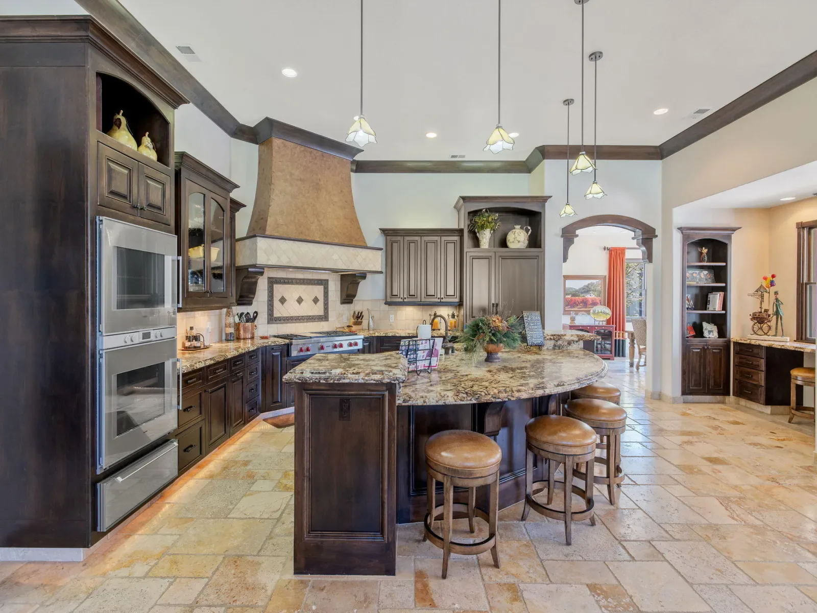Exquisite custom home in gated Da Vinci! Situated on more than half an acre, a remarkable blend of timeless architecture, craftsmanship, and resort-style living just minutes from top schools, shopping, and the charm of downtown Visalia. From the moment you arrive, manicured grounds and striking curb appeal set the tone. Inside, rich materials and exceptional attention to detail define the home, including Turkish travertine floors, custom tile work, and thoughtfully designed living spaces that feel both elegant and inviting. A formal entry opens to the living room with fireplace, while the dining room, surrounded by windows overlooking the lush backyard, creates a stunning setting for gatherings. Just beyond, a butler’s pantry with built-in cabinetry leads to a spectacular refrigerated wine cellar with a hand-carved custom door, a truly distinctive focal point. The chef’s kitchen is designed for everyday living and effortless entertaining, centered around a large island with granite countertops and professional appliances including a Wolf gas cooktop with custom hood, Thermador refrigerator and freezer, Sub-Zero refrigerator drawer, and Gaggenau dishwasher and oven. A walk-in pantry, ice maker, and charming breakfast nook surrounded by windows complete the space. The great room is warm and inviting with a gas fireplace, brick and stone mantel, and built-in entertainment center. The luxurious primary suite features its own fireplace and French doors opening to the backyard retreat. The spa-inspired bath includes a jetted soaking tub, walk-through tile shower, dual vanities, and two walk-in closets with custom built-ins. Outdoors, the property becomes a private resort with a sparkling pool, water feature, fire elements, in-ground jacuzzi, covered patios, and outdoor kitchen. A private casita with bedroom, bath, and kitchenette provides ideal guest accommodations. Owned solar. Meticulously maintained and truly exceptional. Must see to experience!