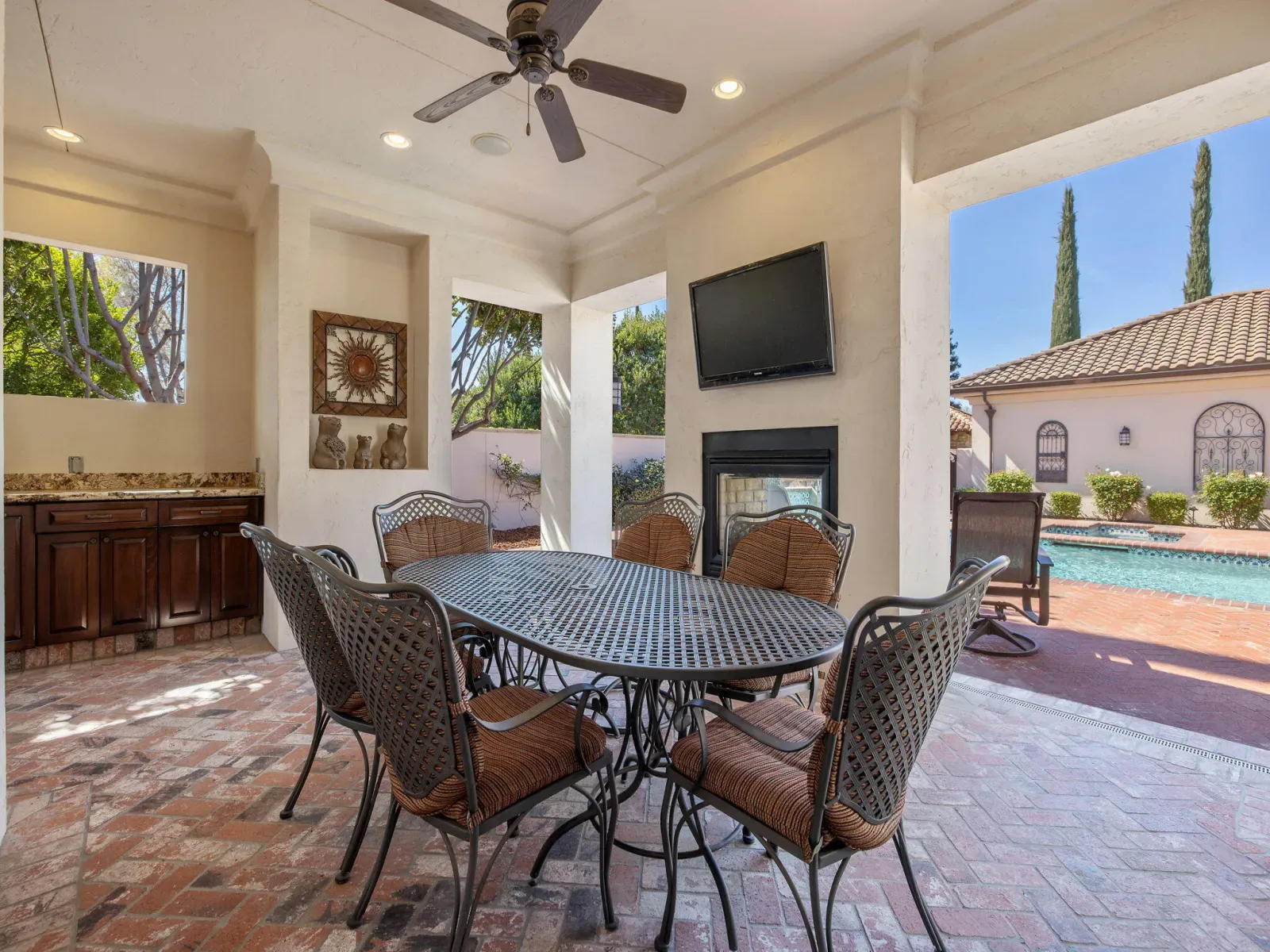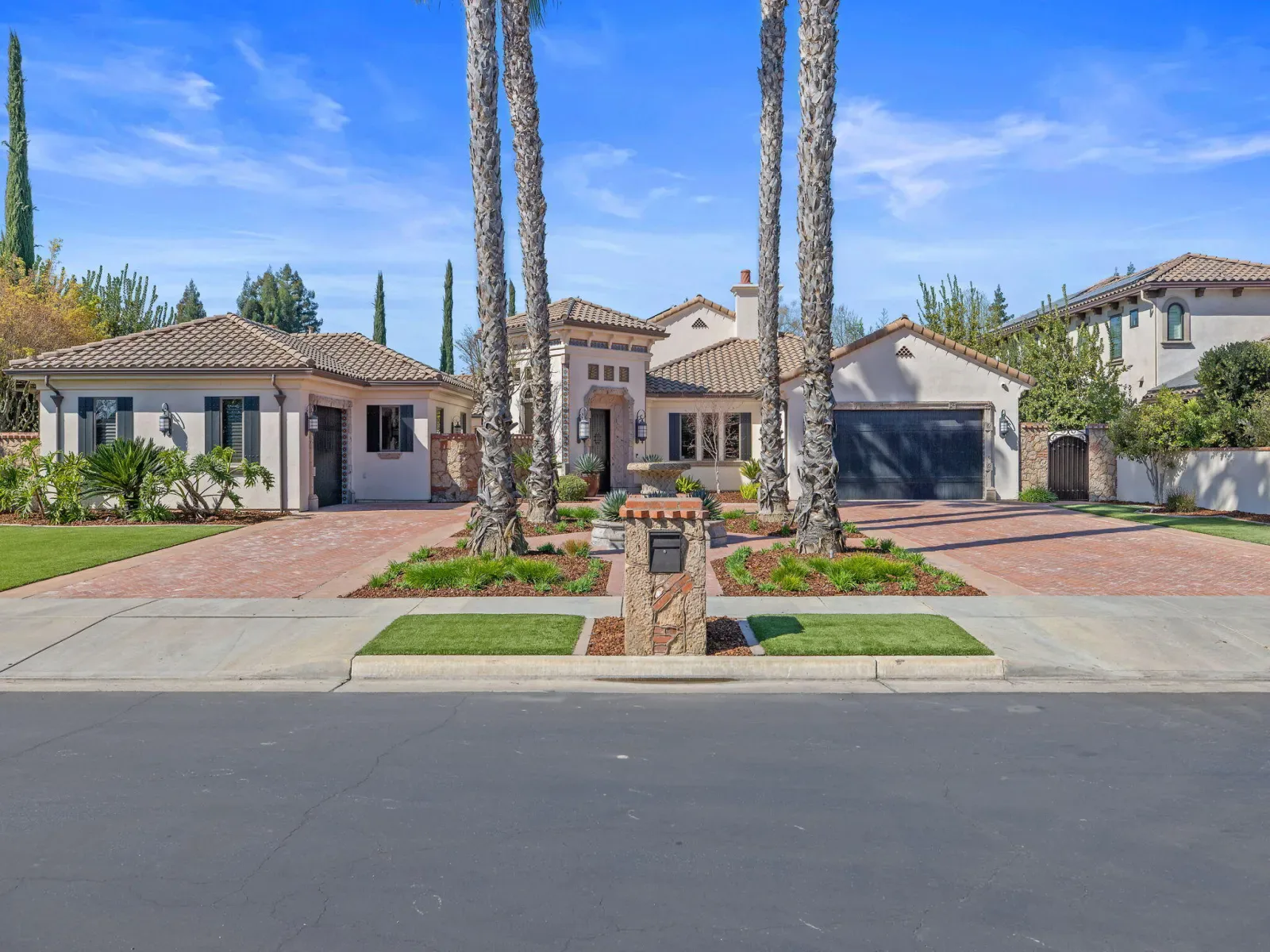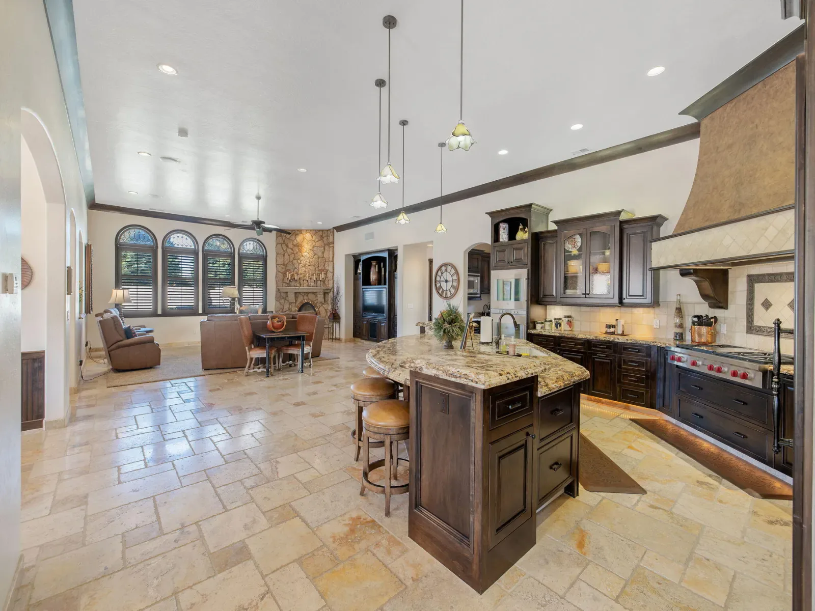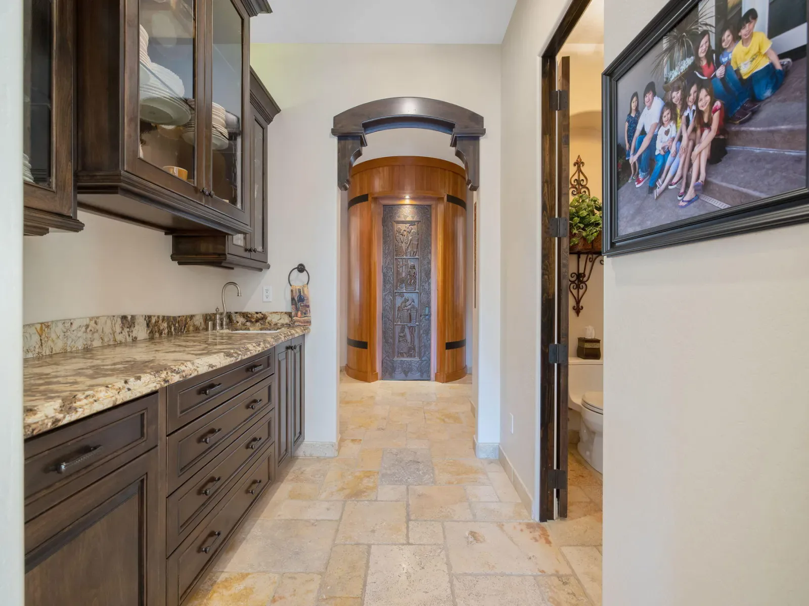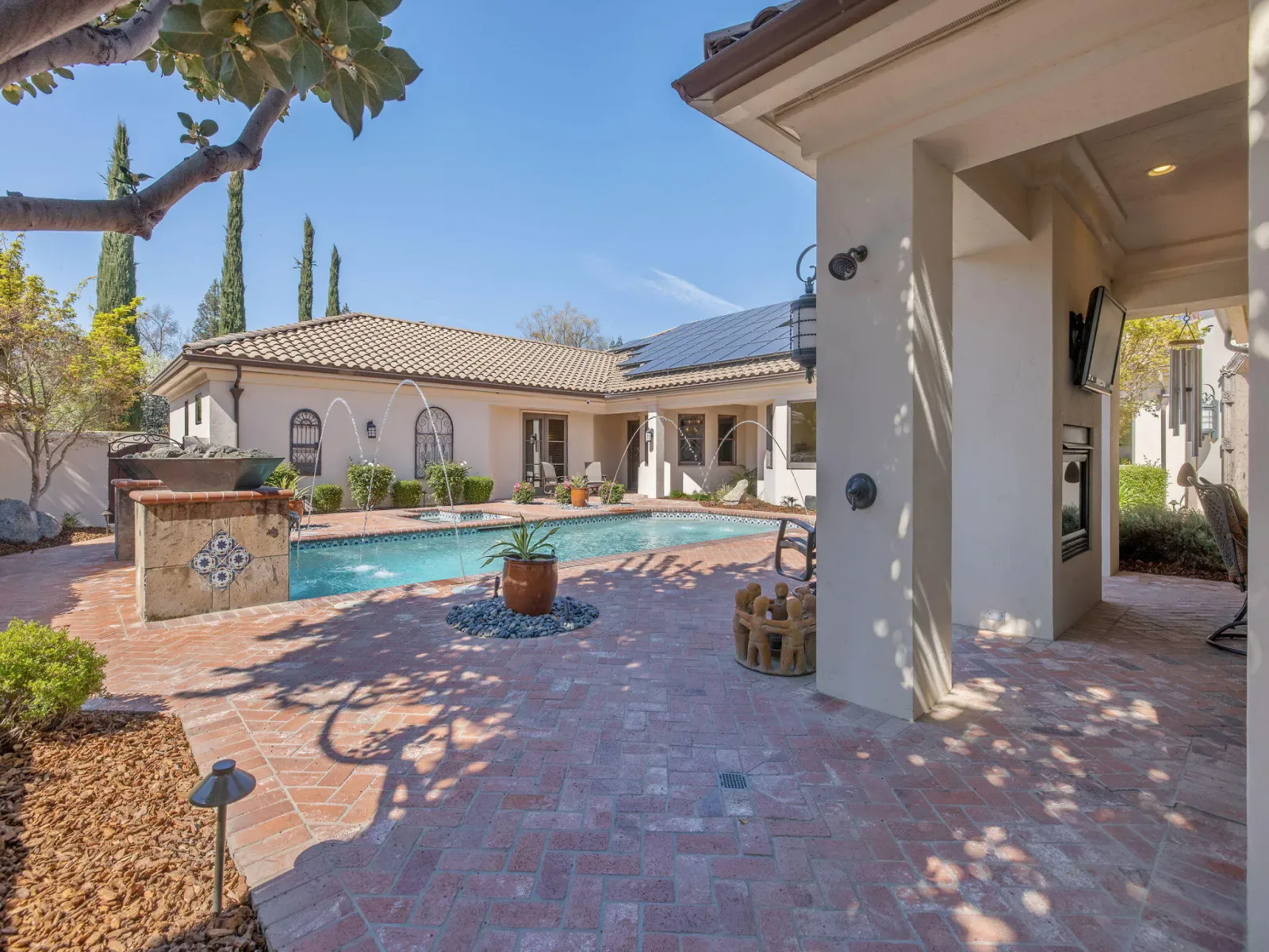 Exquisite custom home in gated Da Vinci! Situated on more than half an acre, a remarkable blend of timeless architecture, craftsmanship, and resort-style living just minutes from top schools, shopping, and the charm of downtown Visalia. From the moment you arrive, manicured grounds and striking curb appeal set the tone. Inside, rich materials and exceptional attention to detail define the home, including Turkish travertine floors, custom tile work, and thoughtfully designed living spaces that feel both elegant and inviting. A formal entry opens to the living room with fireplace, while the dining room, surrounded by windows overlooking the lush backyard, creates a stunning setting for gatherings. Just beyond, a butler’s pantry with built-in cabinetry leads to a spectacular refrigerated wine cellar with a hand-carved custom door, a truly distinctive focal point. The chef’s kitchen is designed for everyday living and effortless entertaining, centered around a large island with granite countertops and professional appliances including a Wolf gas cooktop with custom hood, Thermador refrigerator and freezer, Sub-Zero refrigerator drawer, and Gaggenau dishwasher and oven. A walk-in pantry, ice maker, and charming breakfast nook surrounded by windows complete the space. The great room is warm and inviting with a gas fireplace, brick and stone mantel, and built-in entertainment center. The luxurious primary suite features its own fireplace and French doors opening to the backyard retreat. The spa-inspired bath includes a jetted soaking tub, walk-through tile shower, dual vanities, and two walk-in closets with custom built-ins. Outdoors, the property becomes a private resort with a sparkling pool, water feature, fire elements, in-ground jacuzzi, covered patios, and outdoor kitchen. A private casita with bedroom, bath, and kitchenette provides ideal guest accommodations. Owned solar. Meticulously maintained and truly exceptional. Must see to experience!