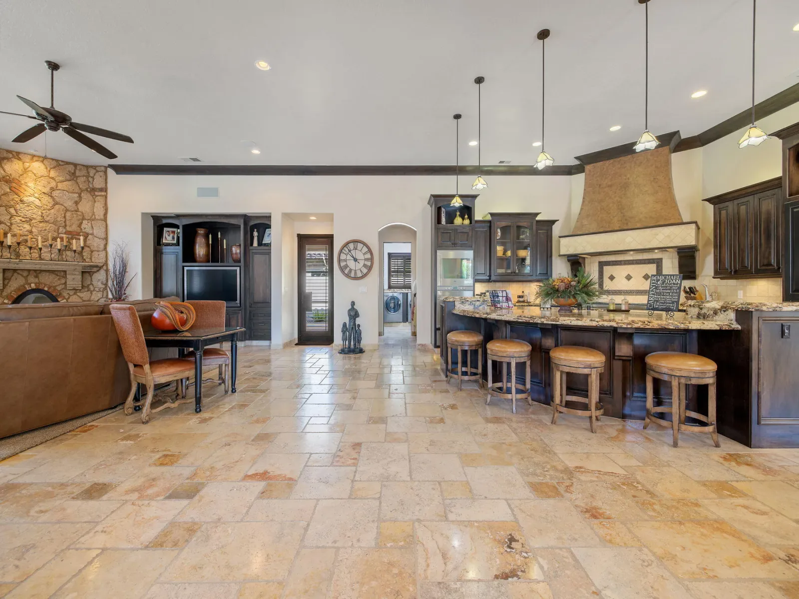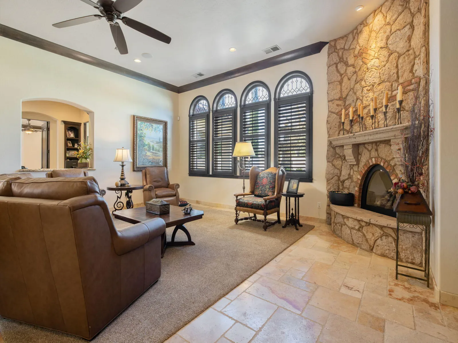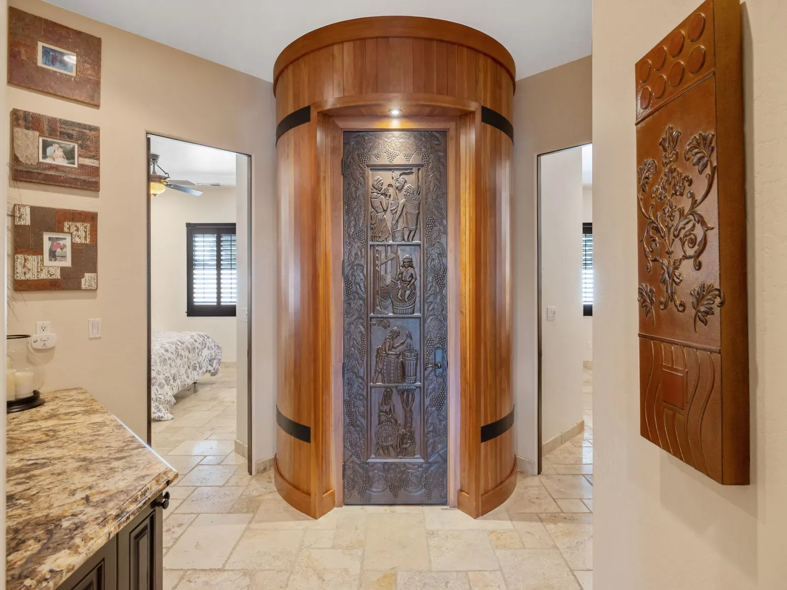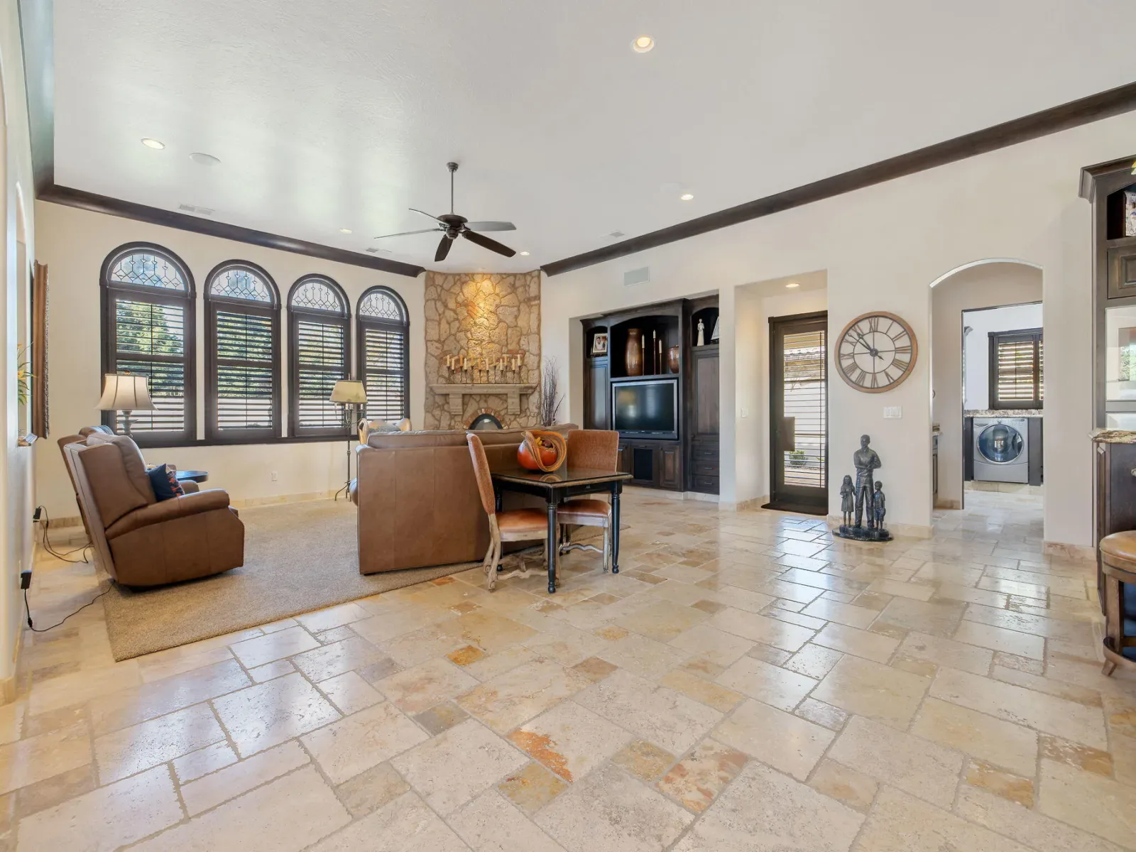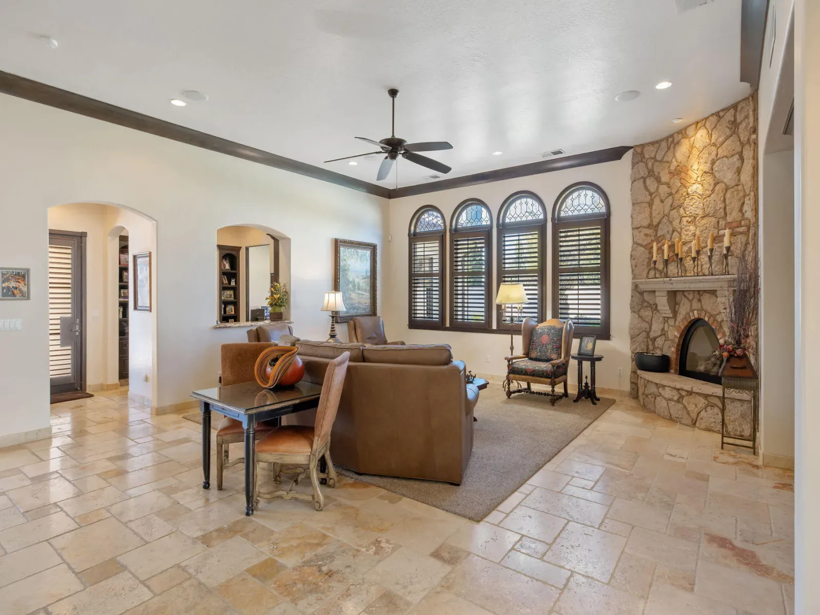 Exquisite custom home in gated Da Vinci! Situated on more than half an acre, a remarkable blend of timeless architecture, craftsmanship, and resort-style living just minutes from top schools, shopping, and the charm of downtown Visalia. From the moment you arrive, manicured grounds and striking curb appeal set the tone. Inside, rich materials and exceptional attention to detail define the home, including Turkish travertine floors, custom tile work, and thoughtfully designed living spaces that feel both elegant and inviting. A formal entry opens to the living room with fireplace, while the dining room, surrounded by windows overlooking the lush backyard, creates a stunning setting for gatherings. Just beyond, a butler’s pantry with built-in cabinetry leads to a spectacular refrigerated wine cellar with a hand-carved custom door, a truly distinctive focal point. The chef’s kitchen is designed for everyday living and effortless entertaining, centered around a large island with granite countertops and professional appliances including a Wolf gas cooktop with custom hood, Thermador refrigerator and freezer, Sub-Zero refrigerator drawer, and Gaggenau dishwasher and oven. A walk-in pantry, ice maker, and charming breakfast nook surrounded by windows complete the space. The great room is warm and inviting with a gas fireplace, brick and stone mantel, and built-in entertainment center. The luxurious primary suite features its own fireplace and French doors opening to the backyard retreat. The spa-inspired bath includes a jetted soaking tub, walk-through tile shower, dual vanities, and two walk-in closets with custom built-ins. Outdoors, the property becomes a private resort with a sparkling pool, water feature, fire elements, in-ground jacuzzi, covered patios, and outdoor kitchen. A private casita with bedroom, bath, and kitchenette provides ideal guest accommodations. Owned solar. Meticulously maintained and truly exceptional. Must see to experience!
