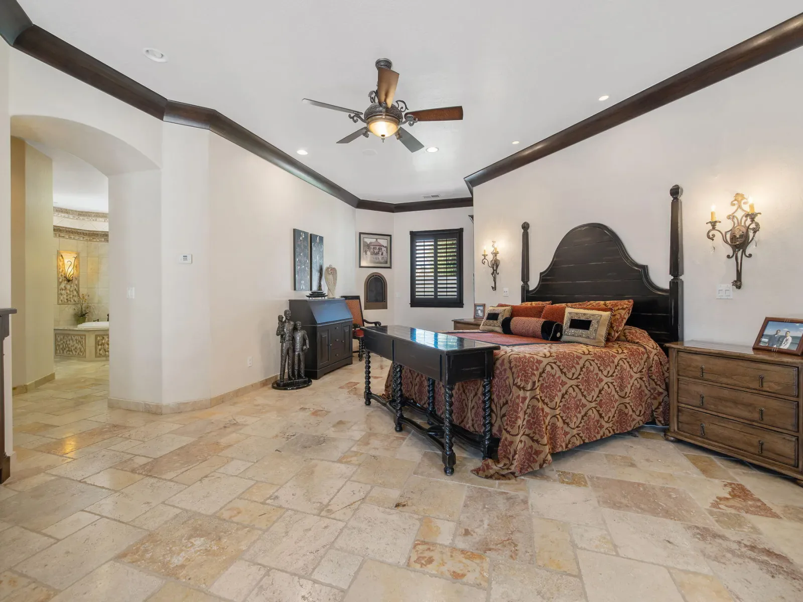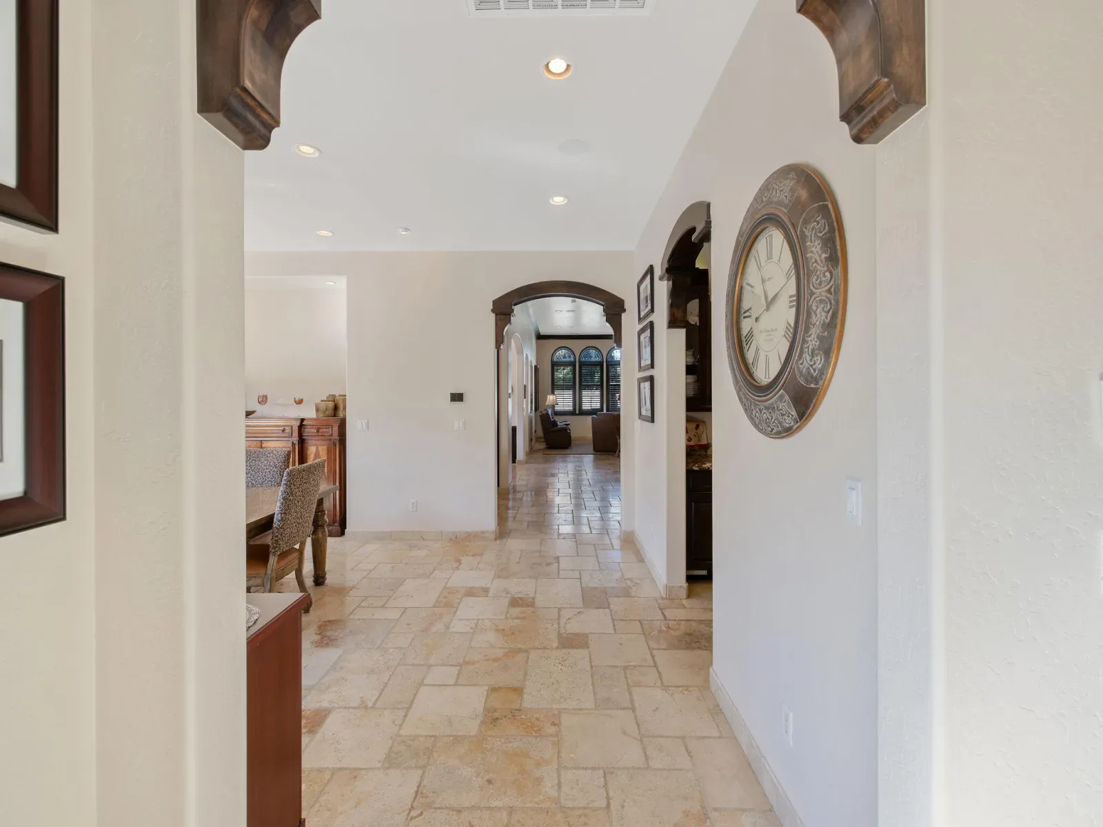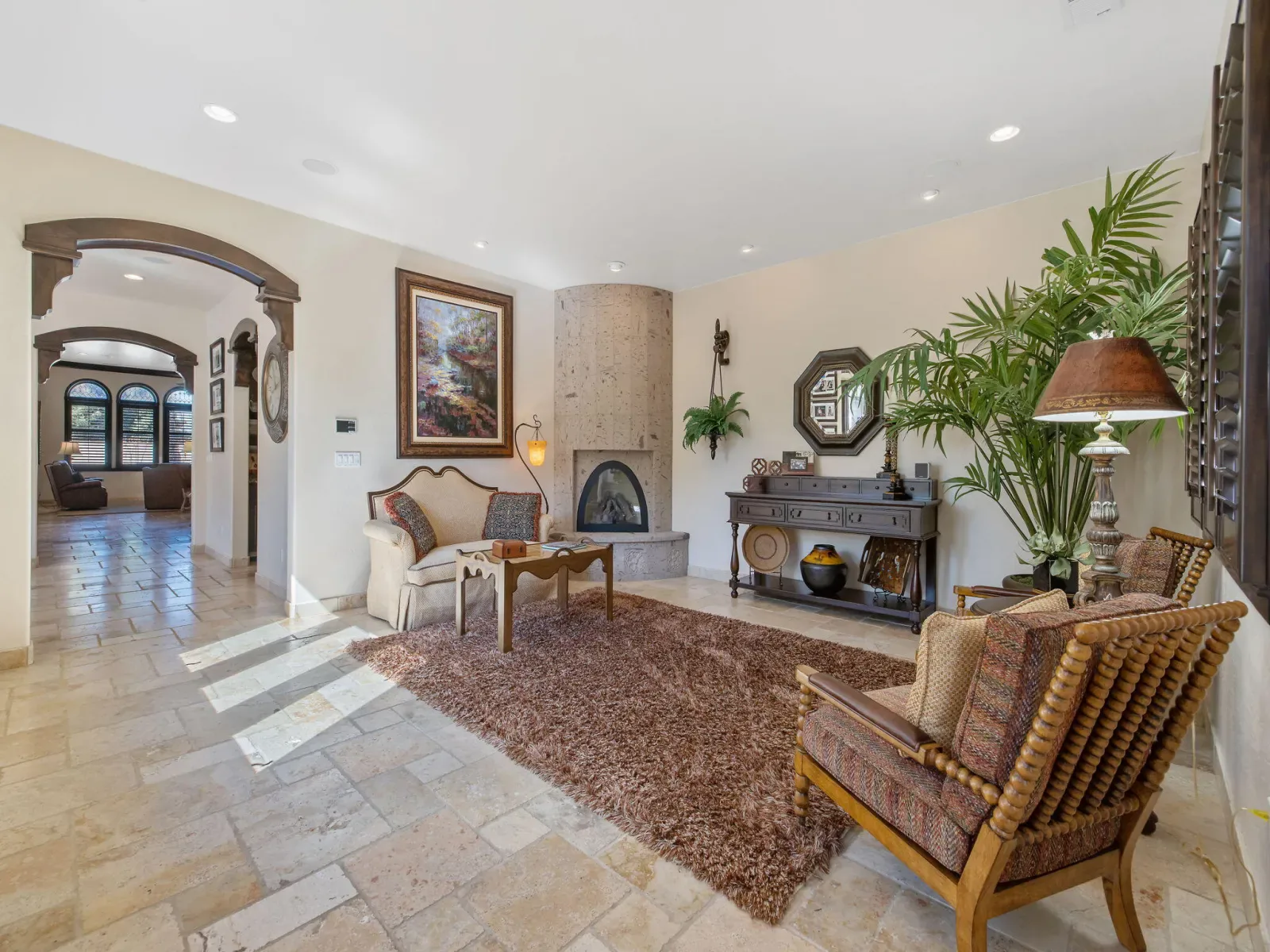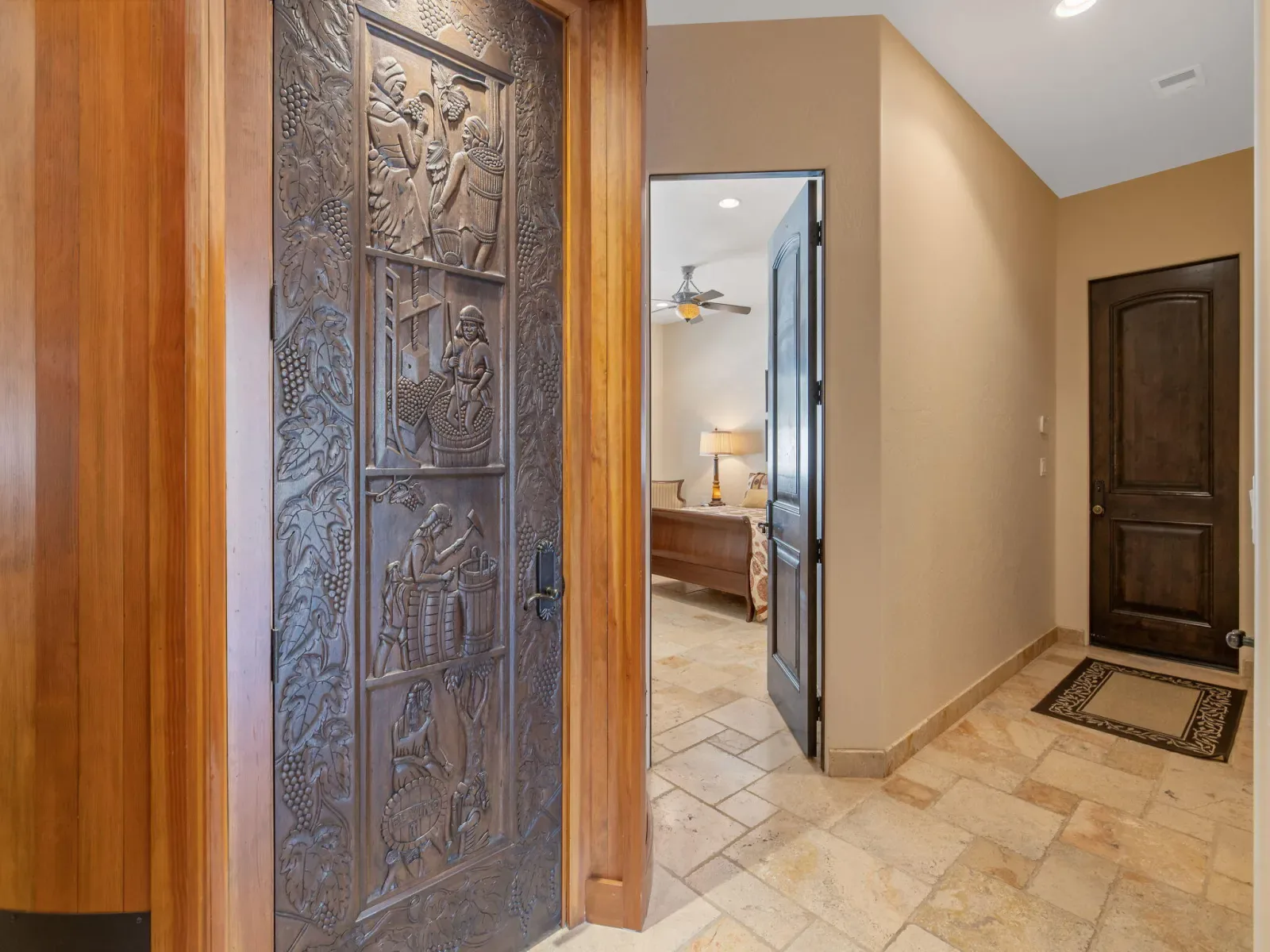 Exquisite custom home in gated Da Vinci! Situated on more than half an acre, a remarkable blend of timeless architecture, craftsmanship, and resort-style living just minutes from top schools, shopping, and the charm of downtown Visalia. From the moment you arrive, manicured grounds and striking curb appeal set the tone. Inside, rich materials and exceptional attention to detail define the home, including Turkish travertine floors, custom tile work, and thoughtfully designed living spaces that feel both elegant and inviting. A formal entry opens to the living room with fireplace, while the dining room, surrounded by windows overlooking the lush backyard, creates a stunning setting for gatherings. Just beyond, a butler’s pantry with built-in cabinetry leads to a spectacular refrigerated wine cellar with a hand-carved custom door, a truly distinctive focal point. The chef’s kitchen is designed for everyday living and effortless entertaining, centered around a large island with granite countertops and professional appliances including a Wolf gas cooktop with custom hood, Thermador refrigerator and freezer, Sub-Zero refrigerator drawer, and Gaggenau dishwasher and oven. A walk-in pantry, ice maker, and charming breakfast nook surrounded by windows complete the space. The great room is warm and inviting with a gas fireplace, brick and stone mantel, and built-in entertainment center. The luxurious primary suite features its own fireplace and French doors opening to the backyard retreat. The spa-inspired bath includes a jetted soaking tub, walk-through tile shower, dual vanities, and two walk-in closets with custom built-ins. Outdoors, the property becomes a private resort with a sparkling pool, water feature, fire elements, in-ground jacuzzi, covered patios, and outdoor kitchen. A private casita with bedroom, bath, and kitchenette provides ideal guest accommodations. Owned solar. Meticulously maintained and truly exceptional. Must see to experience!