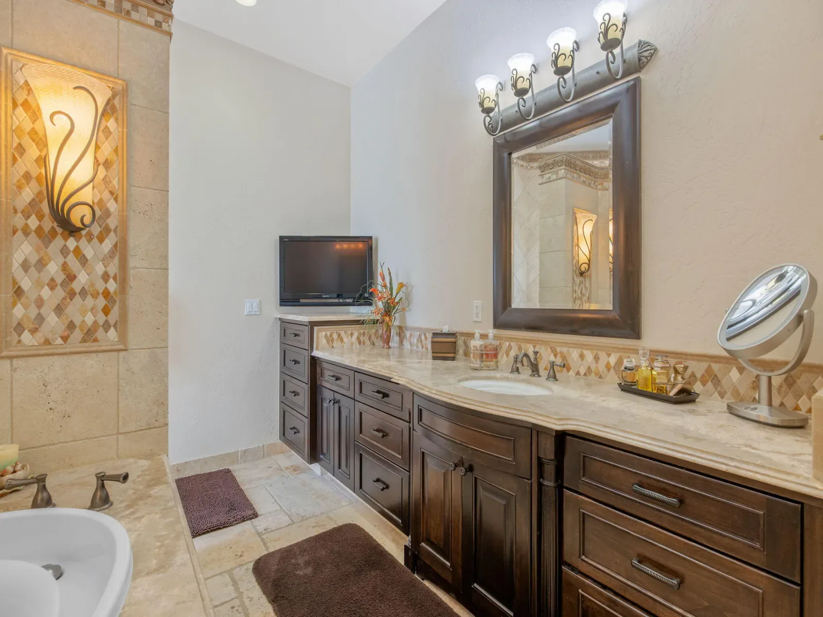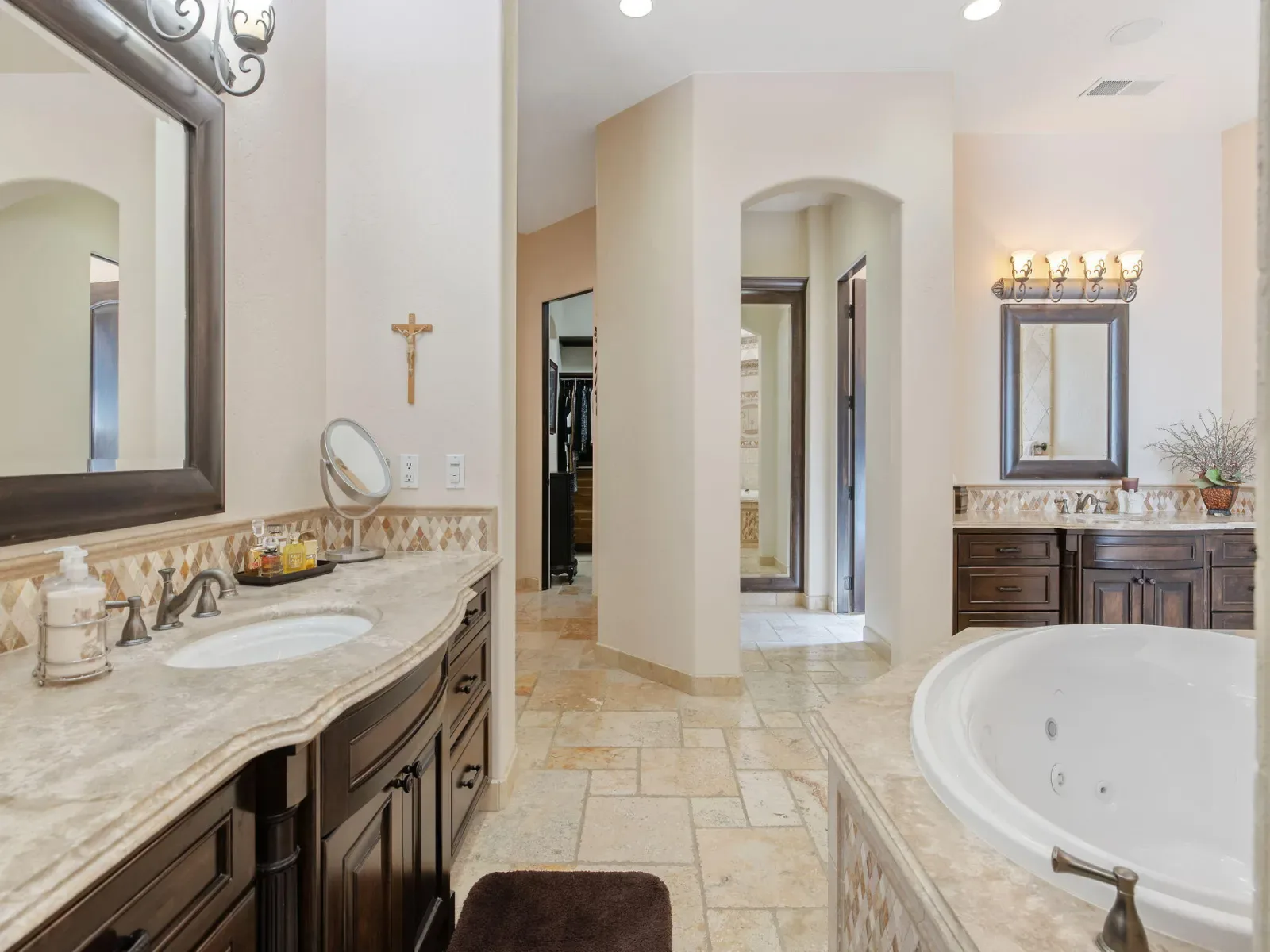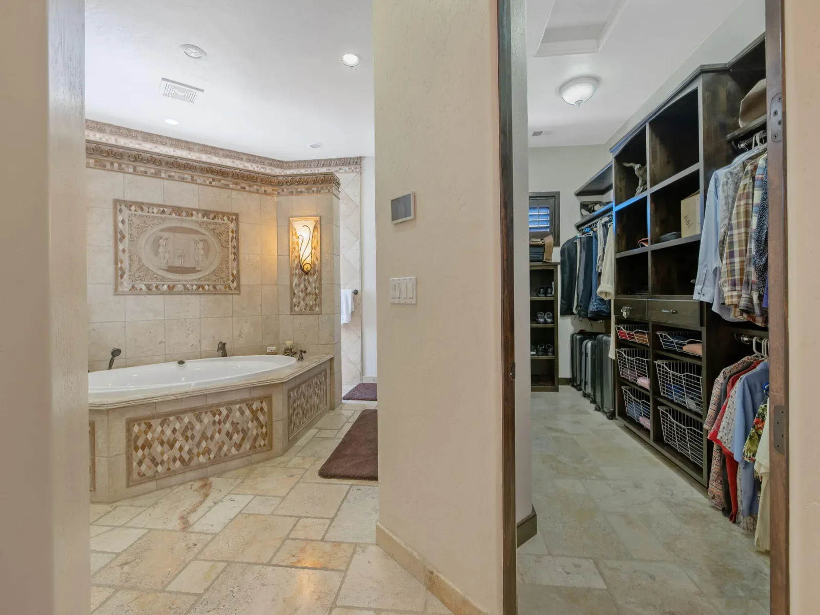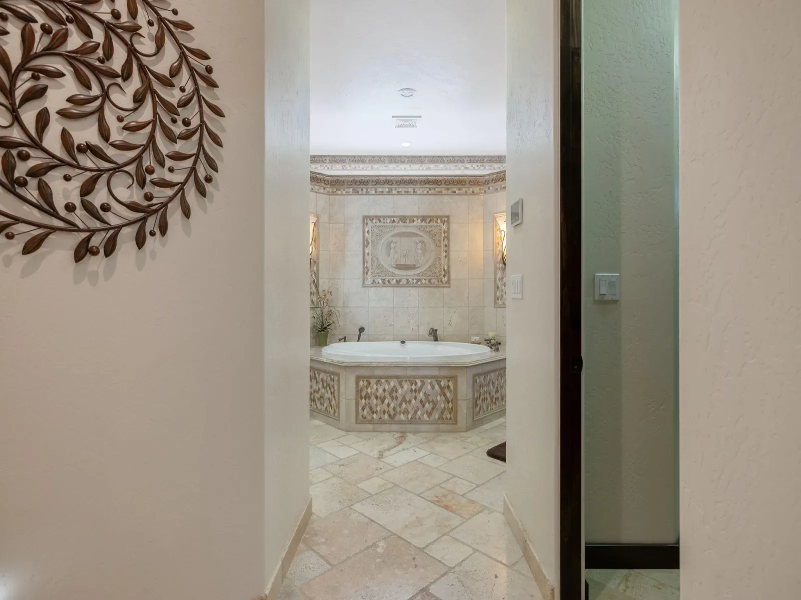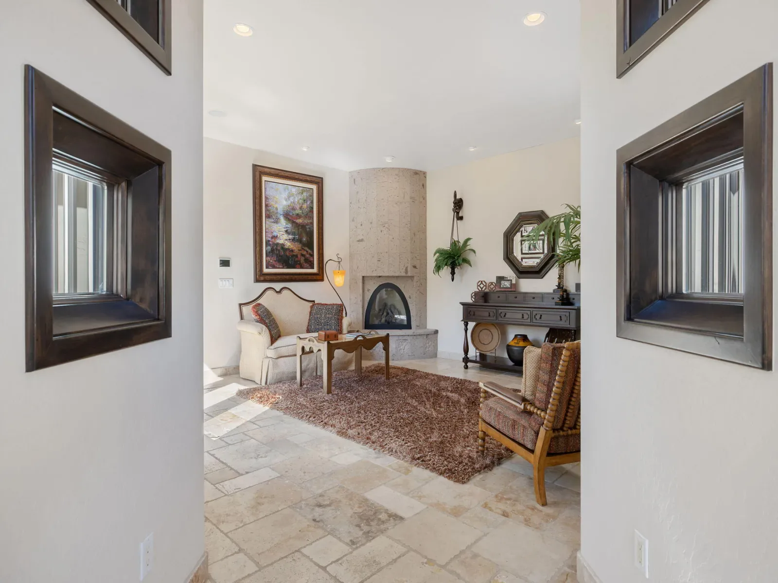 Exquisite custom home in gated Da Vinci! Situated on more than half an acre, a remarkable blend of timeless architecture, craftsmanship, and resort-style living just minutes from top schools, shopping, and the charm of downtown Visalia. From the moment you arrive, manicured grounds and striking curb appeal set the tone. Inside, rich materials and exceptional attention to detail define the home, including Turkish travertine floors, custom tile work, and thoughtfully designed living spaces that feel both elegant and inviting. A formal entry opens to the living room with fireplace, while the dining room, surrounded by windows overlooking the lush backyard, creates a stunning setting for gatherings. Just beyond, a butler’s pantry with built-in cabinetry leads to a spectacular refrigerated wine cellar with a hand-carved custom door, a truly distinctive focal point. The chef’s kitchen is designed for everyday living and effortless entertaining, centered around a large island with granite countertops and professional appliances including a Wolf gas cooktop with custom hood, Thermador refrigerator and freezer, Sub-Zero refrigerator drawer, and Gaggenau dishwasher and oven. A walk-in pantry, ice maker, and charming breakfast nook surrounded by windows complete the space. The great room is warm and inviting with a gas fireplace, brick and stone mantel, and built-in entertainment center. The luxurious primary suite features its own fireplace and French doors opening to the backyard retreat. The spa-inspired bath includes a jetted soaking tub, walk-through tile shower, dual vanities, and two walk-in closets with custom built-ins. Outdoors, the property becomes a private resort with a sparkling pool, water feature, fire elements, in-ground jacuzzi, covered patios, and outdoor kitchen. A private casita with bedroom, bath, and kitchenette provides ideal guest accommodations. Owned solar. Meticulously maintained and truly exceptional. Must see to experience!