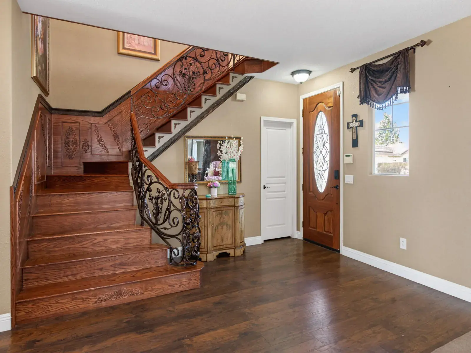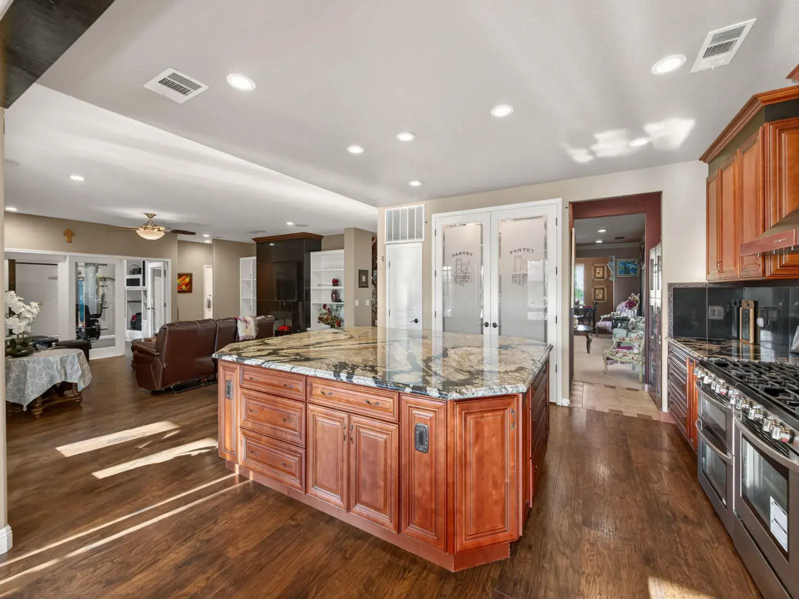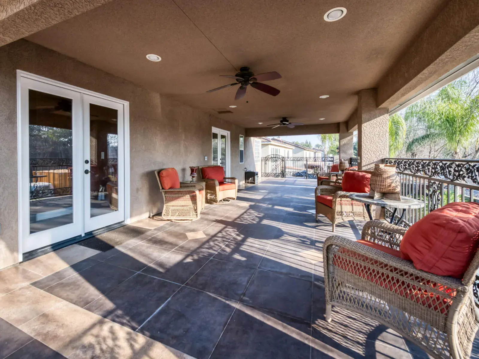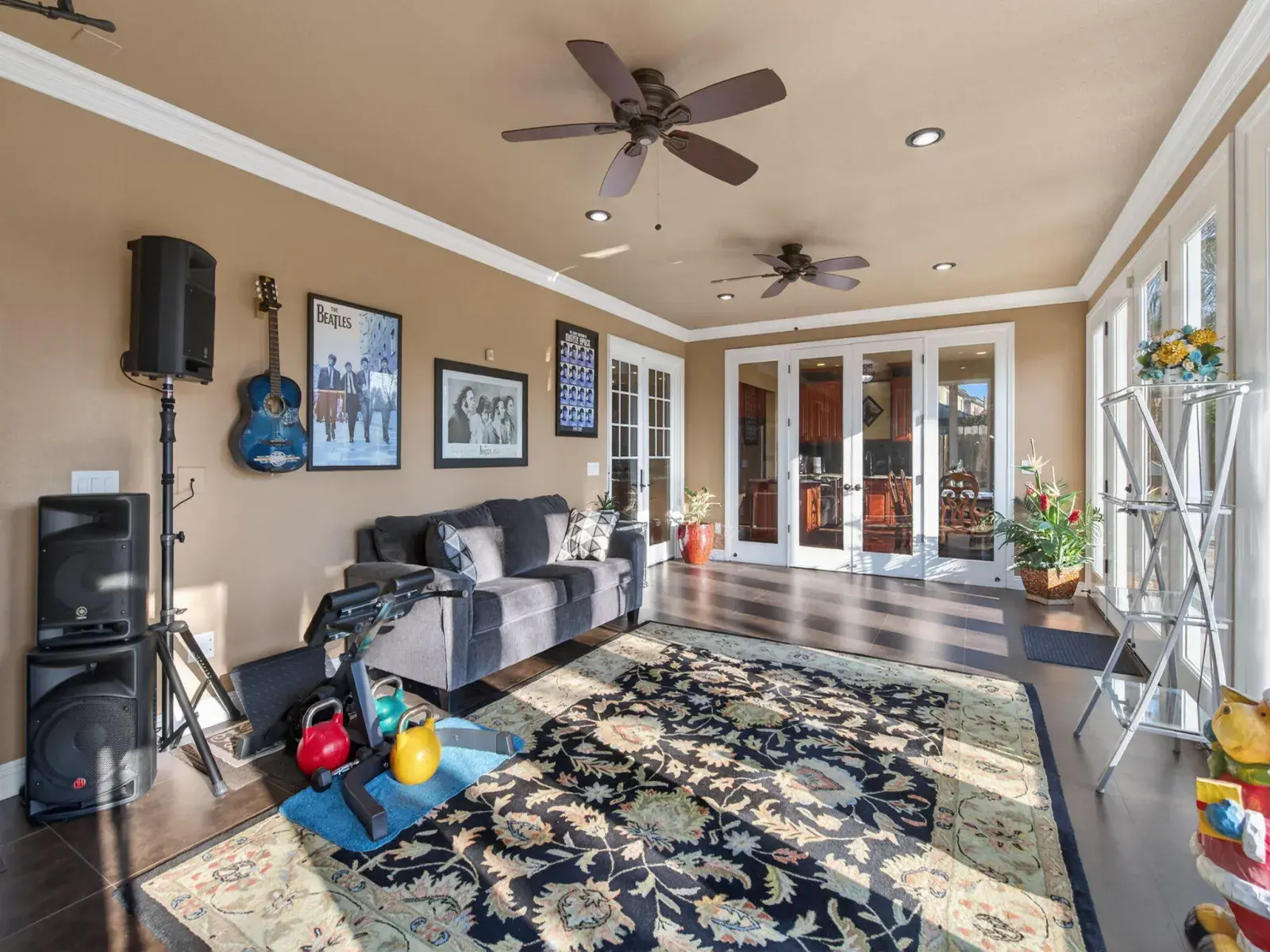 Exceptionally upgraded & meticulously expanded, this custom-caliber residence offers luxury, functionality, & craftsmanship rarely found in a tract setting. This home was transformed by the owners, with a permitted 1,000 sq ft addition, & a complete interior remodel using premium, top-tier materials throughout. Enter through a Brazilian Mahogany front door into a grand foyer w/a regal custom oak staircase, decorative iron detailing, & elegant chandelier. Formal living & dining rooms feature crown molding & refined lighting. The exceptional chef’s kitchen is both stunning & functional, featuring extensive custom cabinetry, a spacious pantry, two gas ranges, dual sink areas, & two islands, one equipped with a built-in microwave & beverage refrigerator. Impressive granite countertops extend throughout, with island slabs that serve as true statements. Indoor gym with specialty flooring & built-in cabinetry may serve as a potential 5th bedroom. Sunroom includes tile flooring, audio wiring, French doors, and separate AC unit. Upstairs includes three bedrooms & laundry room on one wing, & a private primary suite on the other with custom walk-in closet, dual vanities, luxurious shower, jacuzzi tub, and large loft area. Covered upper deck spans the length of the home with 240V hot tub circuit, additional outlets, & custom iron railing. Additional upgrades include electrical, recessed lighting, surround sound, security system, crown molding & low-maintenance yard with courtyard, decorative concrete, block & rod iron fencing. Permitted 1,000 sq ft addition completed with city approvals; buyers are encouraged to verify permits and square footage to their satisfaction. Home has been extensively upgraded and remodeled with quality materials throughout. Flexible-use spaces include indoor gym and sunroom. Covered upper deck includes 240V circuit suitable for future hot tub installation. Pride of ownership shows.