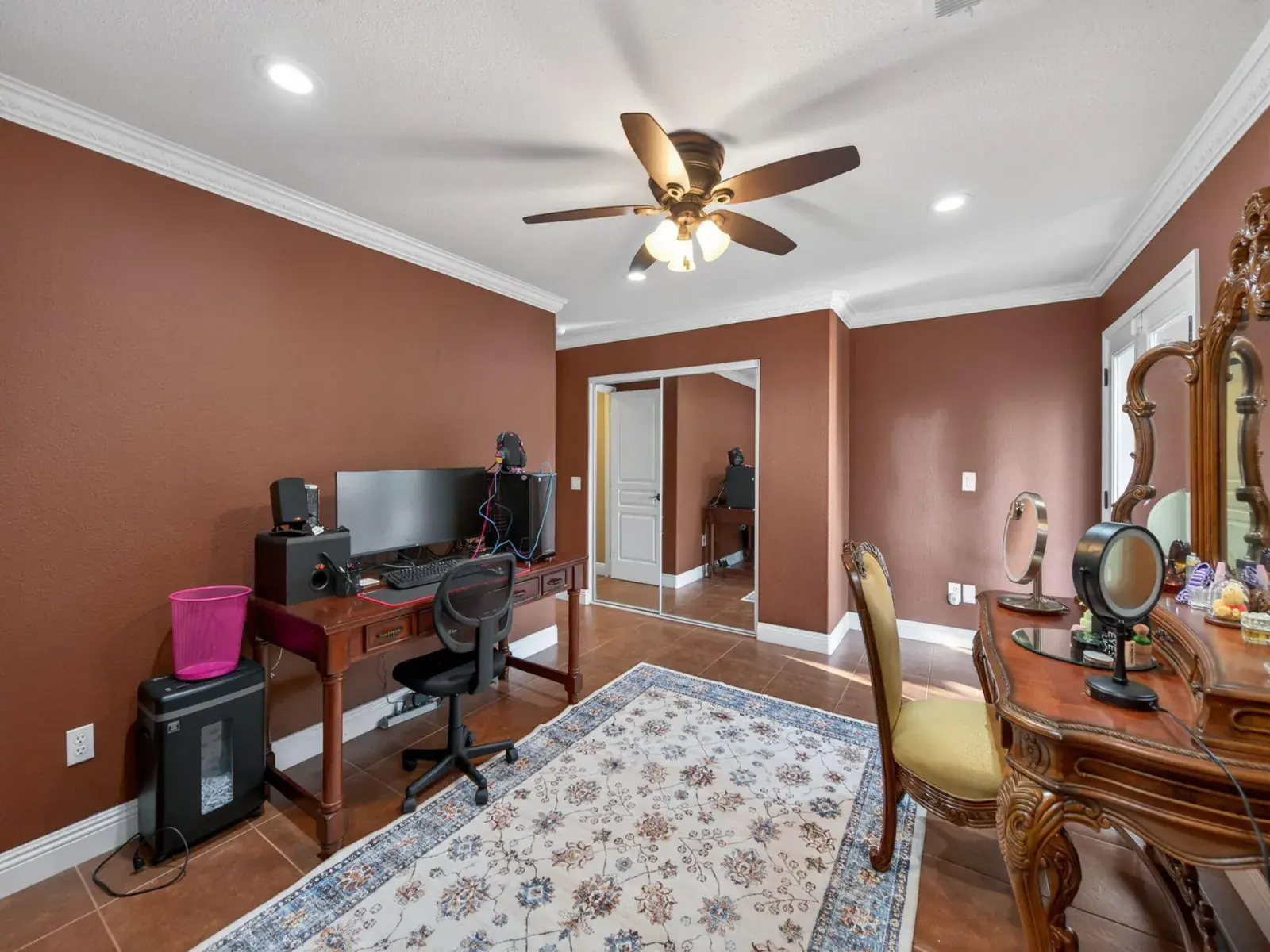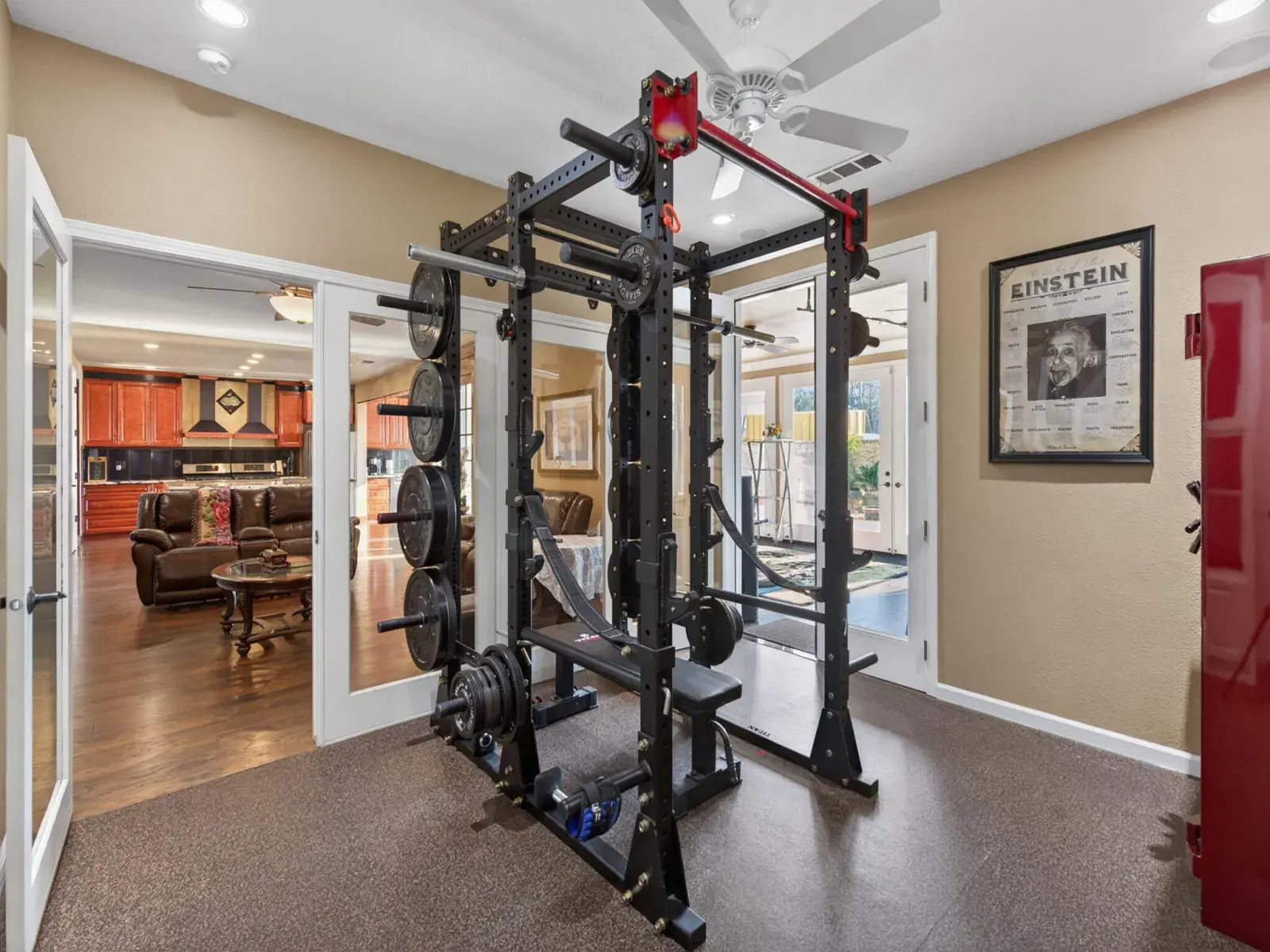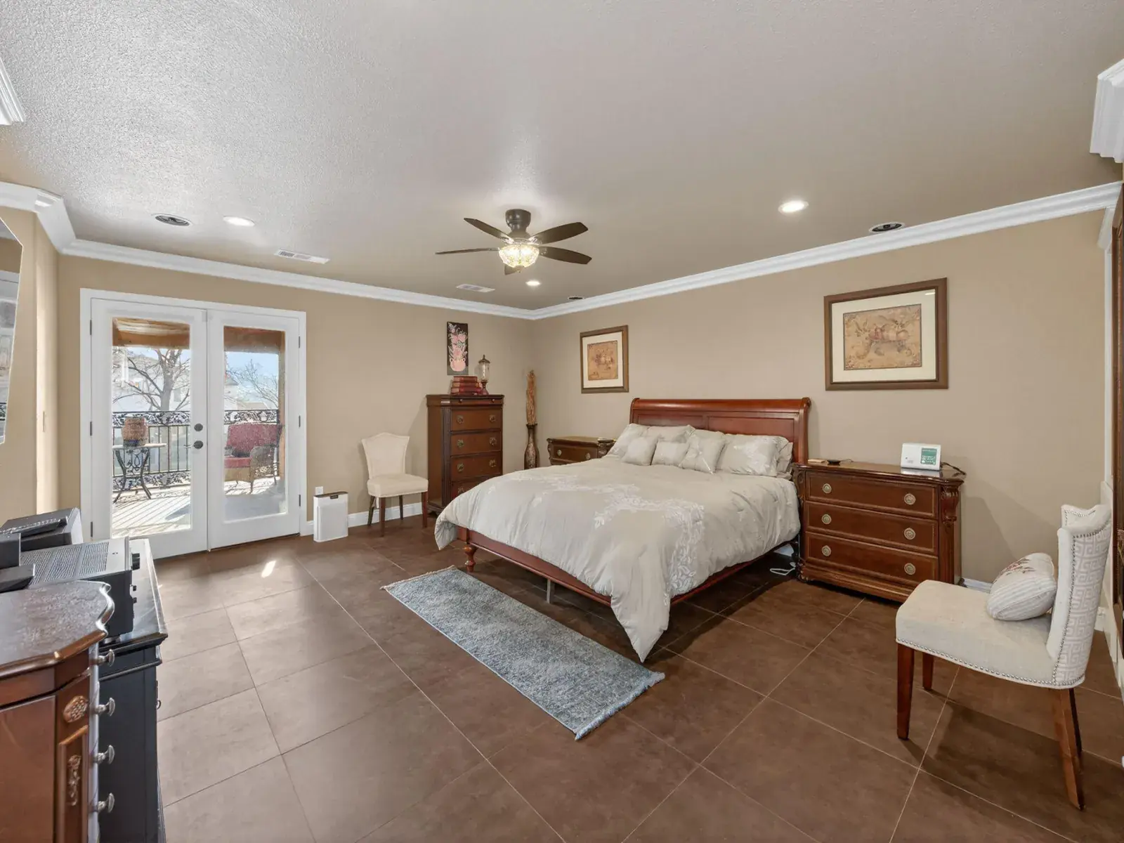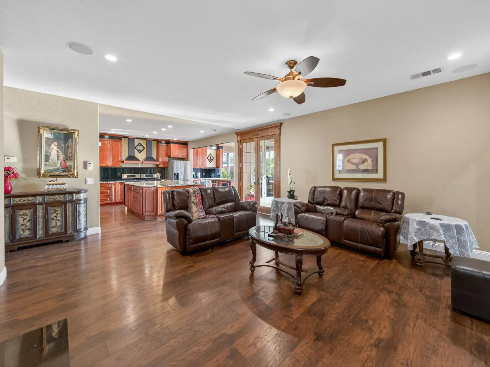 Exceptionally upgraded & meticulously expanded, this custom-caliber residence offers luxury, functionality, & craftsmanship rarely found in a tract setting. This home was transformed by the owners, with a permitted 1,000 sq ft addition, & a complete interior remodel using premium, top-tier materials throughout. Enter through a Brazilian Mahogany front door into a grand foyer w/a regal custom oak staircase, decorative iron detailing, & elegant chandelier. Formal living & dining rooms feature crown molding & refined lighting. The exceptional chef’s kitchen is both stunning & functional, featuring extensive custom cabinetry, a spacious pantry, two gas ranges, dual sink areas, & two islands, one equipped with a built-in microwave & beverage refrigerator. Impressive granite countertops extend throughout, with island slabs that serve as true statements. Indoor gym with specialty flooring & built-in cabinetry may serve as a potential 5th bedroom. Sunroom includes tile flooring, audio wiring, French doors, and separate AC unit. Upstairs includes three bedrooms & laundry room on one wing, & a private primary suite on the other with custom walk-in closet, dual vanities, luxurious shower, jacuzzi tub, and large loft area. Covered upper deck spans the length of the home with 240V hot tub circuit, additional outlets, & custom iron railing. Additional upgrades include electrical, recessed lighting, surround sound, security system, crown molding & low-maintenance yard with courtyard, decorative concrete, block & rod iron fencing. Permitted 1,000 sq ft addition completed with city approvals; buyers are encouraged to verify permits and square footage to their satisfaction. Home has been extensively upgraded and remodeled with quality materials throughout. Flexible-use spaces include indoor gym and sunroom. Covered upper deck includes 240V circuit suitable for future hot tub installation. Pride of ownership shows.