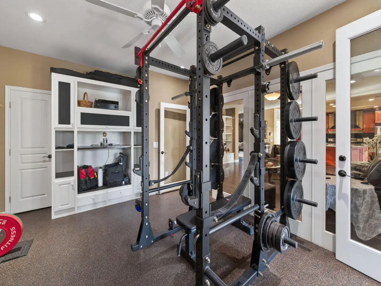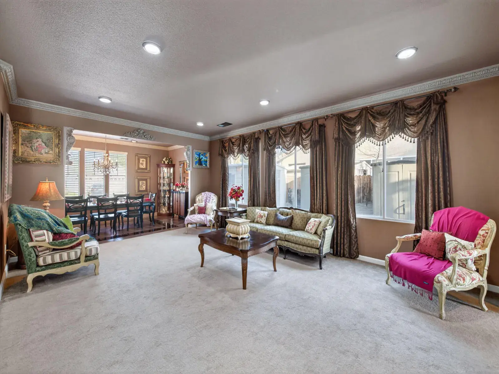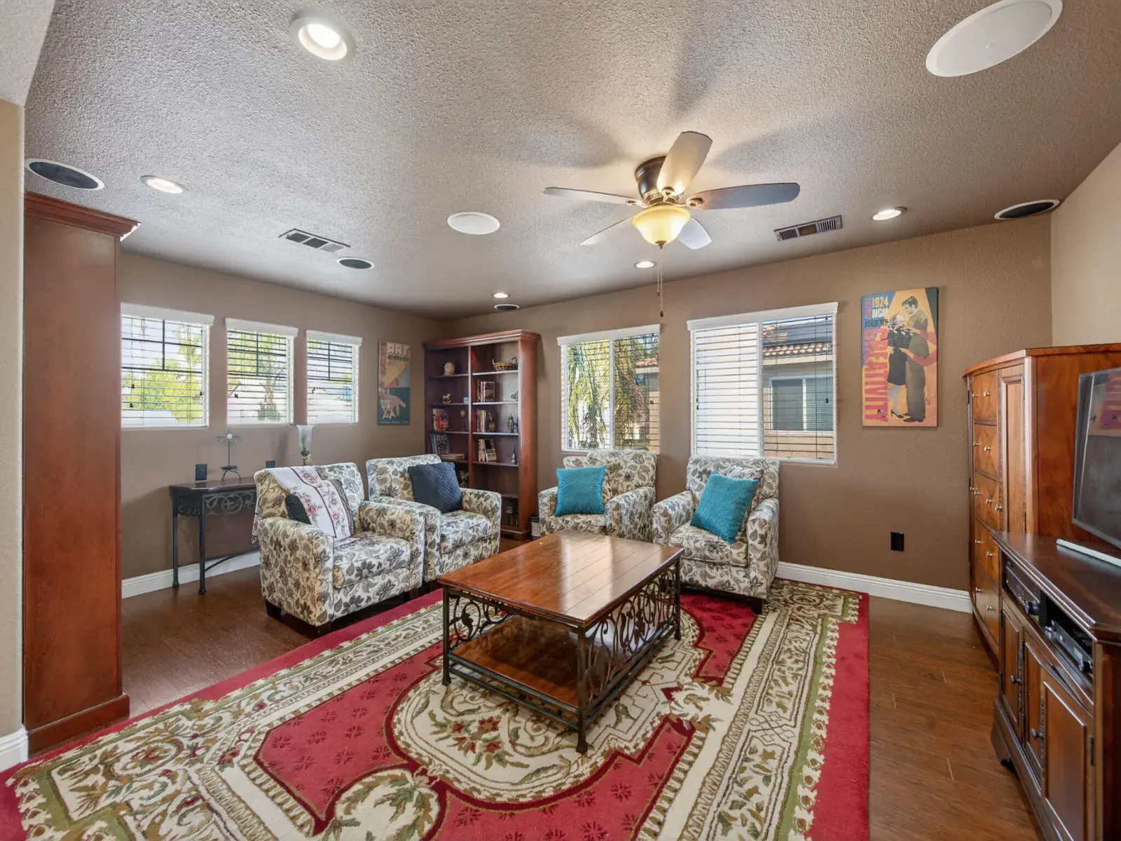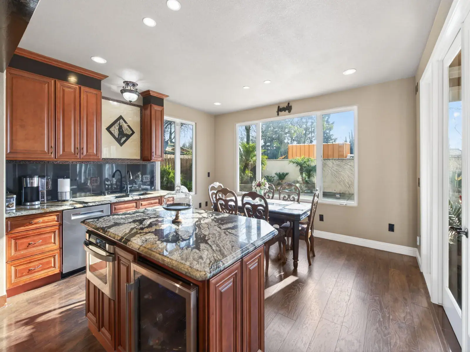 Exceptionally upgraded & meticulously expanded, this custom-caliber residence offers luxury, functionality, & craftsmanship rarely found in a tract setting. This home was transformed by the owners, with a permitted 1,000 sq ft addition, & a complete interior remodel using premium, top-tier materials throughout. Enter through a Brazilian Mahogany front door into a grand foyer w/a regal custom oak staircase, decorative iron detailing, & elegant chandelier. Formal living & dining rooms feature crown molding & refined lighting. The exceptional chef’s kitchen is both stunning & functional, featuring extensive custom cabinetry, a spacious pantry, two gas ranges, dual sink areas, & two islands, one equipped with a built-in microwave & beverage refrigerator. Impressive granite countertops extend throughout, with island slabs that serve as true statements. Indoor gym with specialty flooring & built-in cabinetry may serve as a potential 5th bedroom. Sunroom includes tile flooring, audio wiring, French doors, and separate AC unit. Upstairs includes three bedrooms & laundry room on one wing, & a private primary suite on the other with custom walk-in closet, dual vanities, luxurious shower, jacuzzi tub, and large loft area. Covered upper deck spans the length of the home with 240V hot tub circuit, additional outlets, & custom iron railing. Additional upgrades include electrical, recessed lighting, surround sound, security system, crown molding & low-maintenance yard with courtyard, decorative concrete, block & rod iron fencing. Permitted 1,000 sq ft addition completed with city approvals; buyers are encouraged to verify permits and square footage to their satisfaction. Home has been extensively upgraded and remodeled with quality materials throughout. Flexible-use spaces include indoor gym and sunroom. Covered upper deck includes 240V circuit suitable for future hot tub installation. Pride of ownership shows.