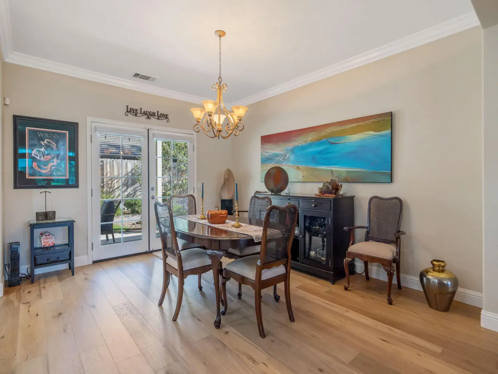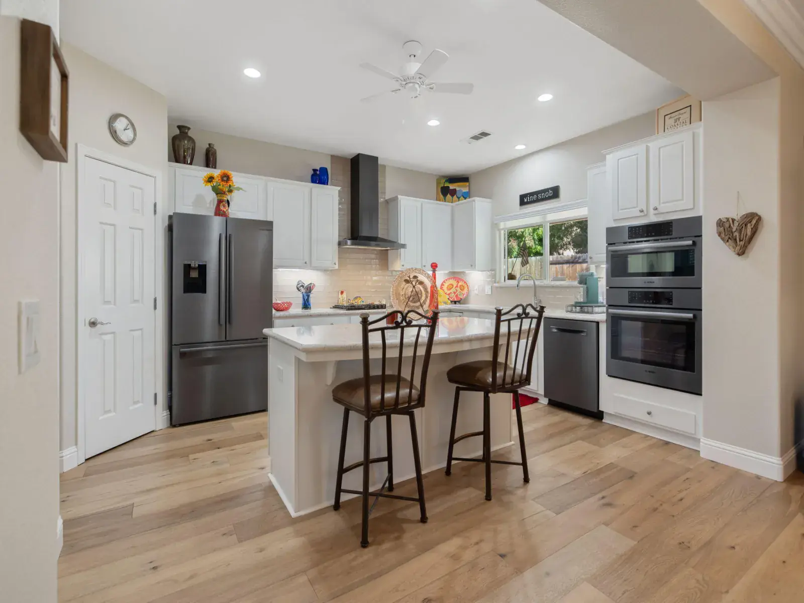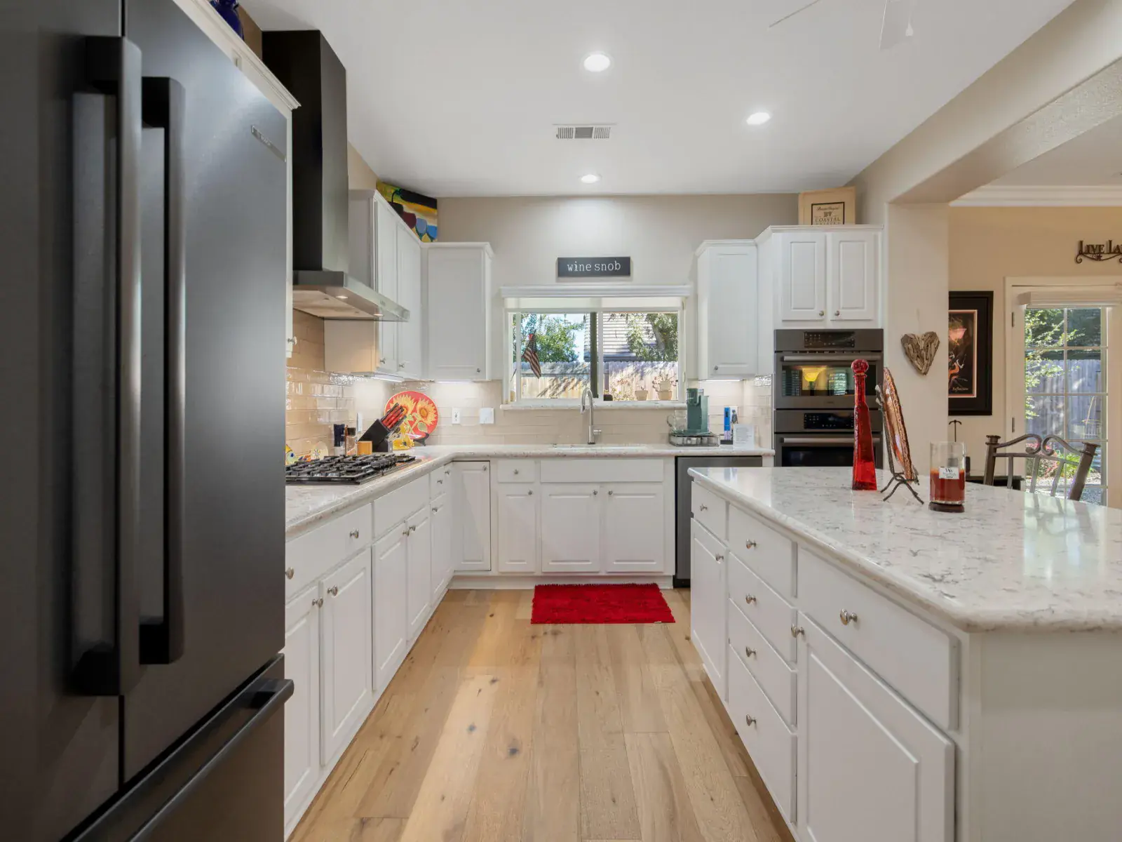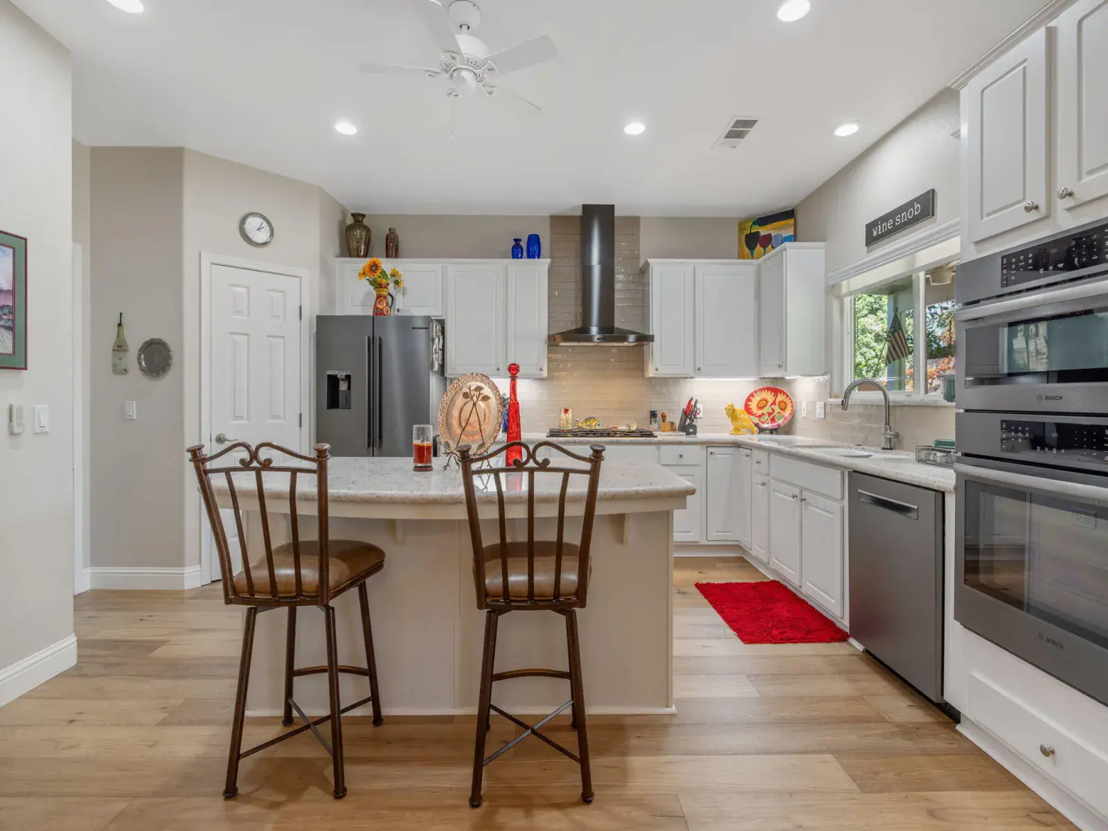 The newly remodeled kitchen is both functional and stylish, featuring crisp white cabinetry with roll out shelving, quartz counter tops, High-End Bosch appliances with commercial grade hood, double ovens, and a center island perfect for casual dining or entertaining. Adjacent dining and living areas flow seamlessly to the outdoor patio, making this home ideal for gatherings.