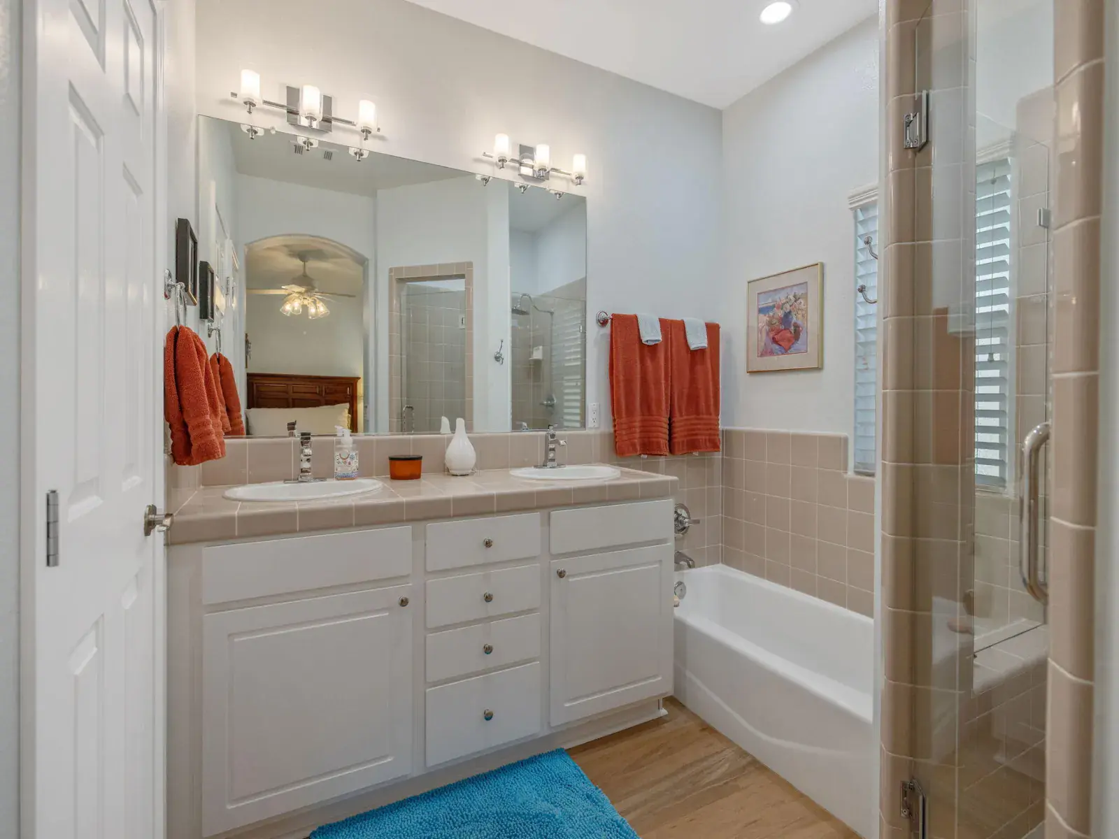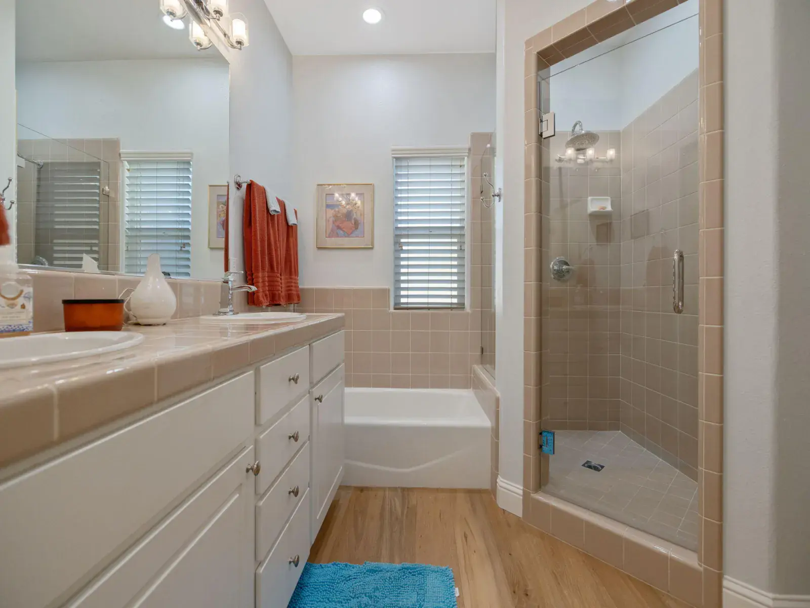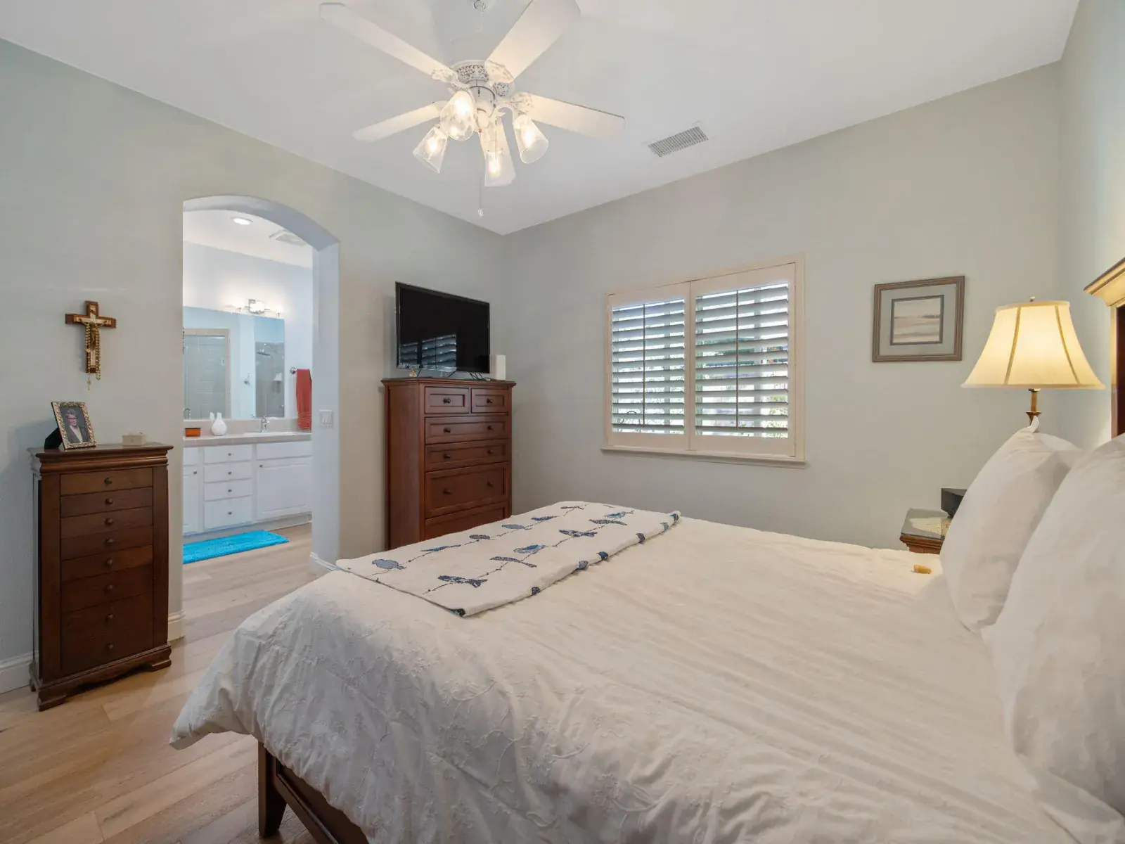 The spacious primary suite provides a serene retreat with a walk-in closet, tub, separate shower, and dual vanities. Two additional bedrooms offer flexibility for guests, a home office, or creative space.