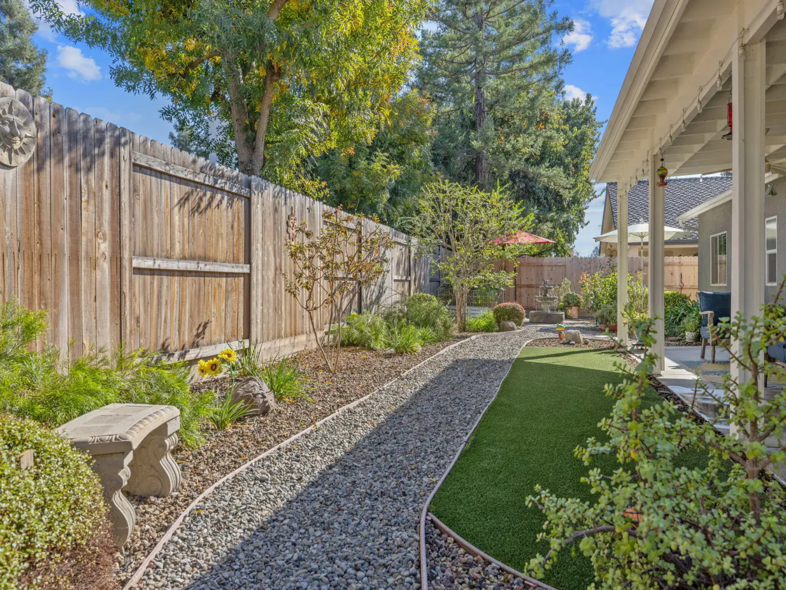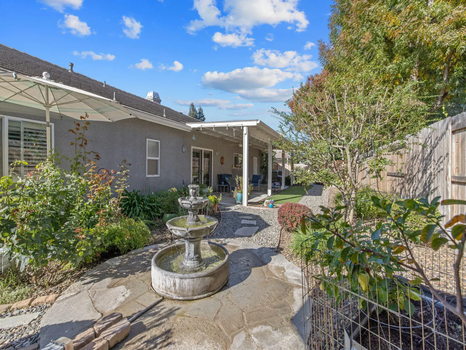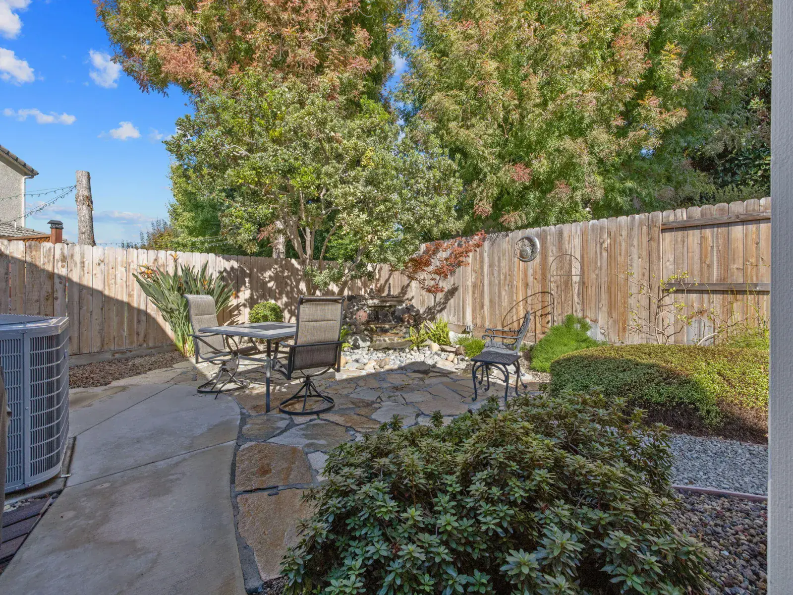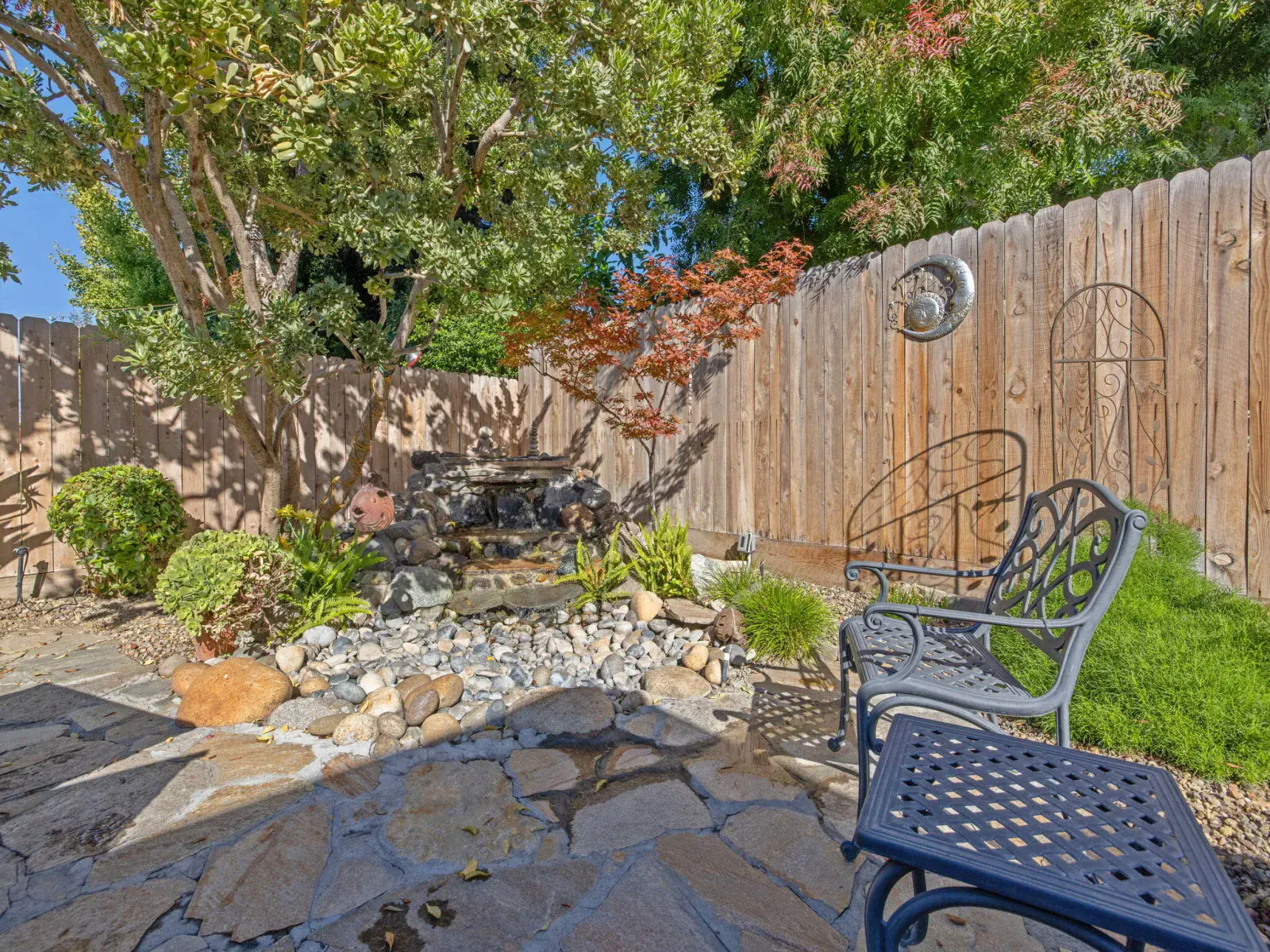 Step outside to your own private oasis — the backyard features beautiful low-maintenance landscaping, custom decorative security gates, a tranquil fountain and waterfall, and multiple seating areas perfect for morning coffee or evening relaxation.